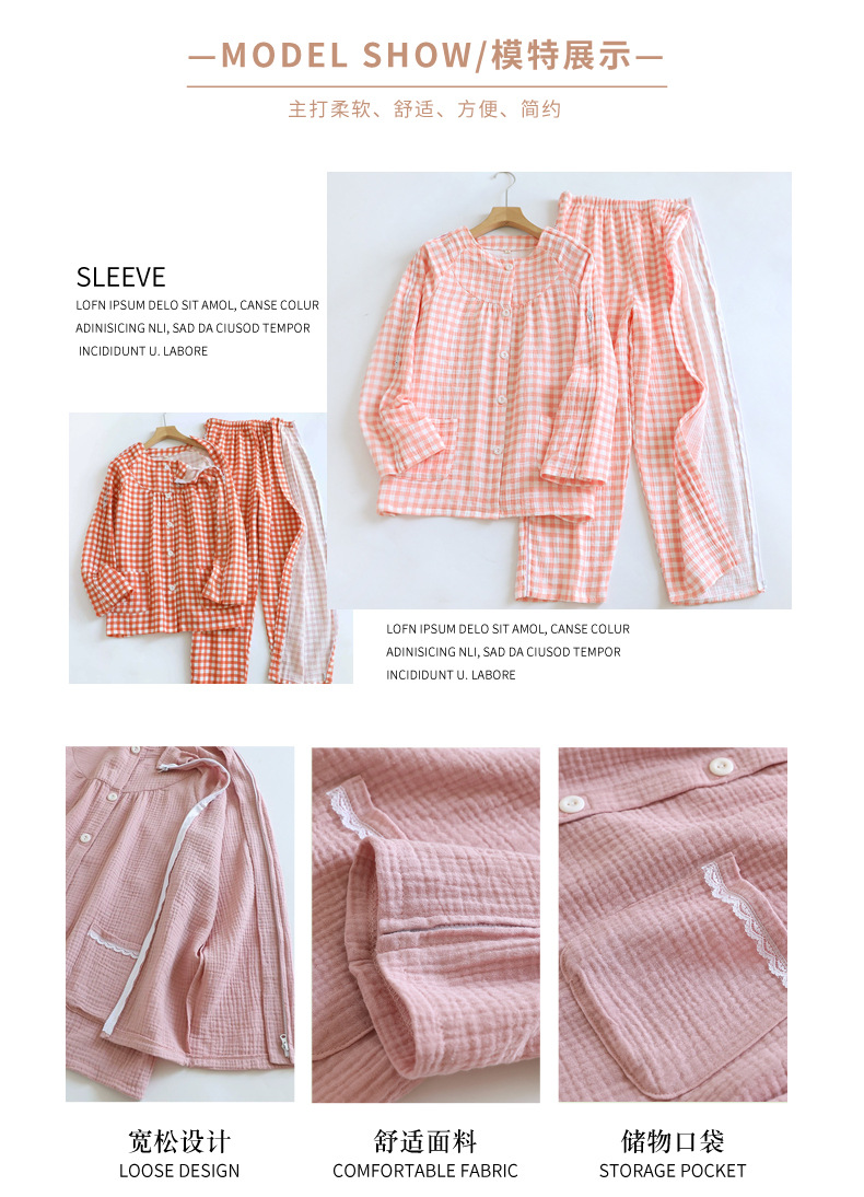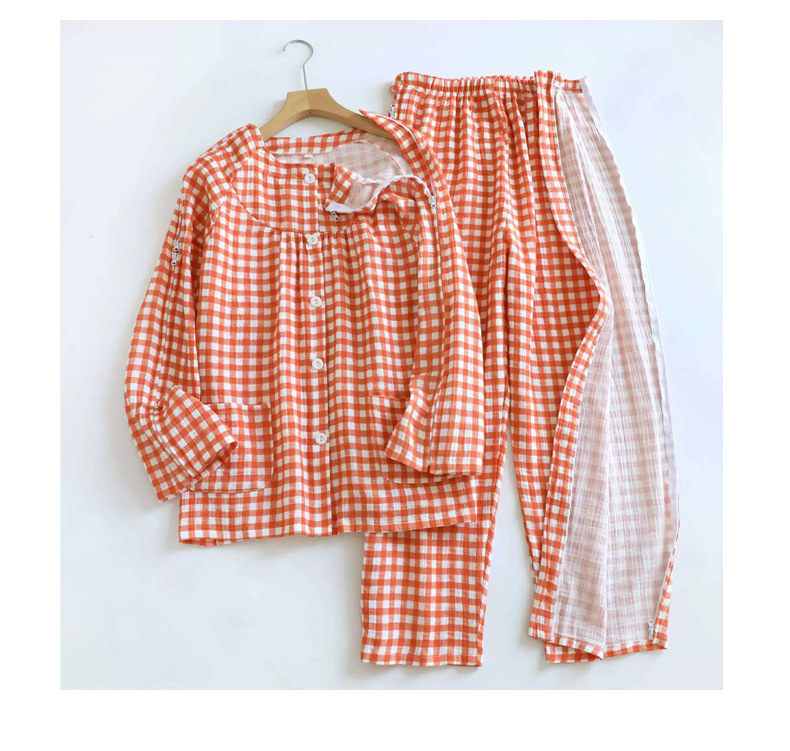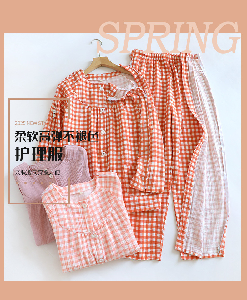 여성용 주황색 체크무늬 거즈 간호복 얇은 긴팔 세트