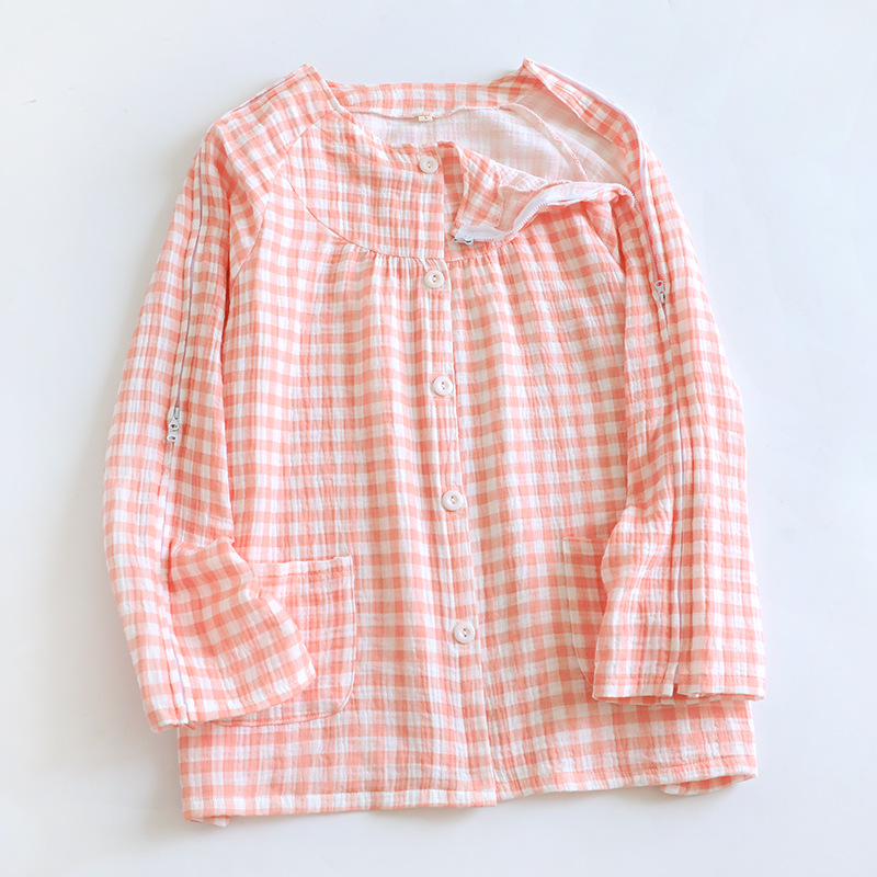 여성용 라이트 핑크 체크무늬 거즈 얇은 간호복 긴팔