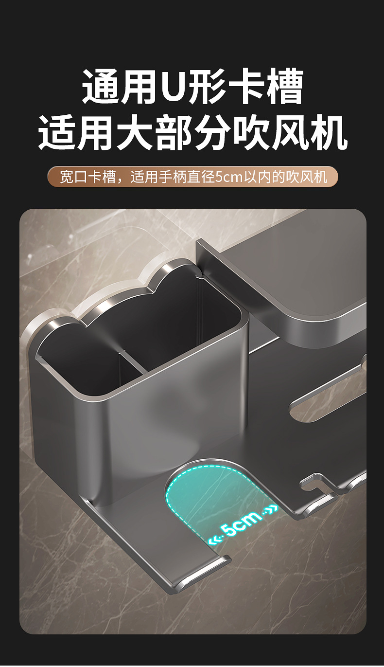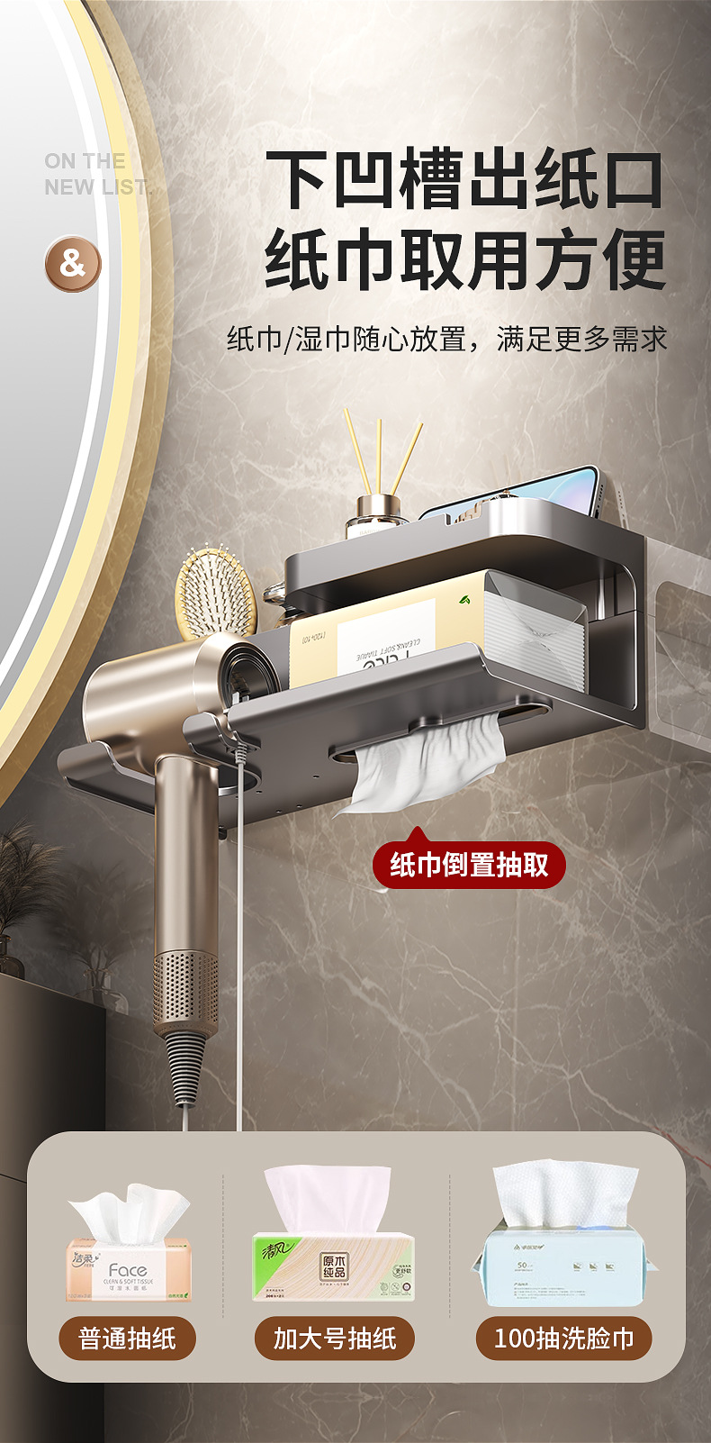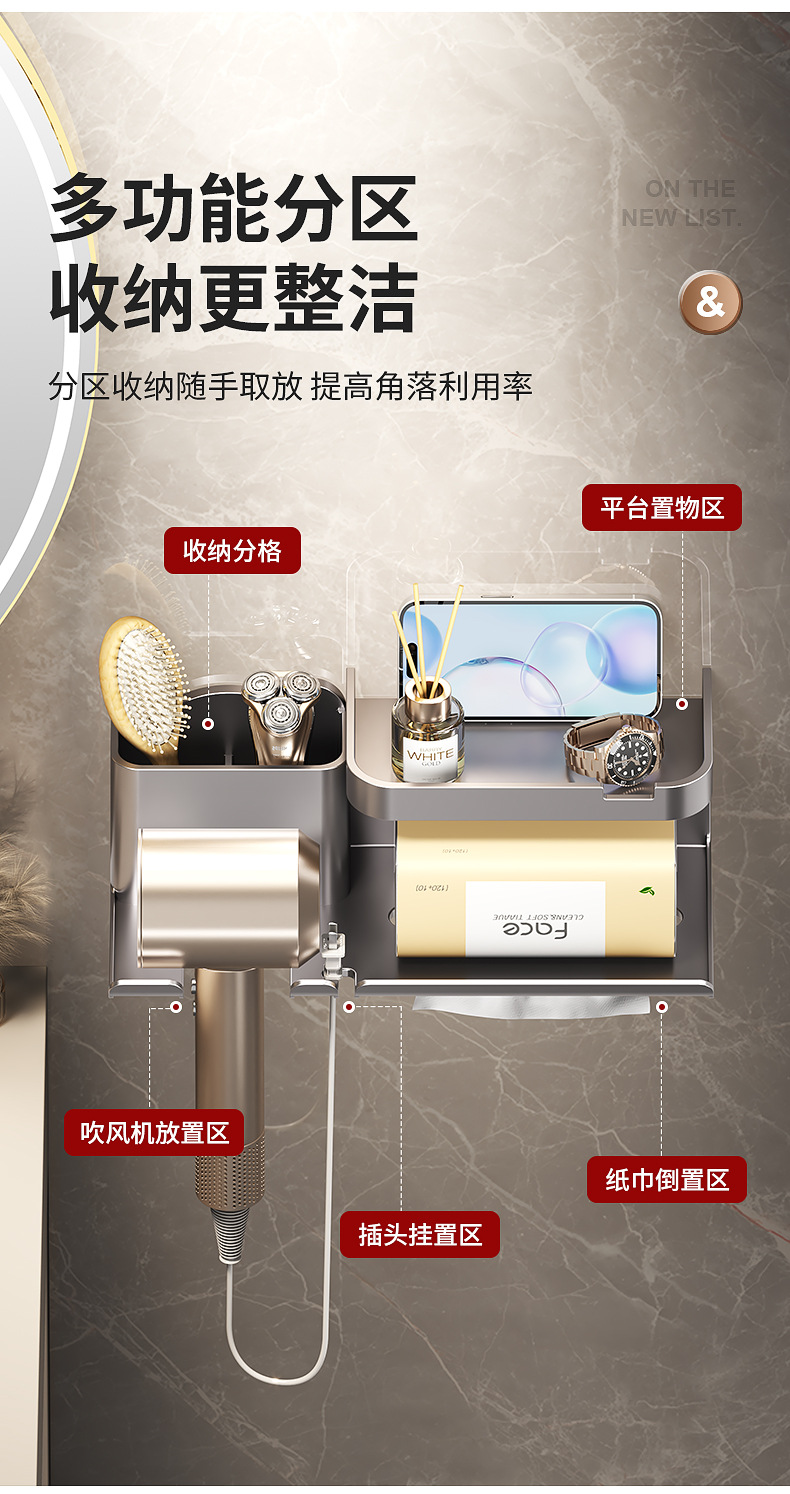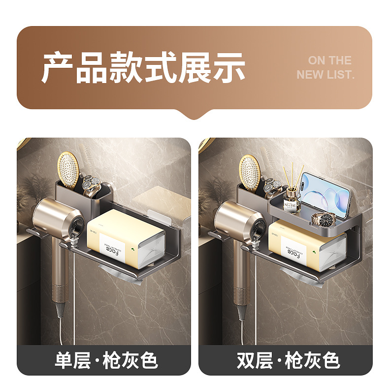 욕실 헤어드라이어 수납선반, 펀치프리 벽걸이형 일체형 헤어드라이어 티슈, 욕실 다기능 수납선반