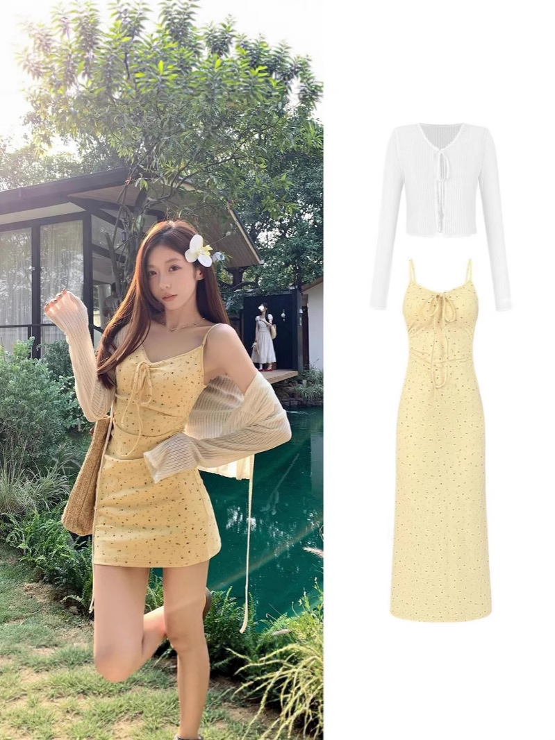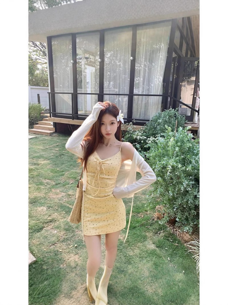 노란색 나비넥타이 꽃무늬 서스펜더 드레스, 여름 시크하고 아름다운 해변 휴가 스타일 허리끈 비치 드레스