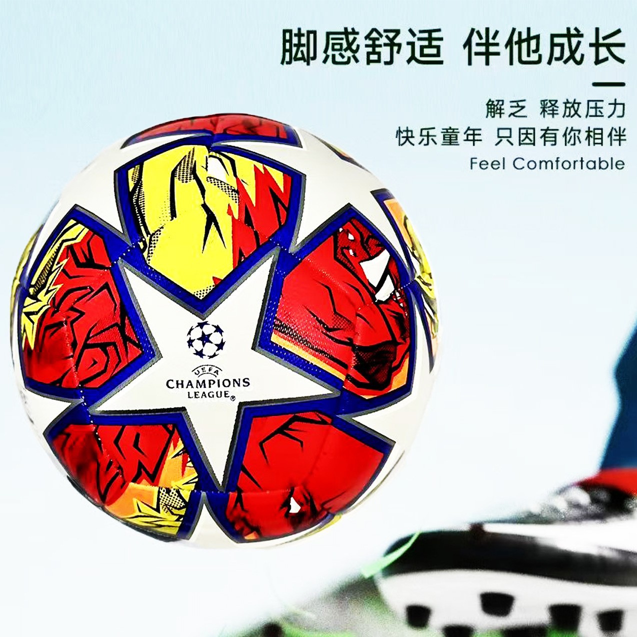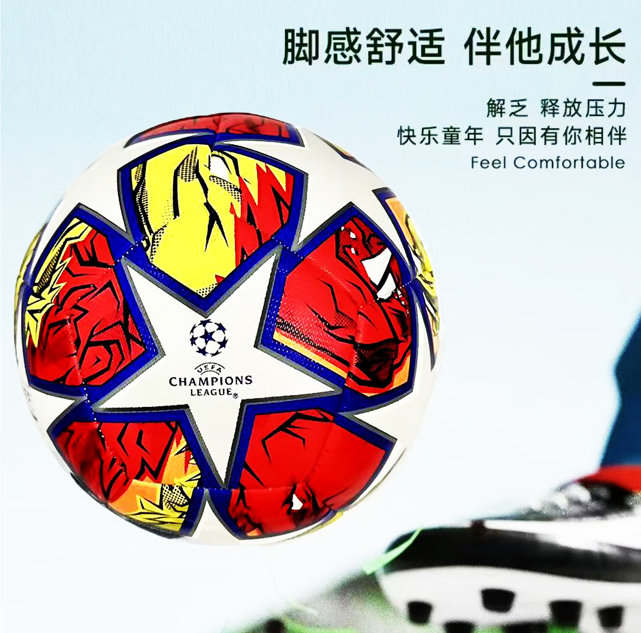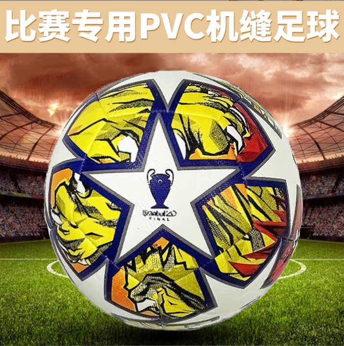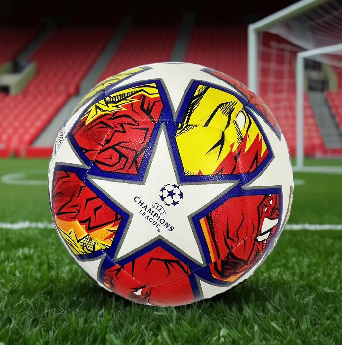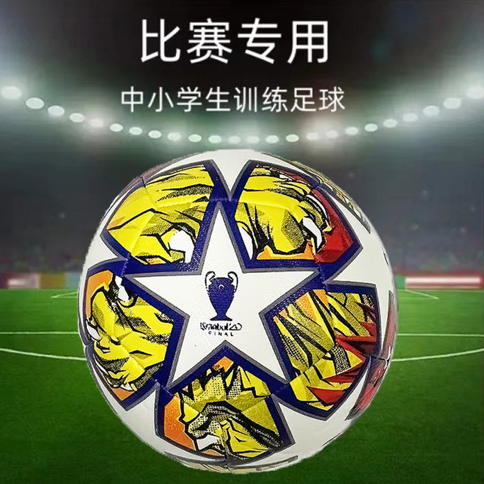 빨간색과 노란색 UEFA 챔피언스 리그 축구 No. 5 기계 스티치 가죽 원활한 공장 도매 대외 무역 내마모성 두꺼운 버전