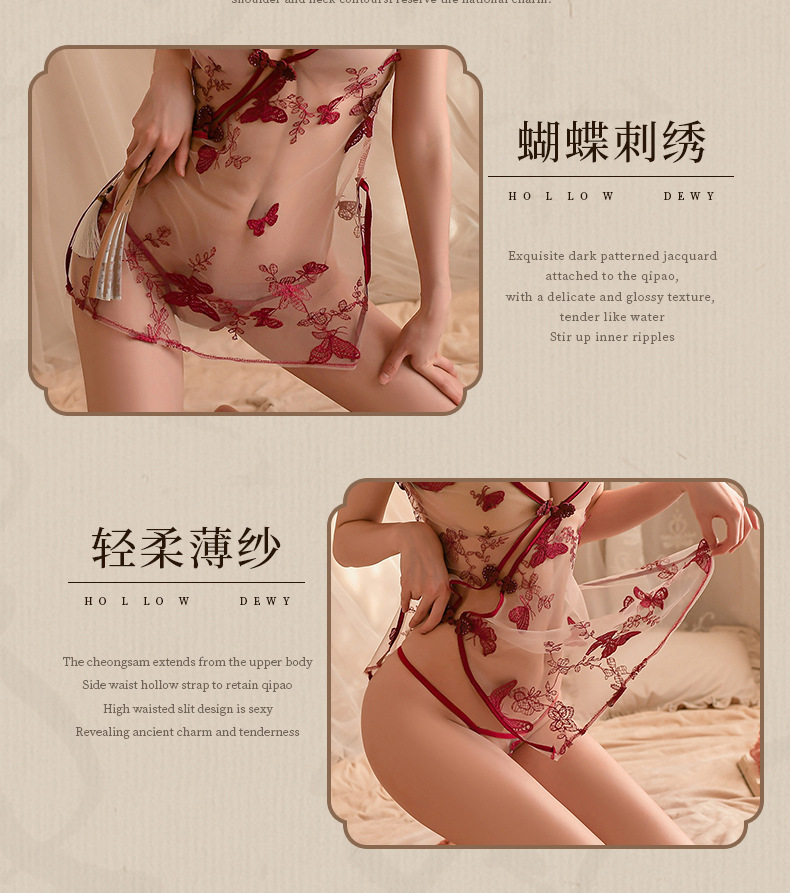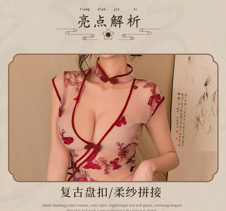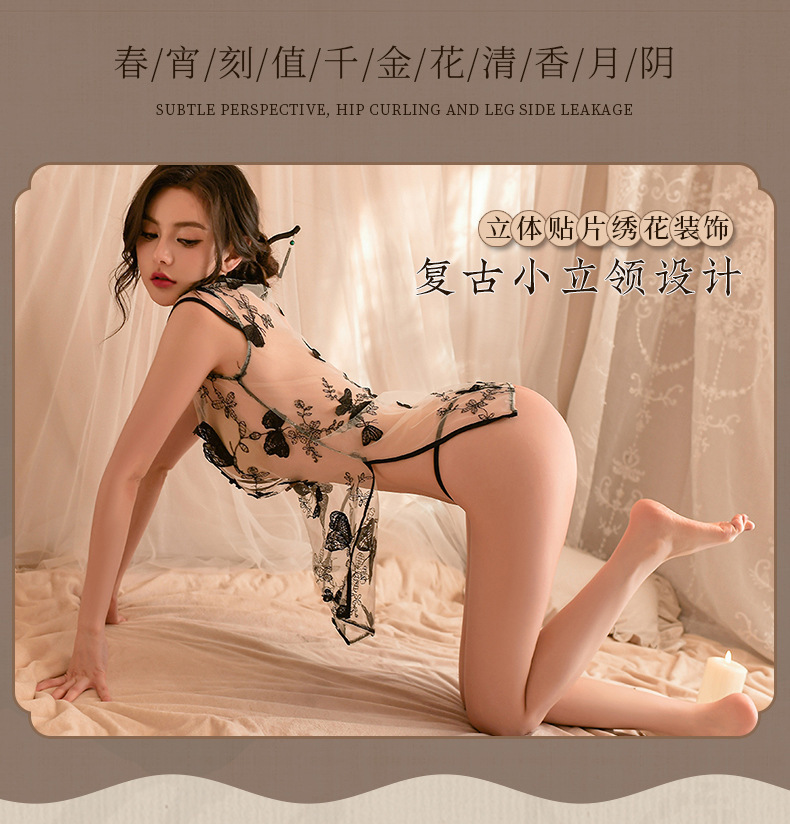 섹시한 속옷, 섹시한 유니폼, 시스루 중공 섹시한 잠옷, 여성 여름 나비 자수 순수한 욕망 치파오 유니폼 유혹
