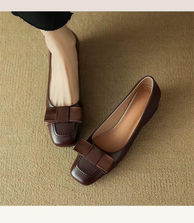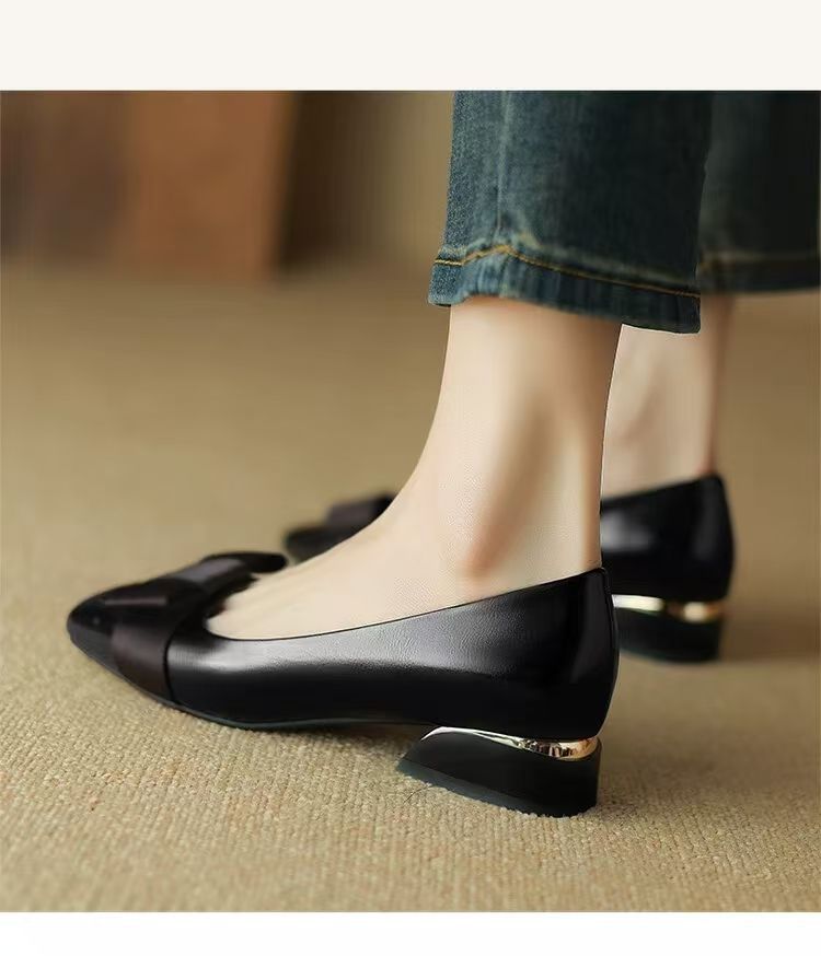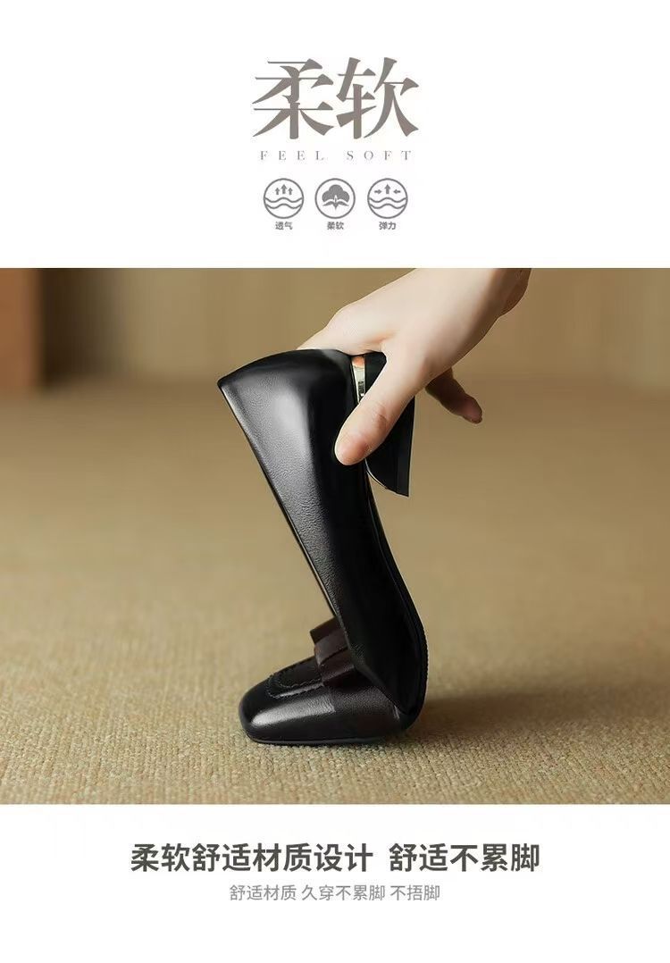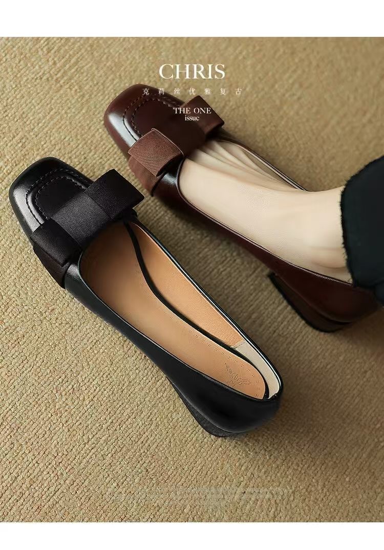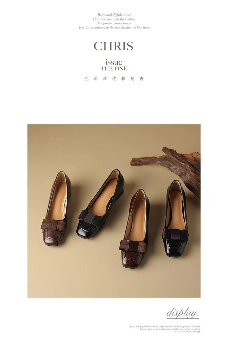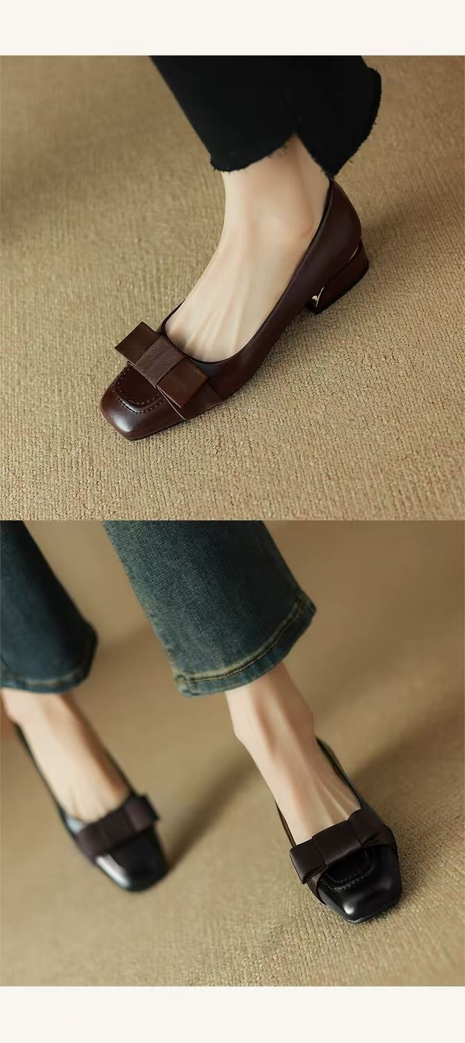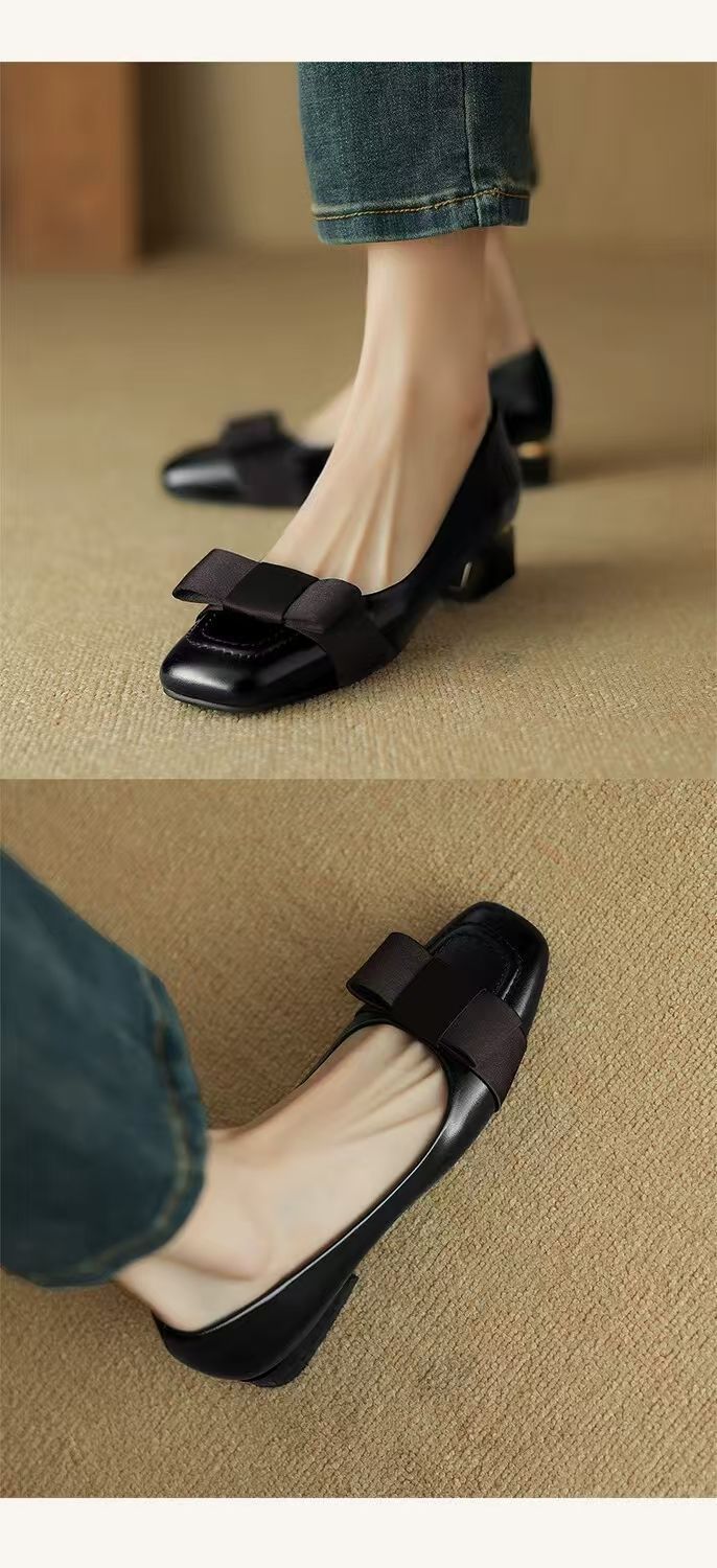여성을위한 프랑스 스타일 컬러 블록 하이힐 2024 봄과 가을 새로운 스타일 가죽 두꺼운 굽 보우 레트로 미드 힐 신발