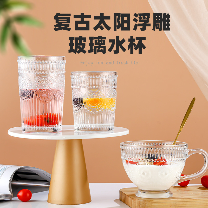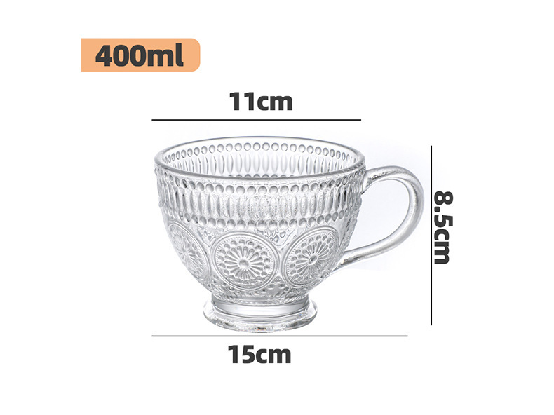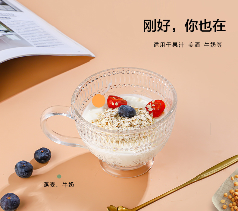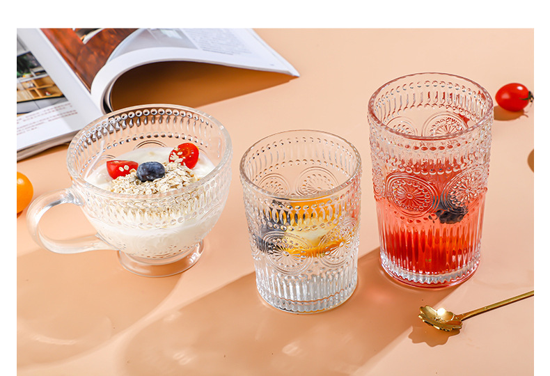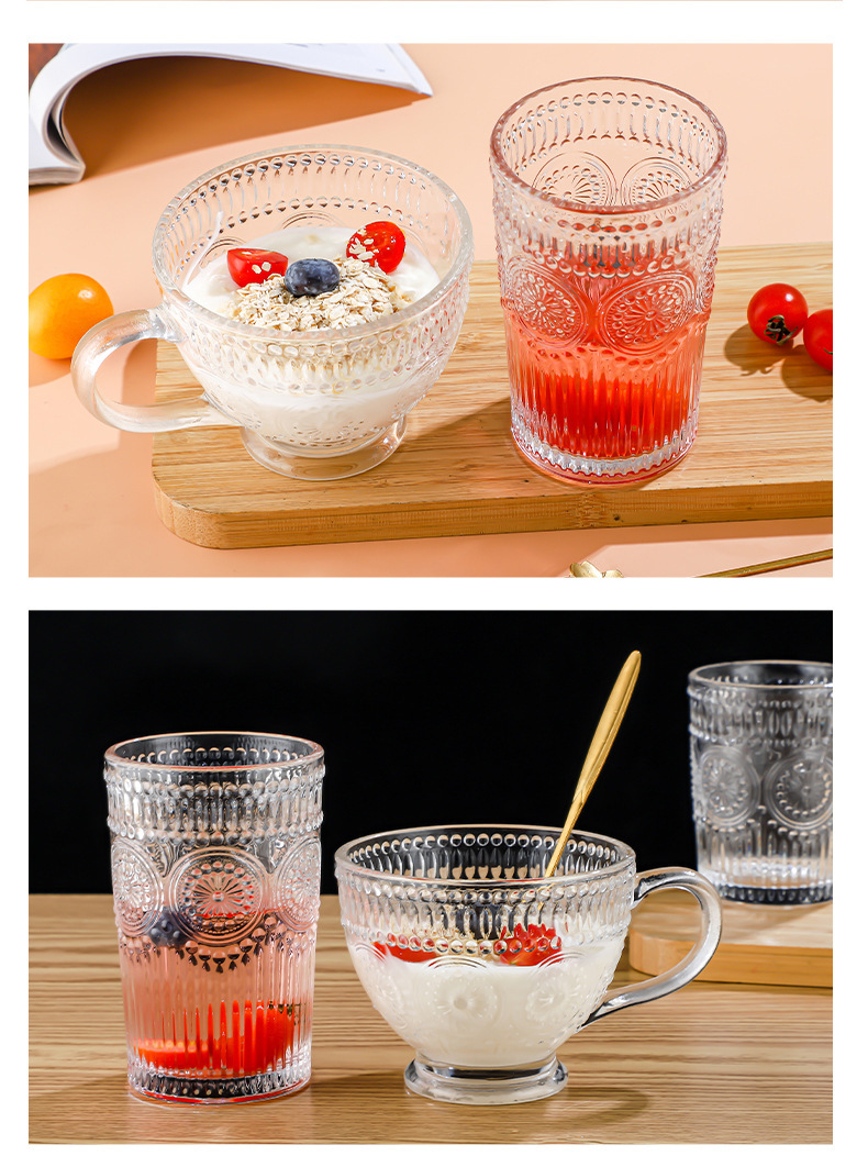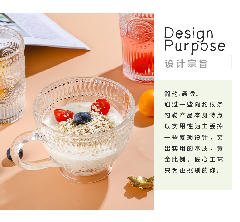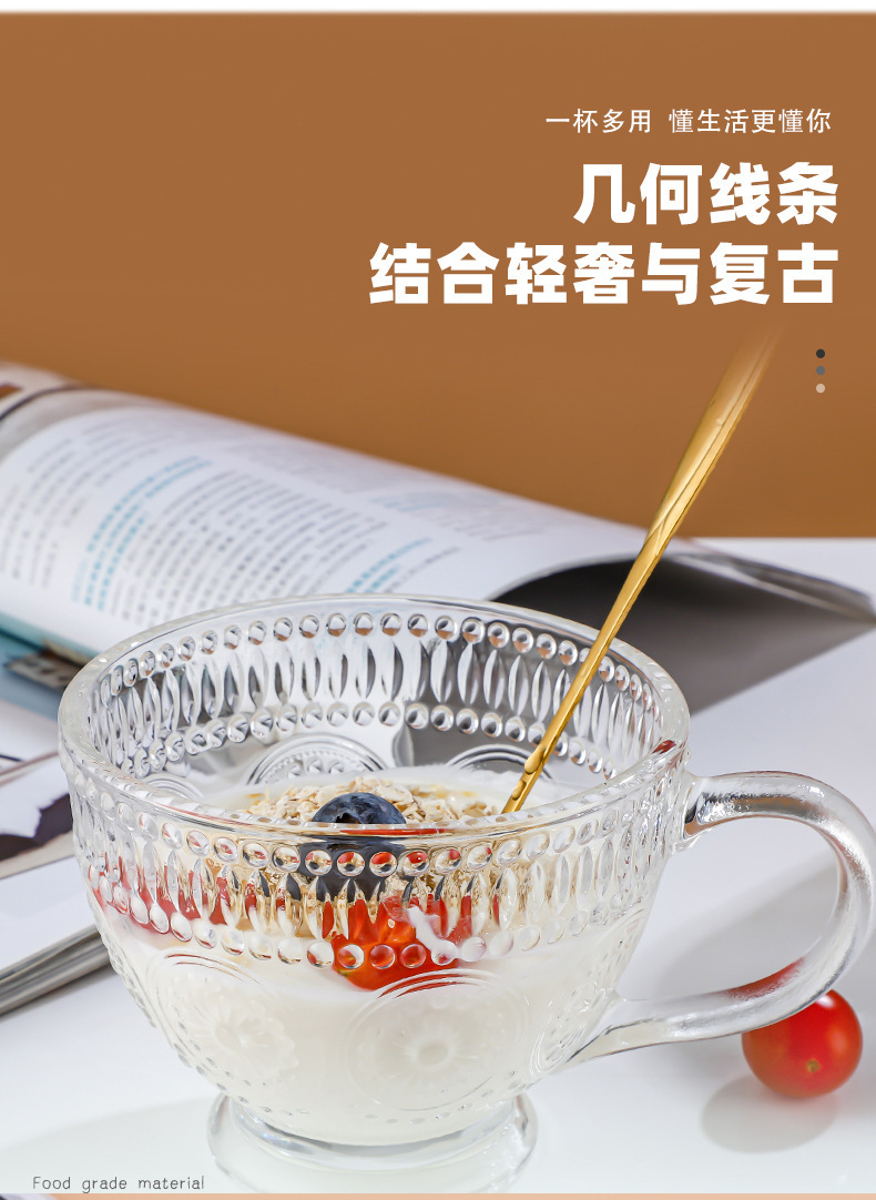 양각 해바라기 아침 식사 그릇 고급스러운 유리 컵 손잡이가있는 대용량 요구르트 그릇 가정용 시리얼 그릇