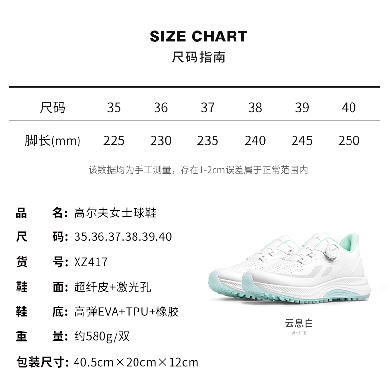| 包装尺寸 | 40.5cmx20cmx12cm | 重 量 | 约580g/双 |