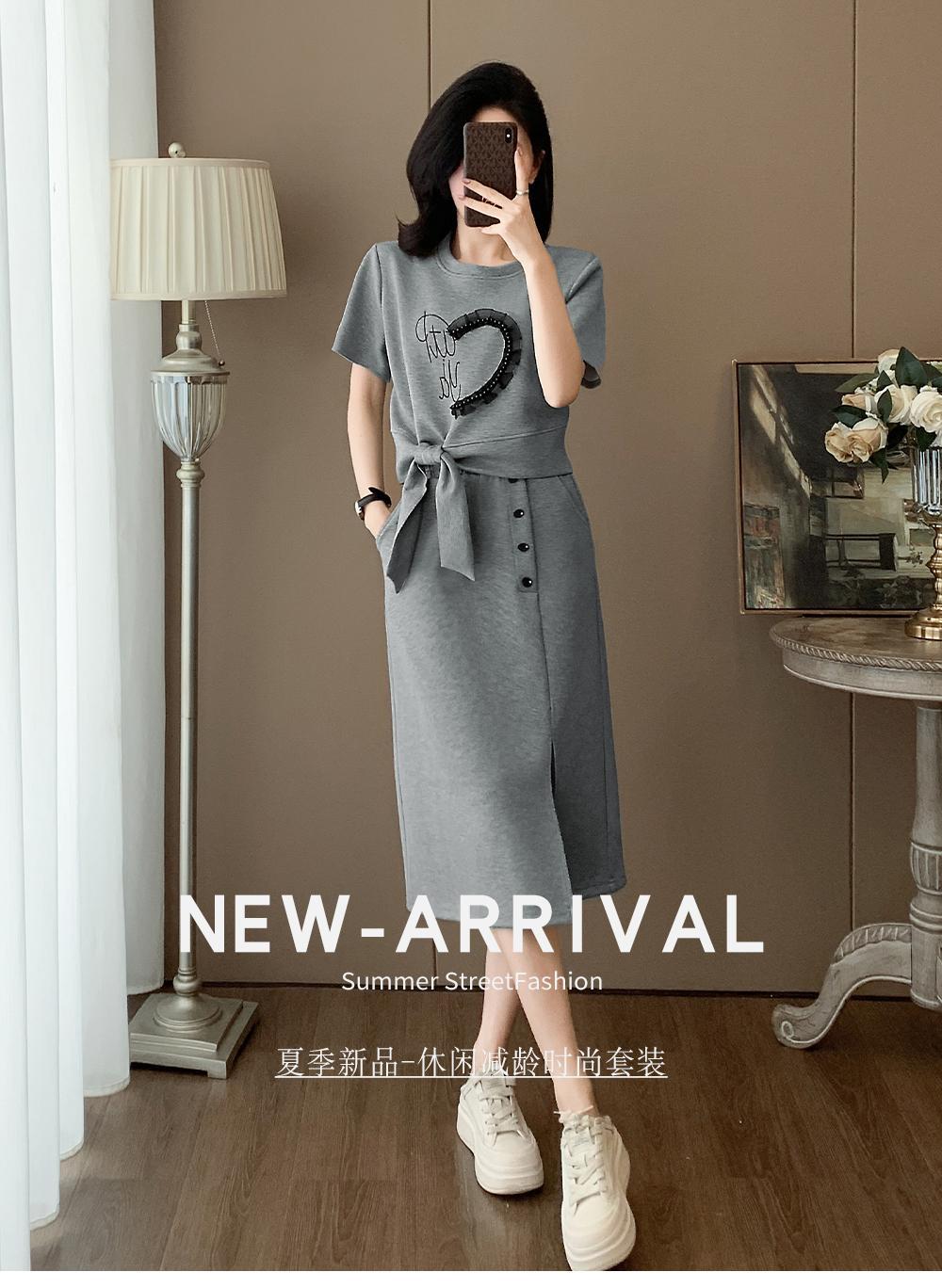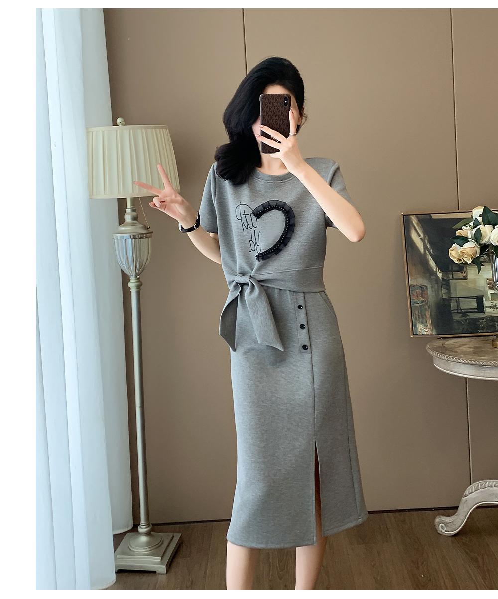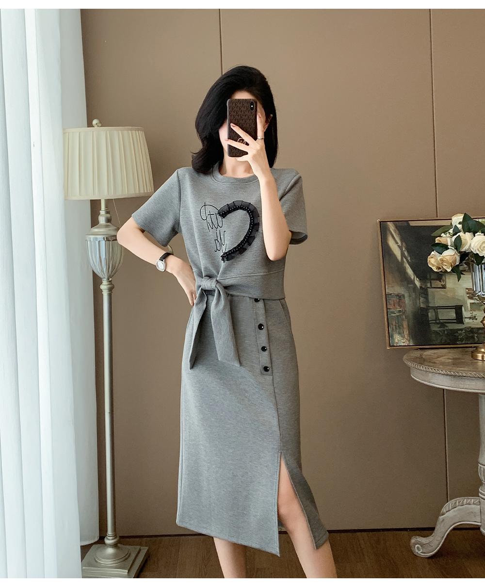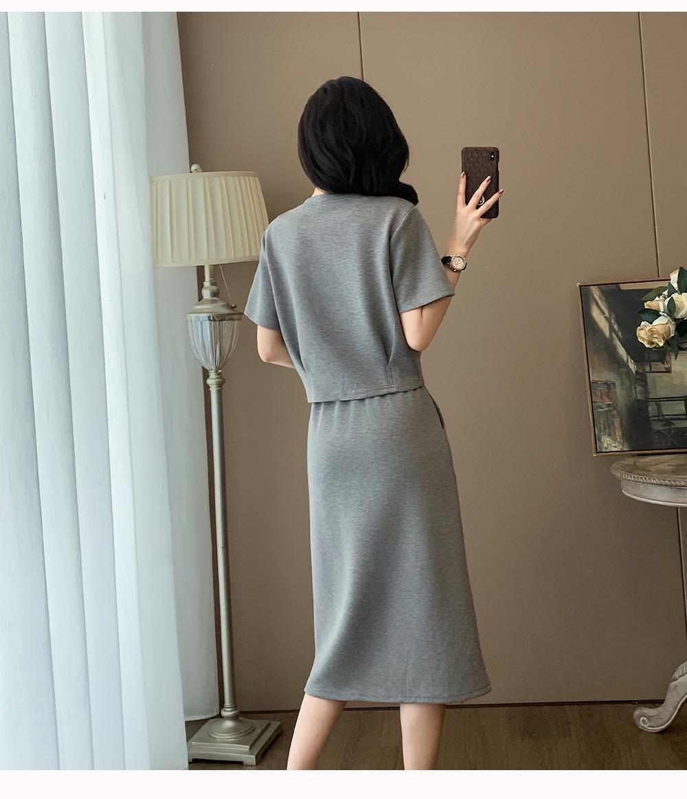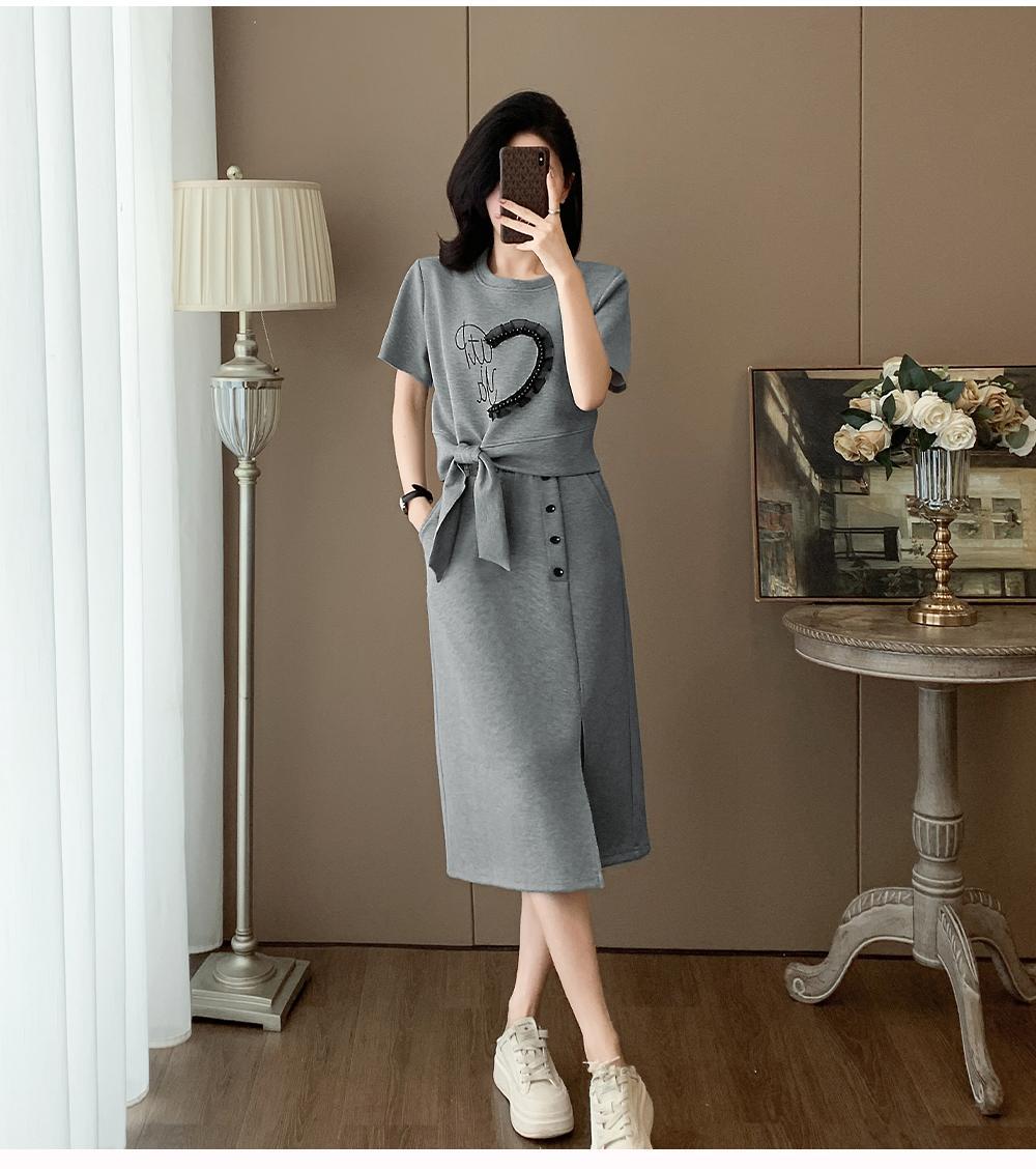 하이 엔드 센스 그레이 캐주얼 원피스 2025 년 여름 새로운 스포츠 스타일 반팔 티셔츠 반쪽 길이 스커트 투피스 세트