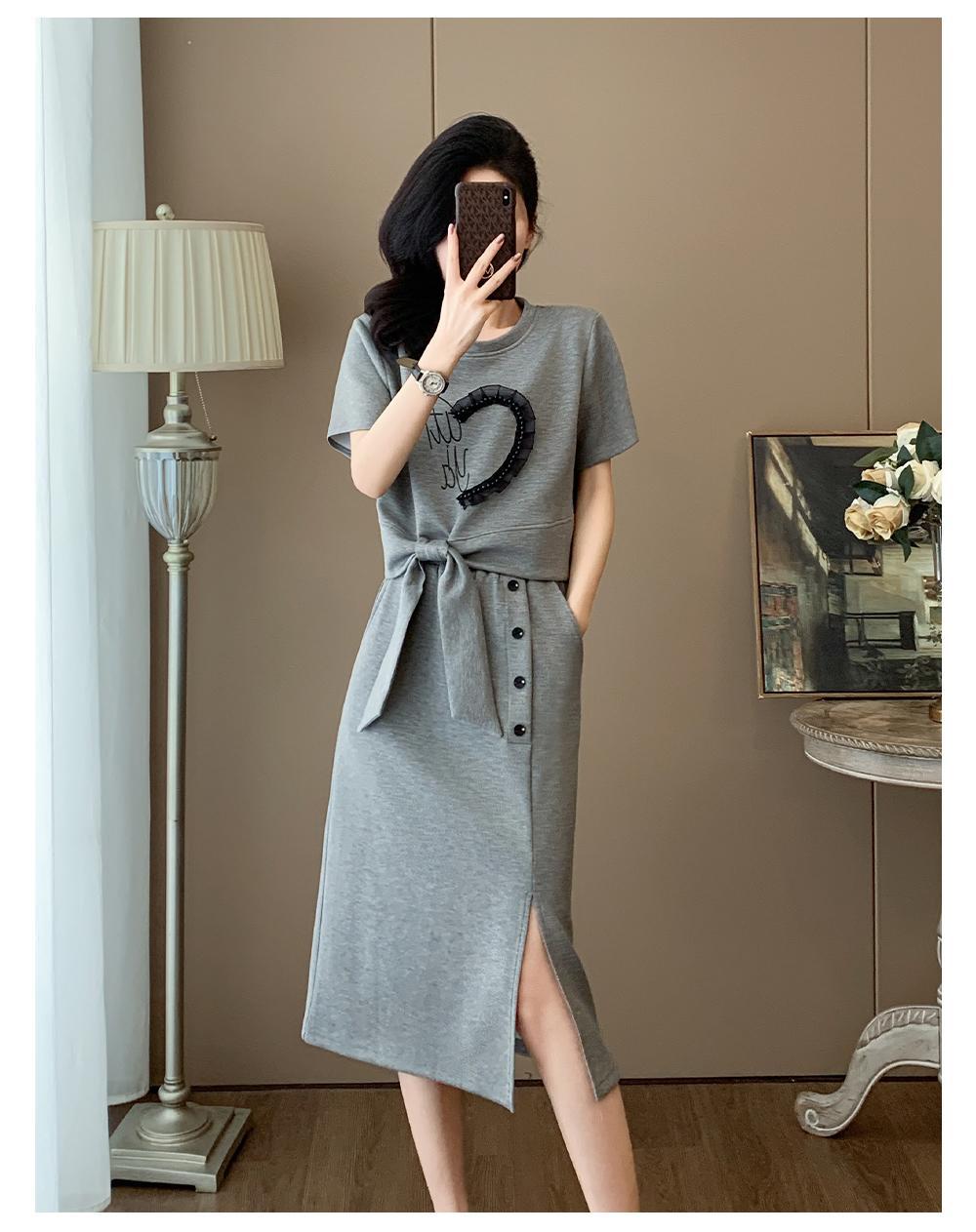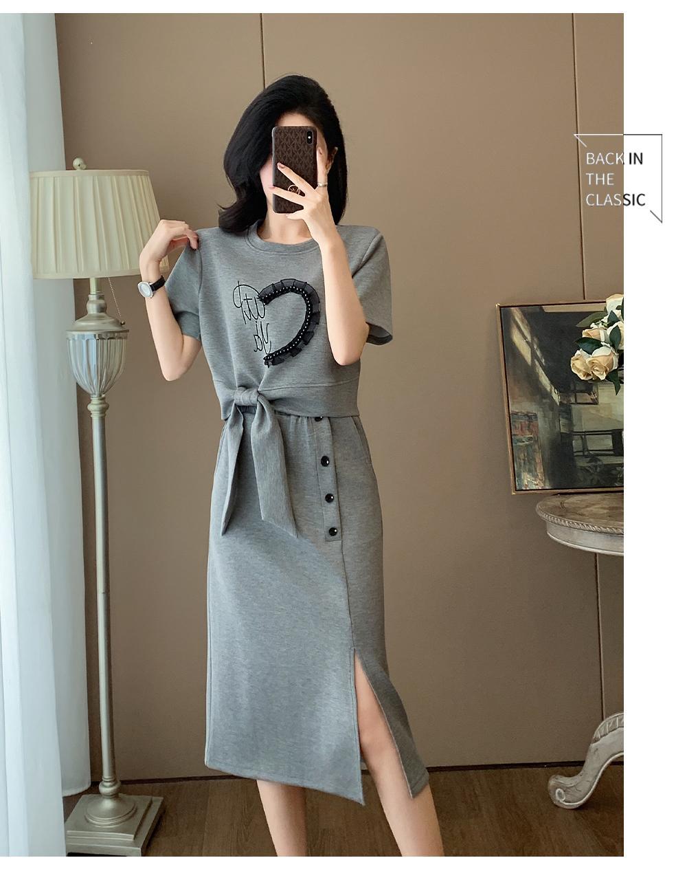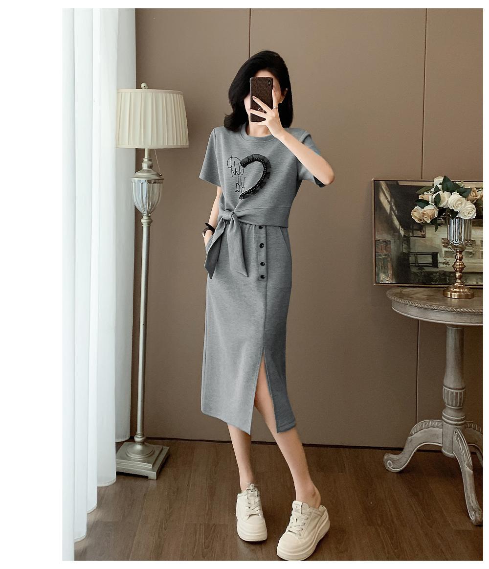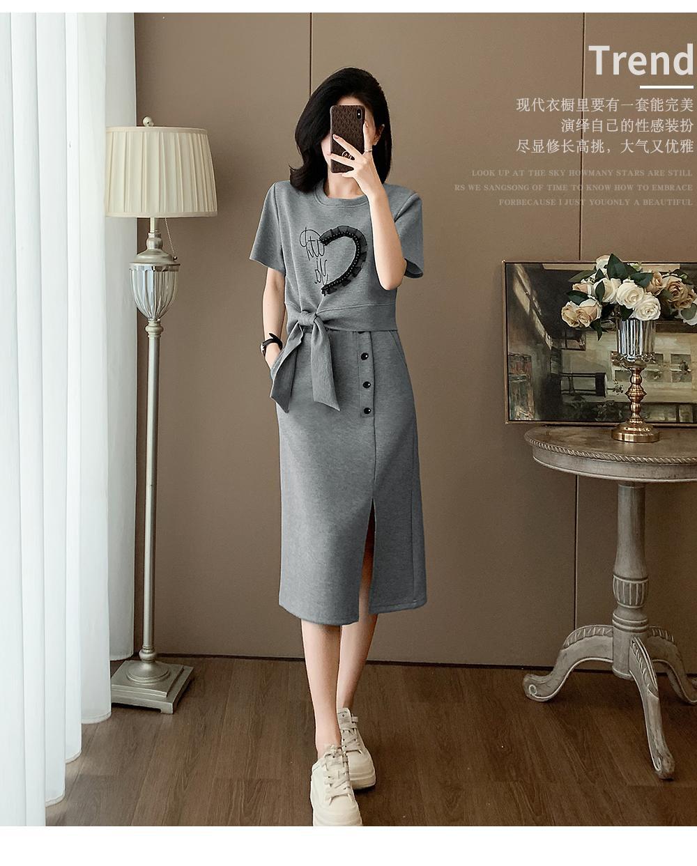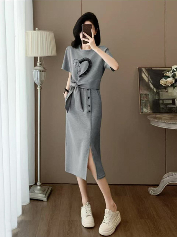 하이 엔드 센스 그레이 캐주얼 원피스 2025 년 여름 새로운 스포츠 스타일 반팔 티셔츠 반쪽 길이 스커트 투피스 세트