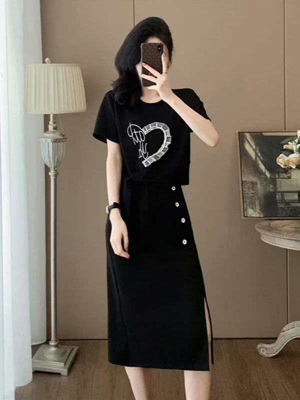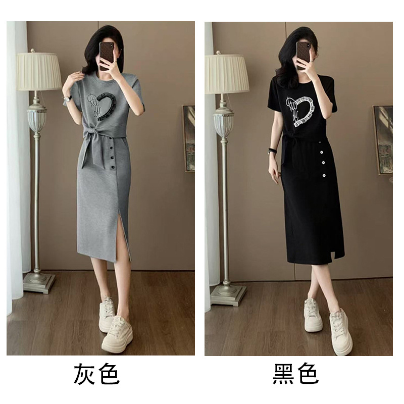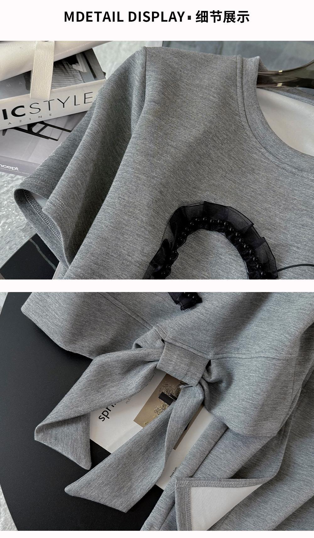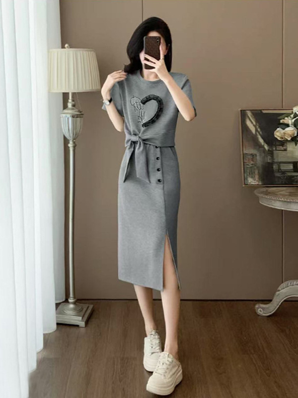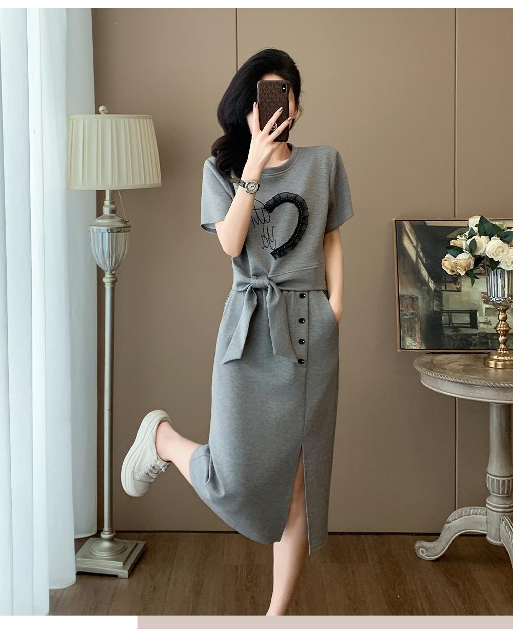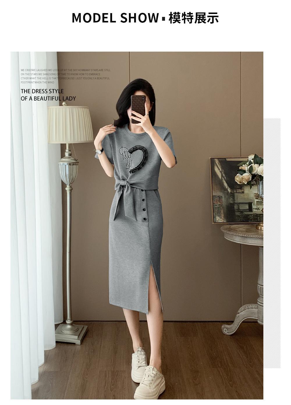 하이 엔드 센스 그레이 캐주얼 원피스 2025 년 여름 새로운 스포츠 스타일 반팔 티셔츠 반쪽 길이 스커트 투피스 세트