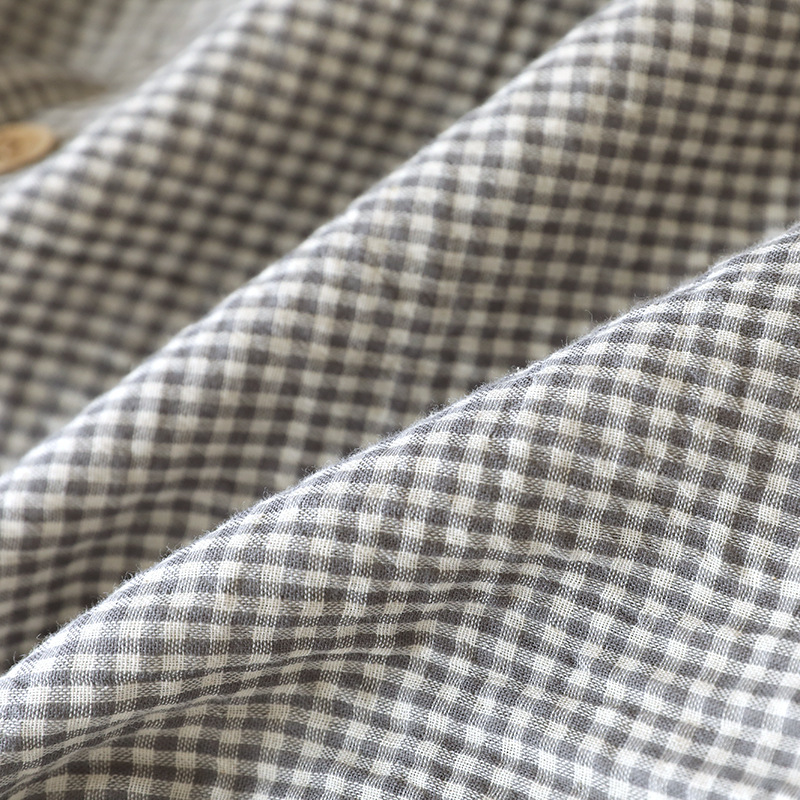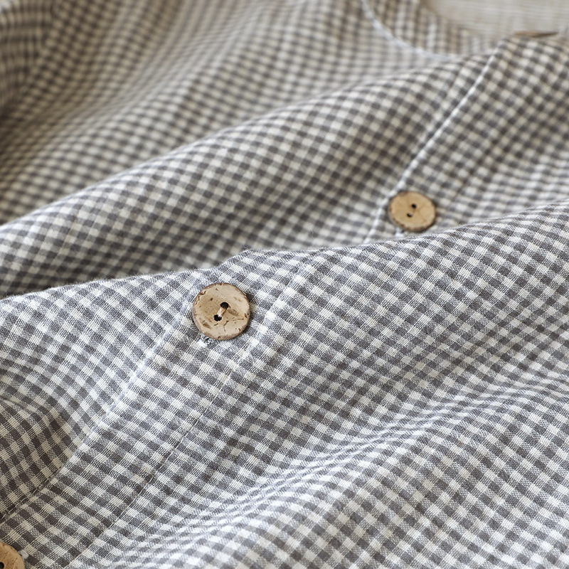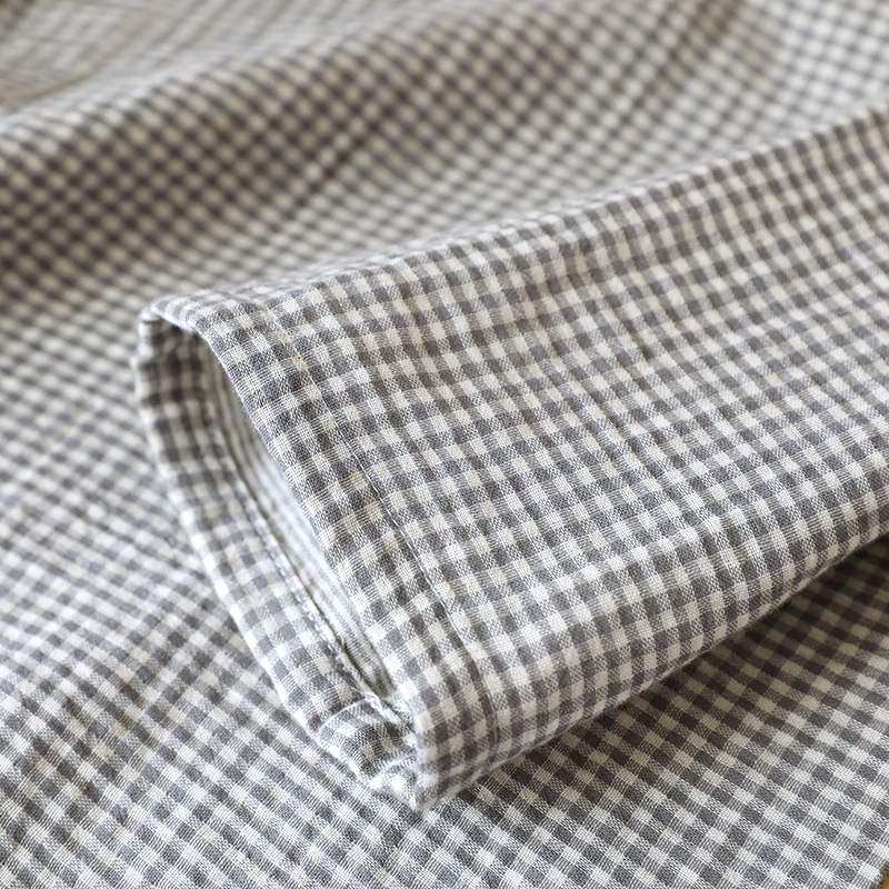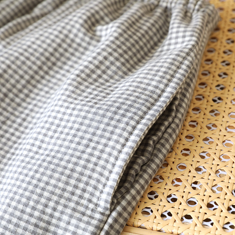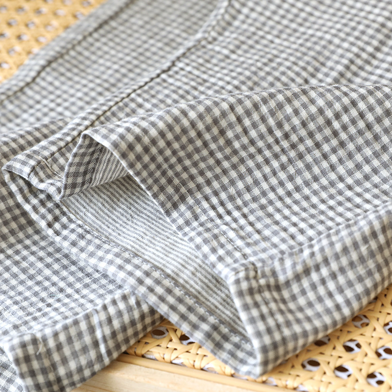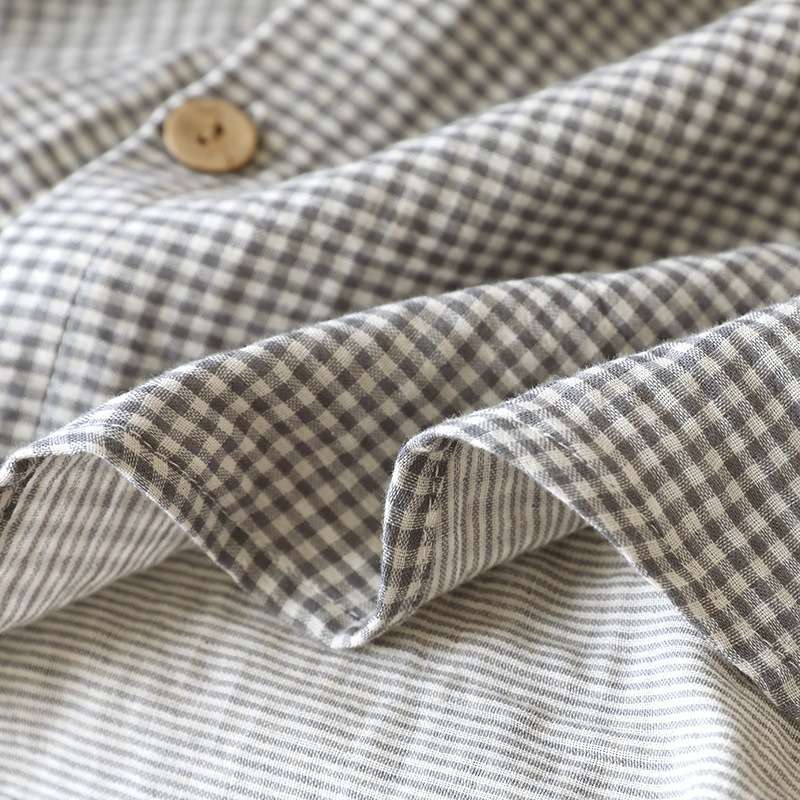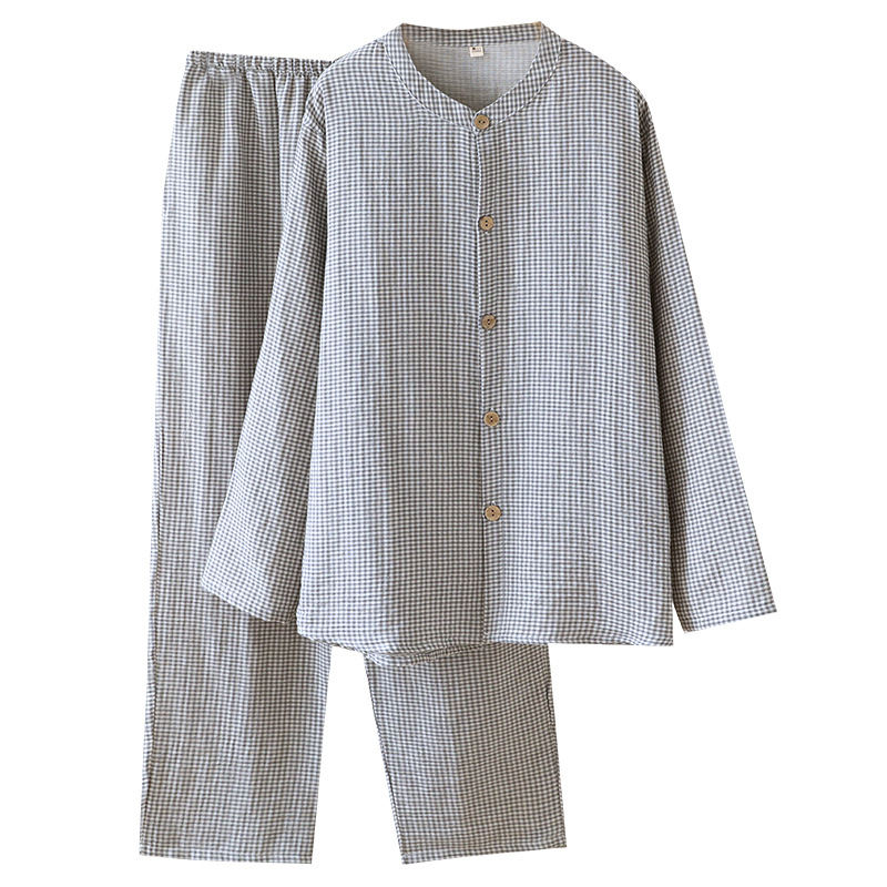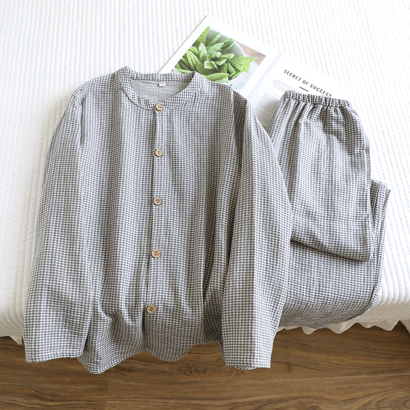Wen Lan 남성용 퓨어 코튼 더블 레이어 원사 염색 홈 파자마 라운드 넥 간단한 체크 무늬 통기성 긴팔 바지 커버