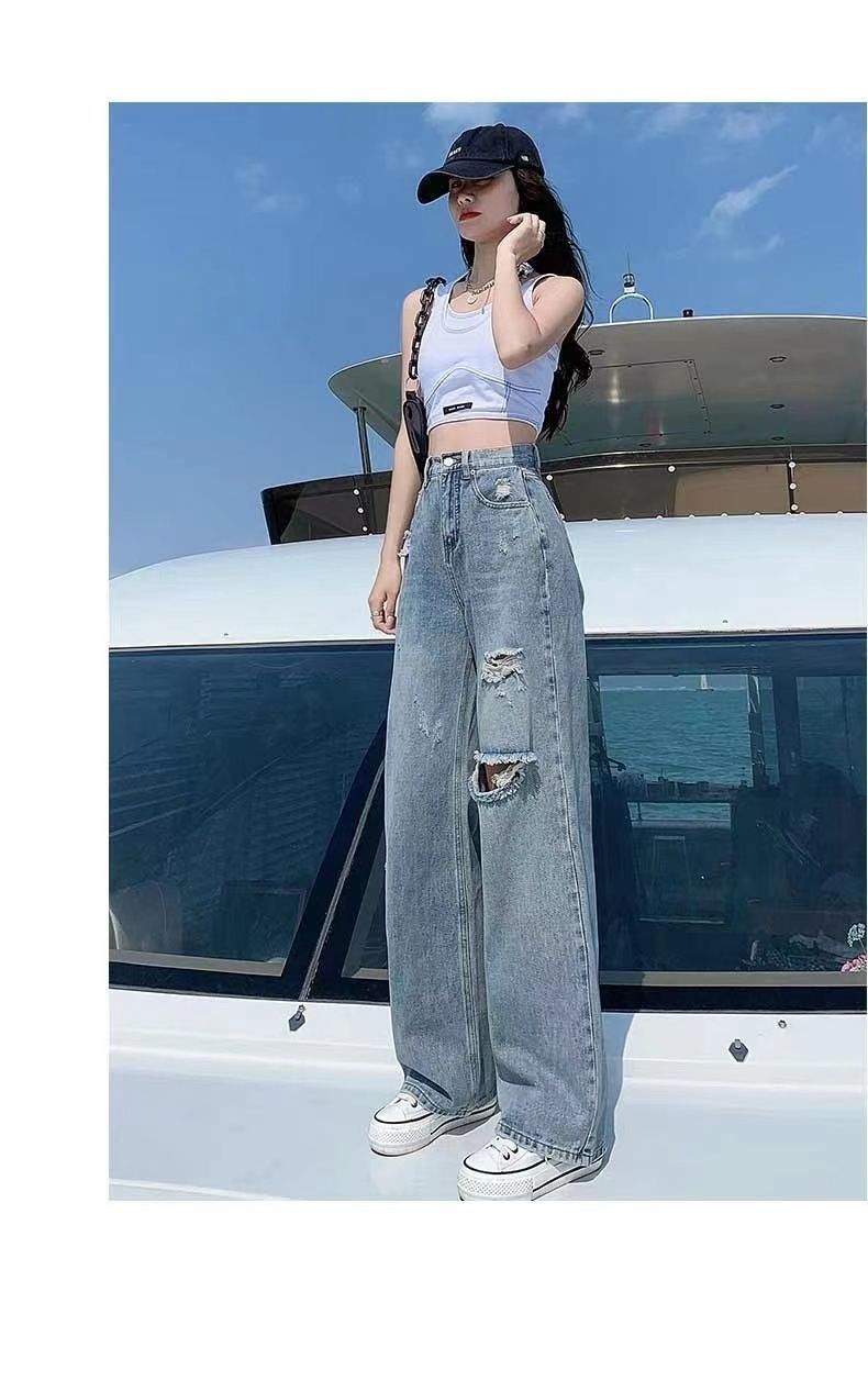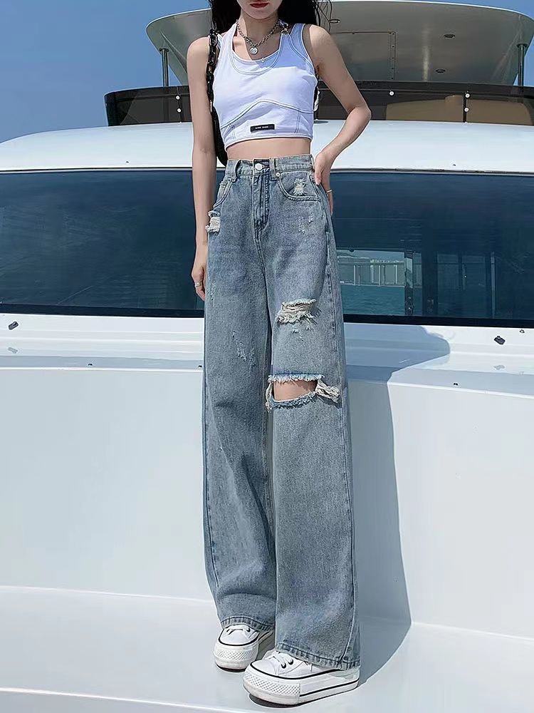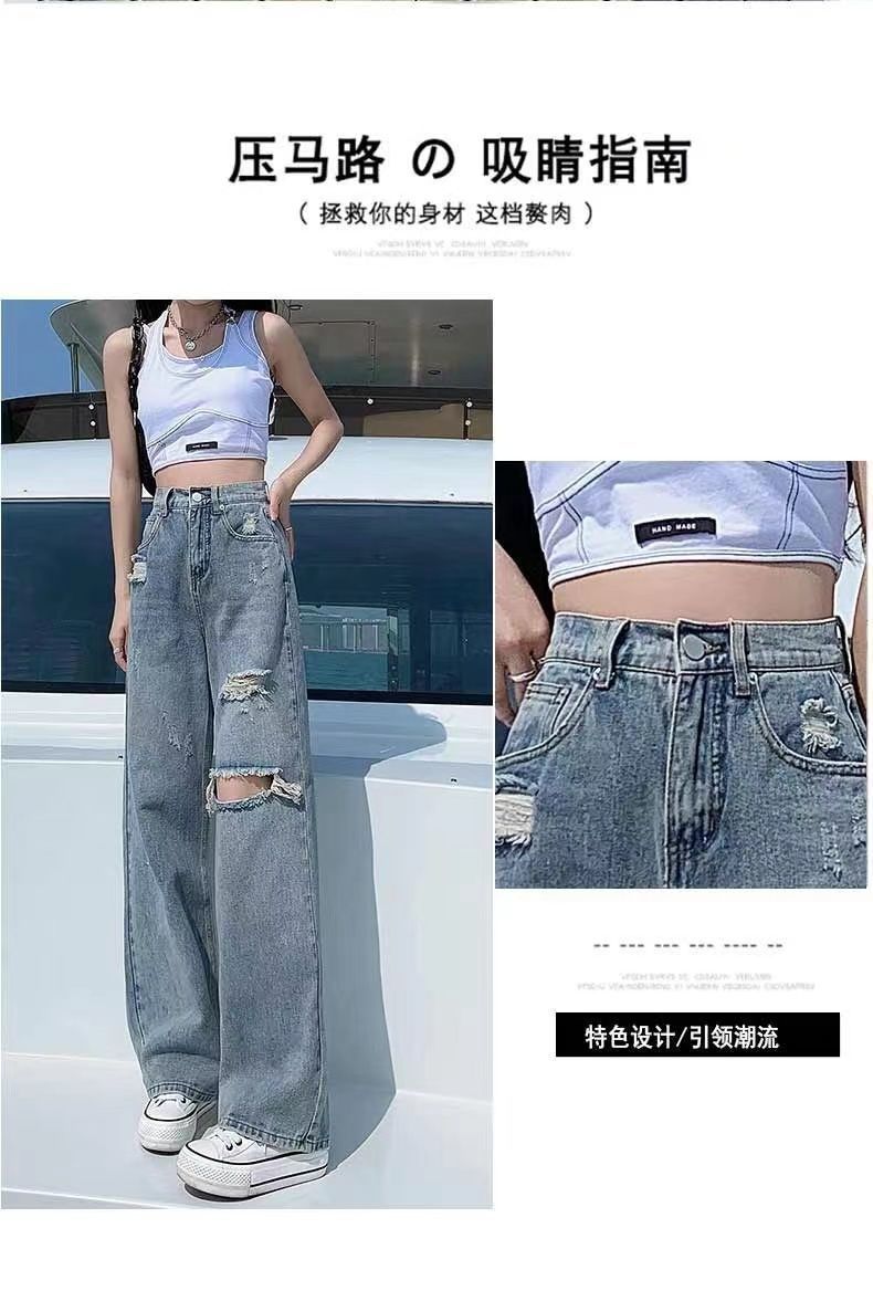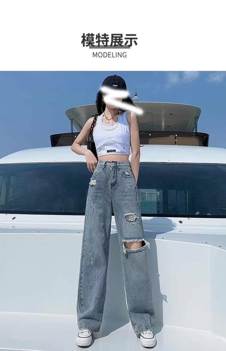 破洞牛仔裤女高腰显瘦百搭2022夏季薄款辣妹宽松阔腿拖地裤子女潮