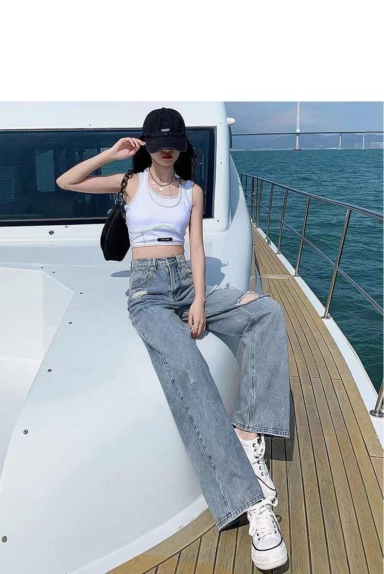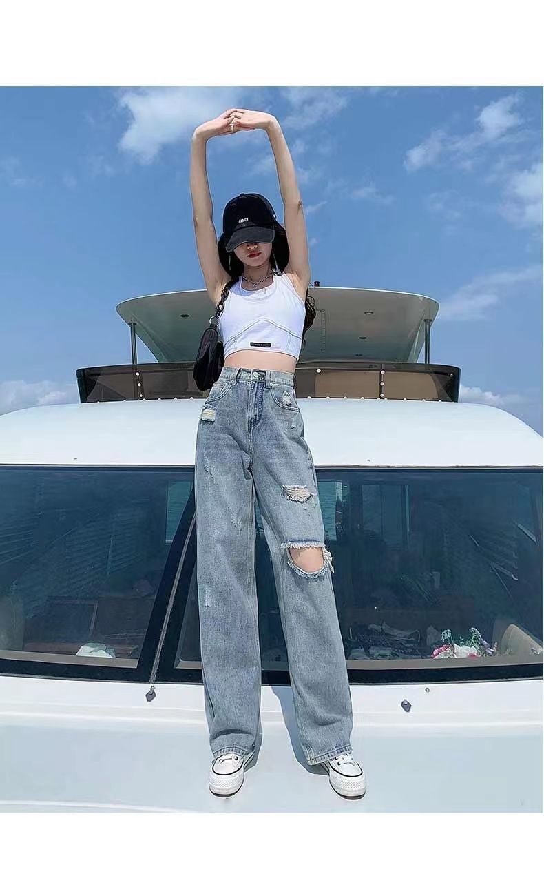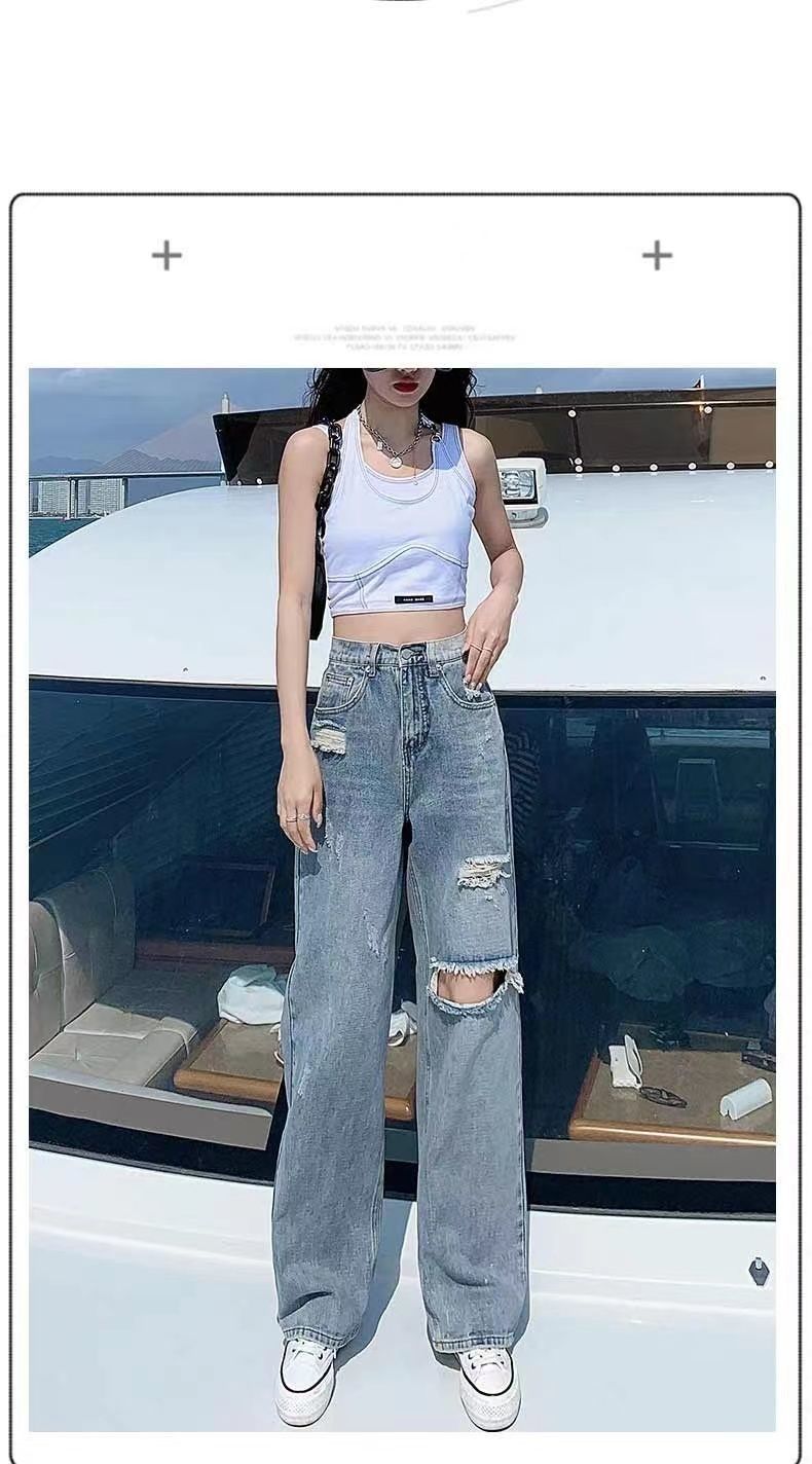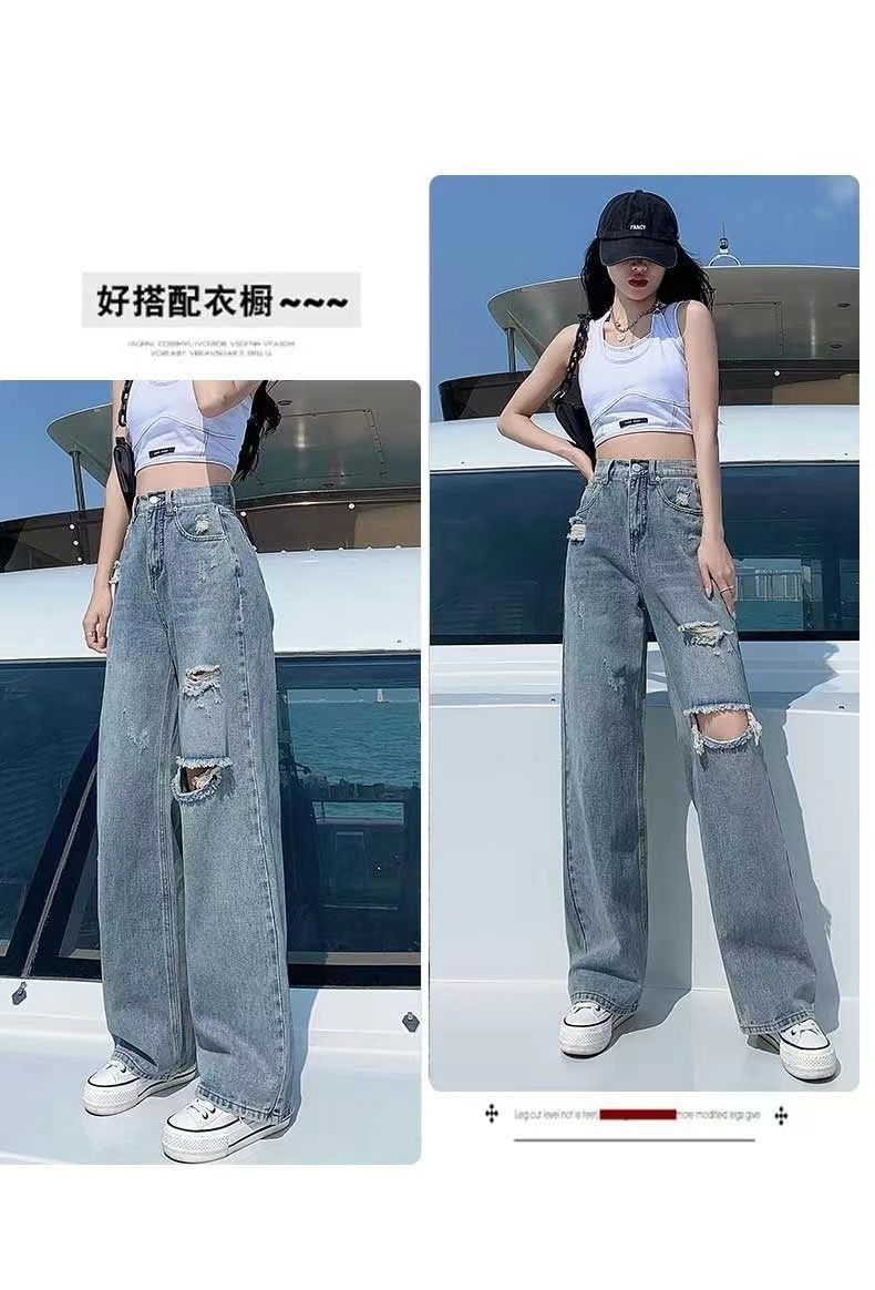 破洞牛仔裤女高腰显瘦百搭2022夏季薄款辣妹宽松阔腿拖地裤子女潮