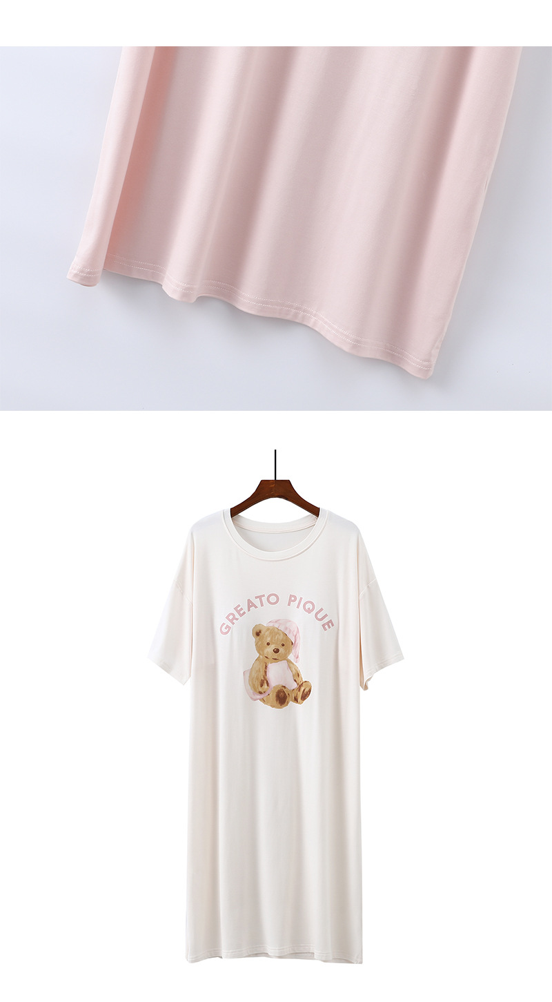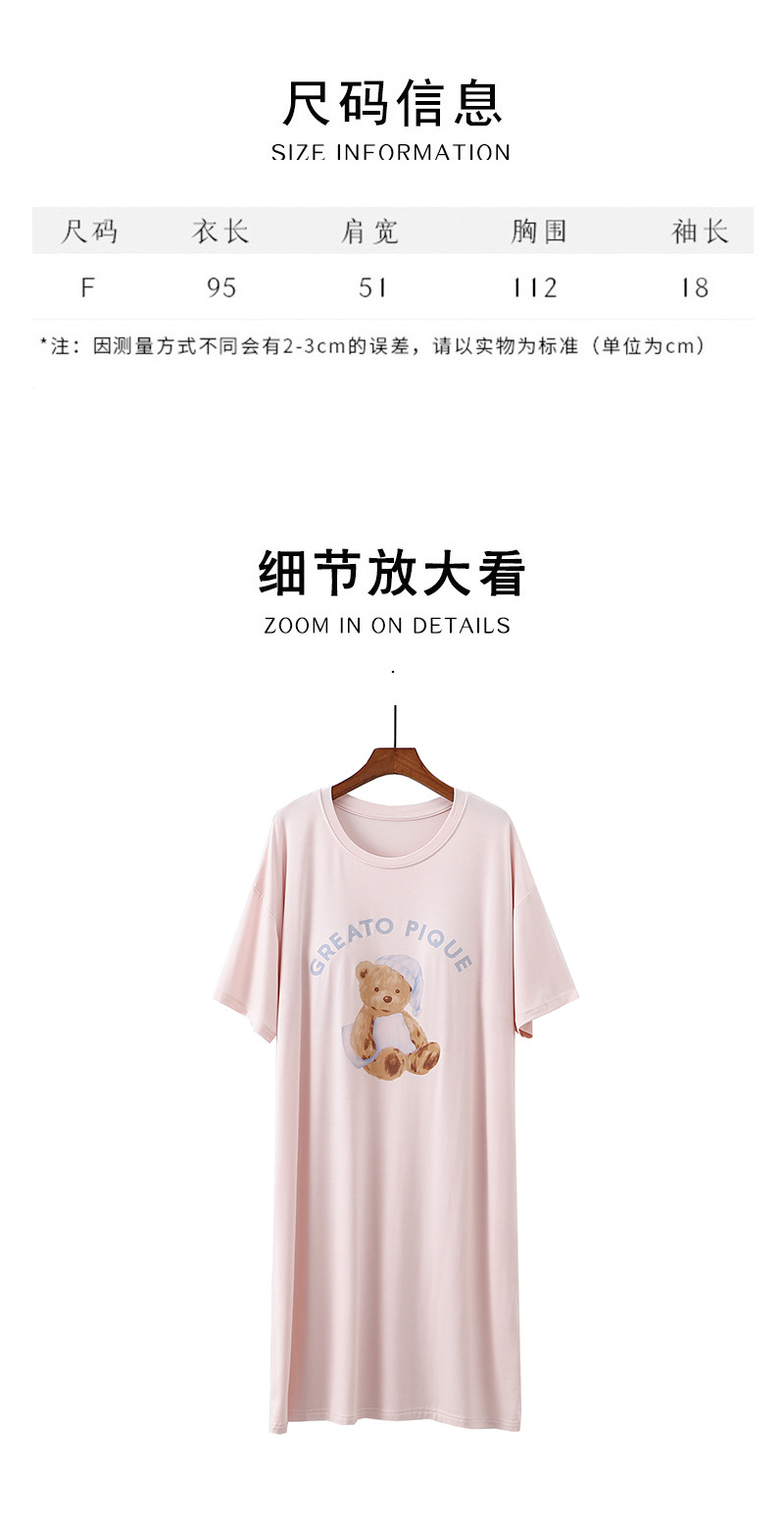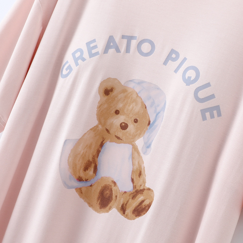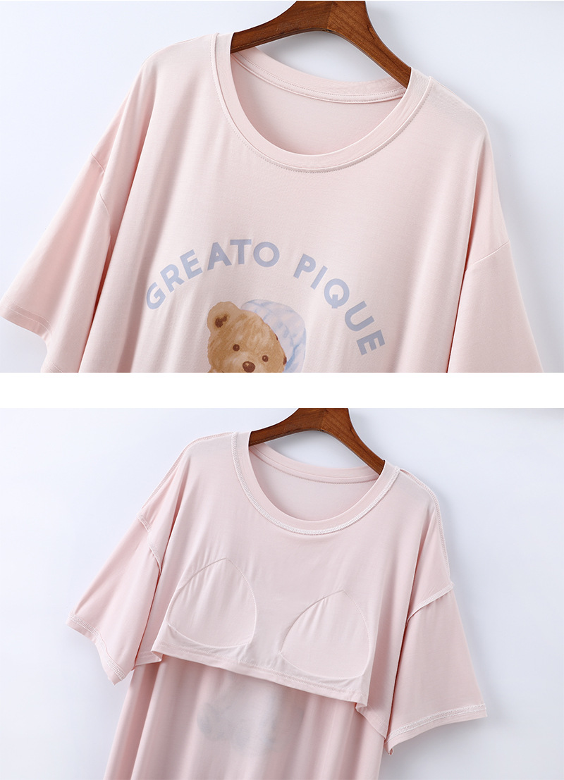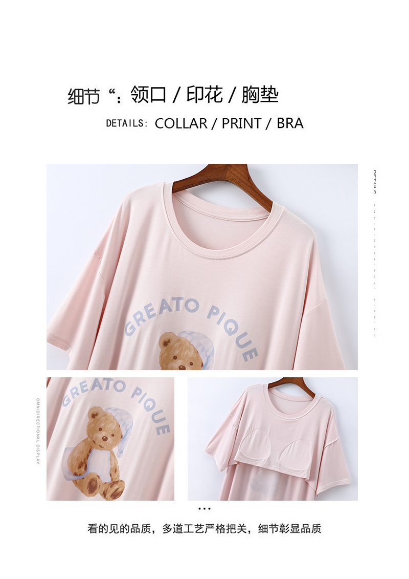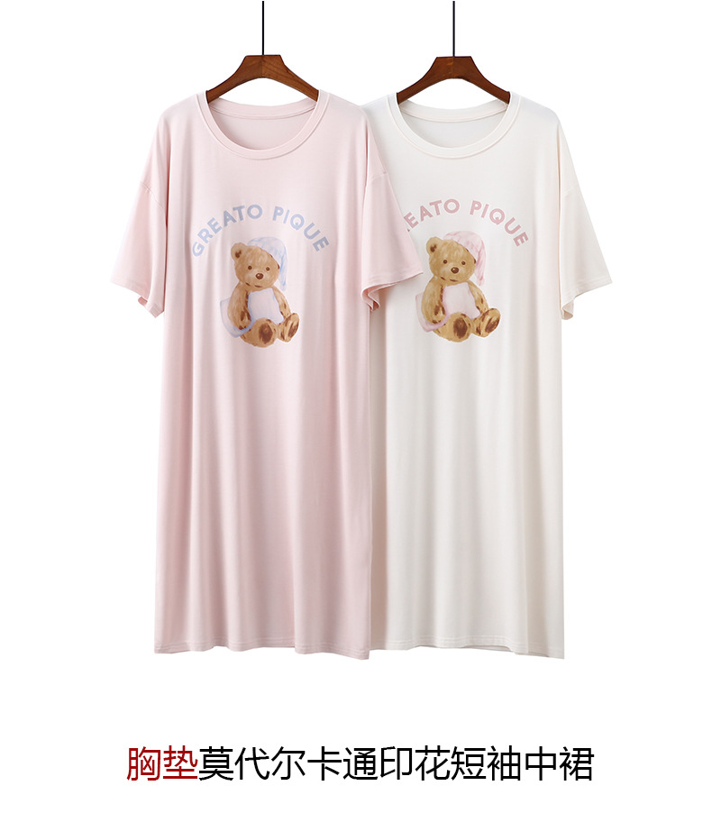 2025 가슴 패드 나이트 드레스 여성의 여름 얇은 모달 만화 곰 인쇄 반팔 중간 길이 원피스 스트레치 홈 원피스