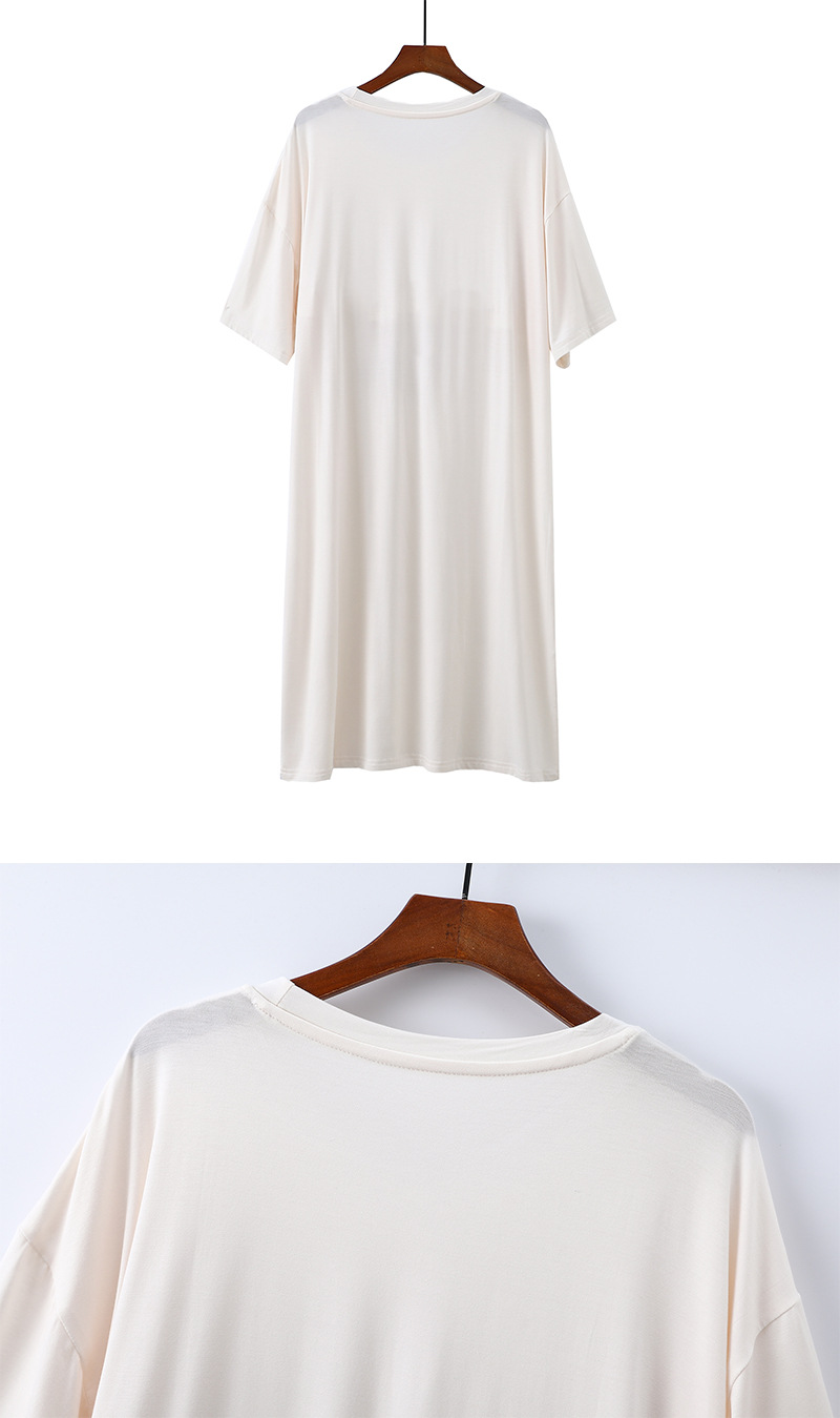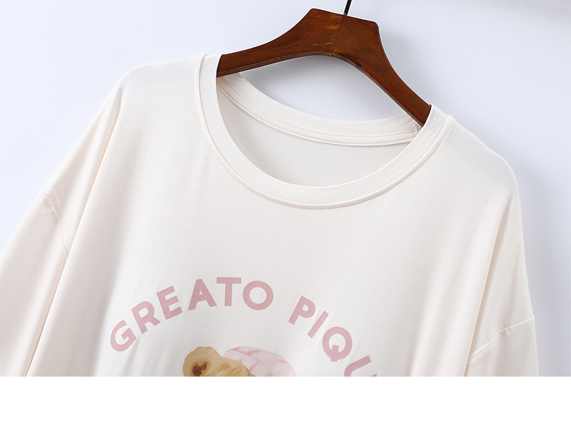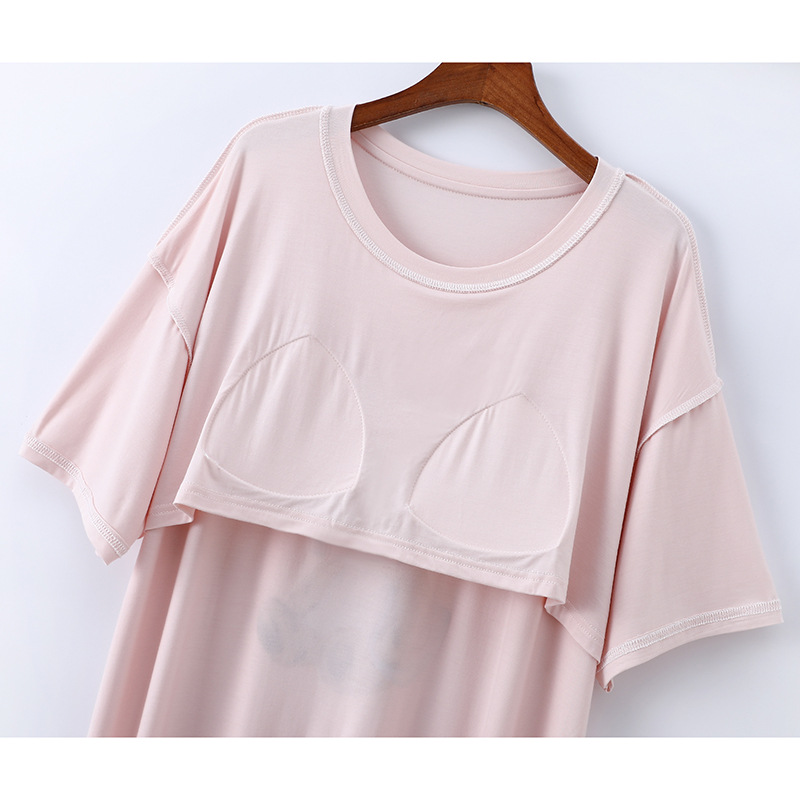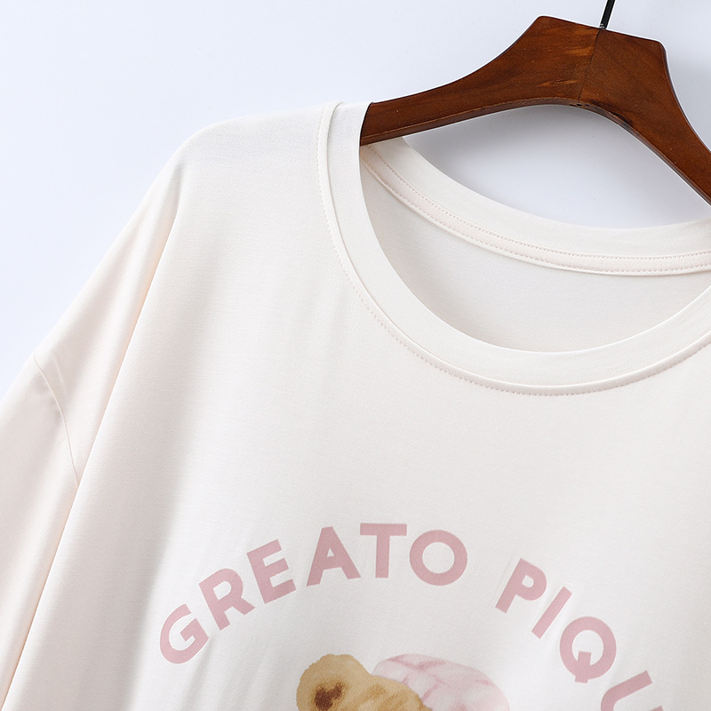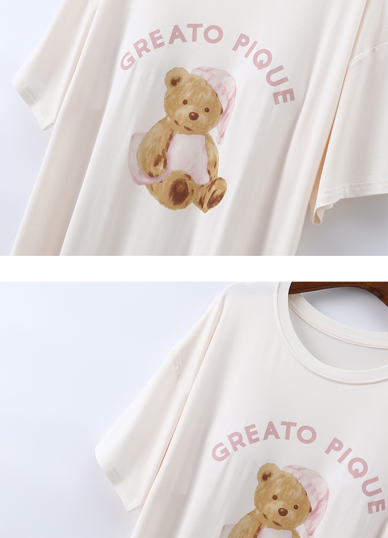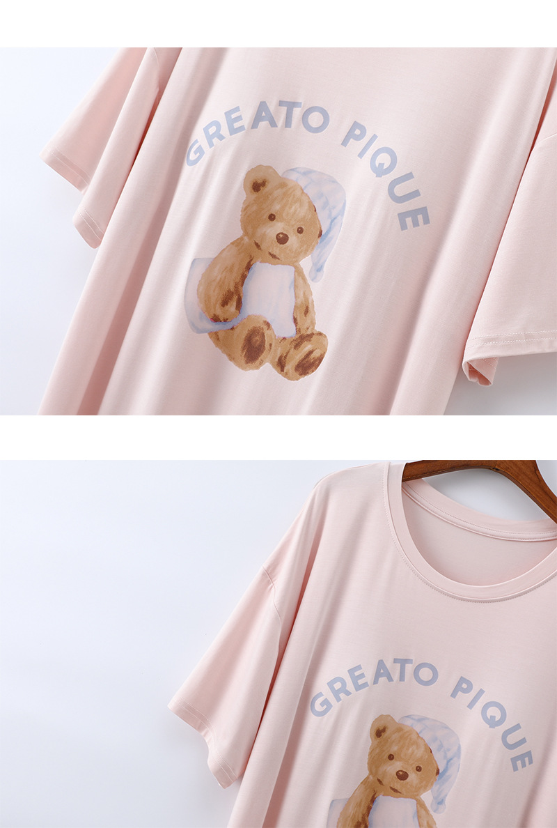 2025 가슴 패드 나이트 드레스 여성의 여름 얇은 모달 만화 곰 인쇄 반팔 중간 길이 원피스 스트레치 홈 원피스