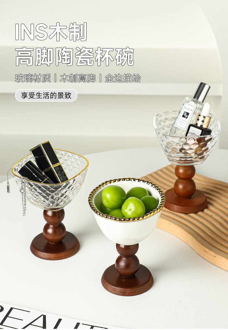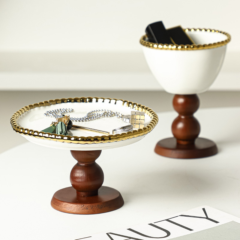 비즈 도트 세라믹 그릇 + 갈색 나무 높은 다리