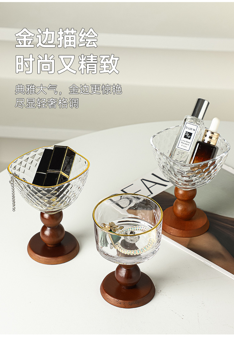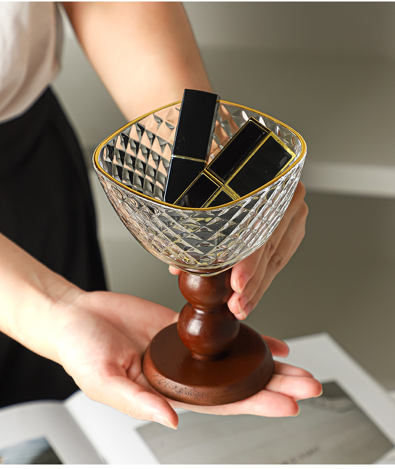 망치로 두드린 금테 유리 + 갈색 나무 높은 다리