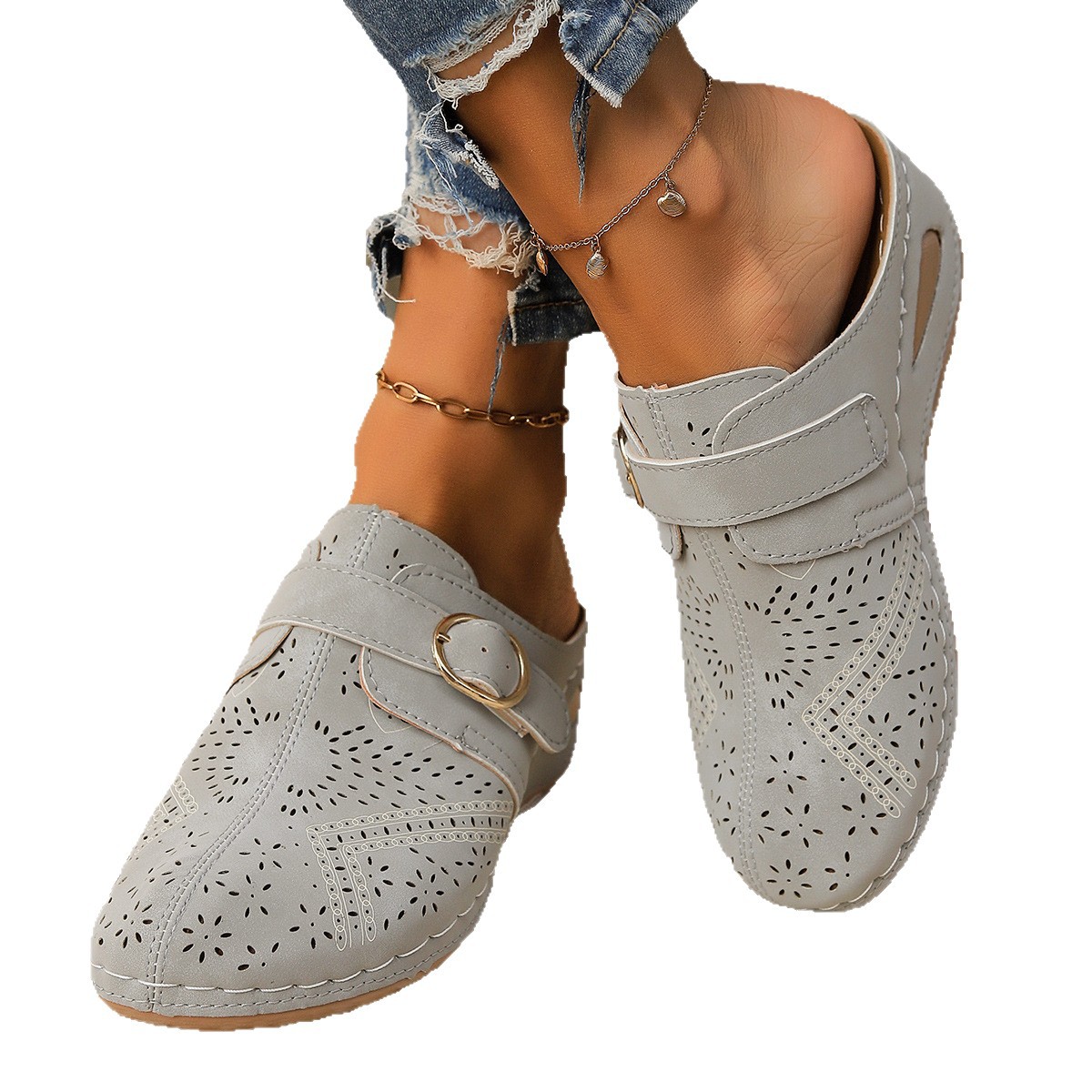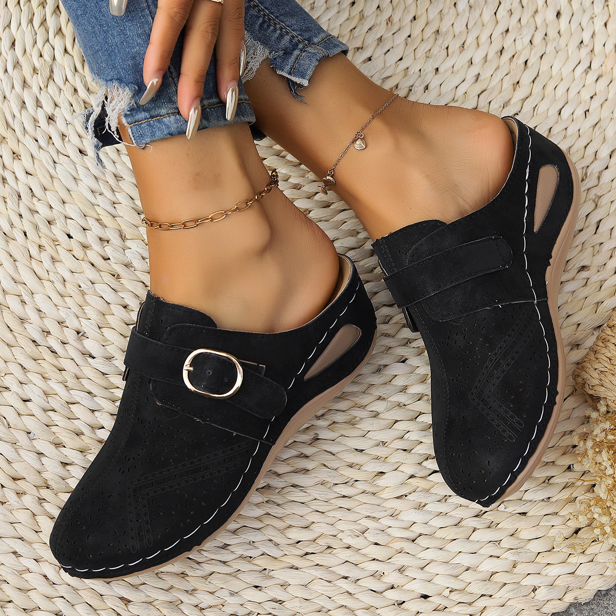 여름 신상품 크로스보더 대외 무역 바오터우 하프 슬리퍼 레이스업 웨지 여성 샌들 유럽과 미국의 대형 중공 샌들