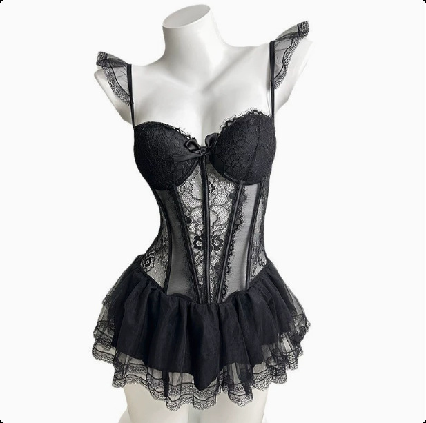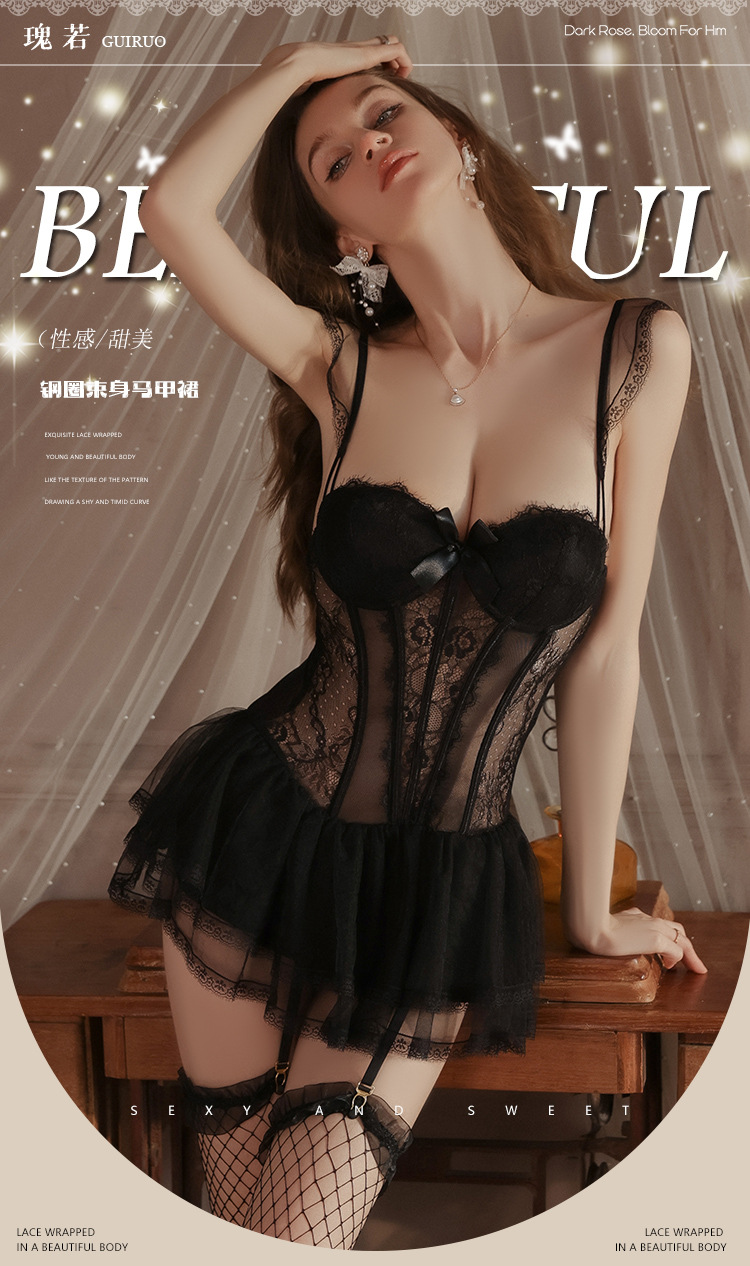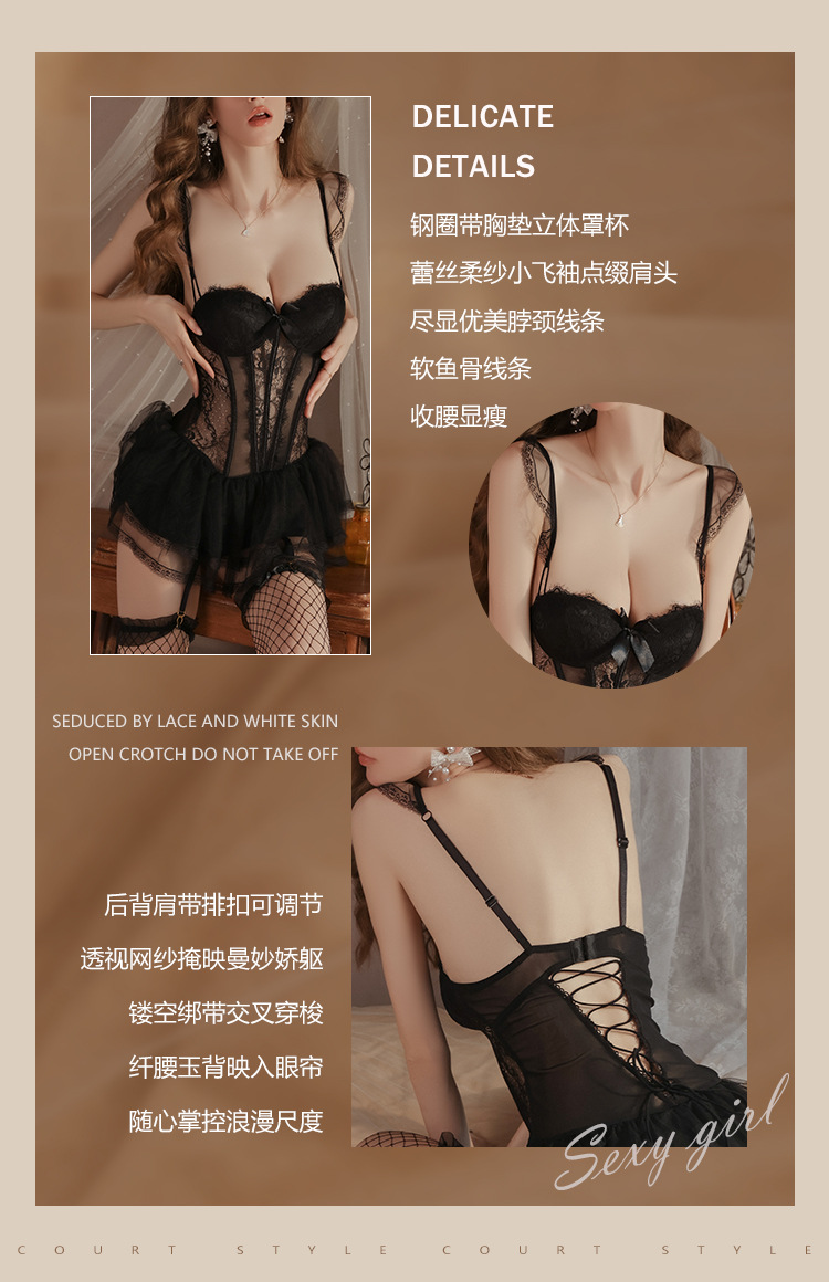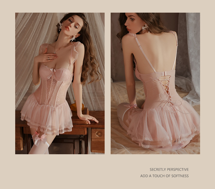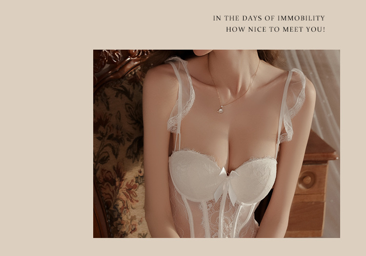 여름 여성을 위한 언더와이어 푸쉬업 섹시 잠옷, 작은 가슴이 더 커 보이고 달콤한 레이스 플라잉 슬리브, 허리 조절 가능한 퍼프 스커트, 서스펜더 잠옷