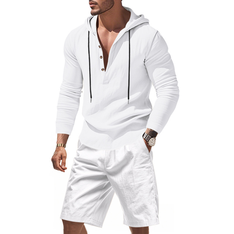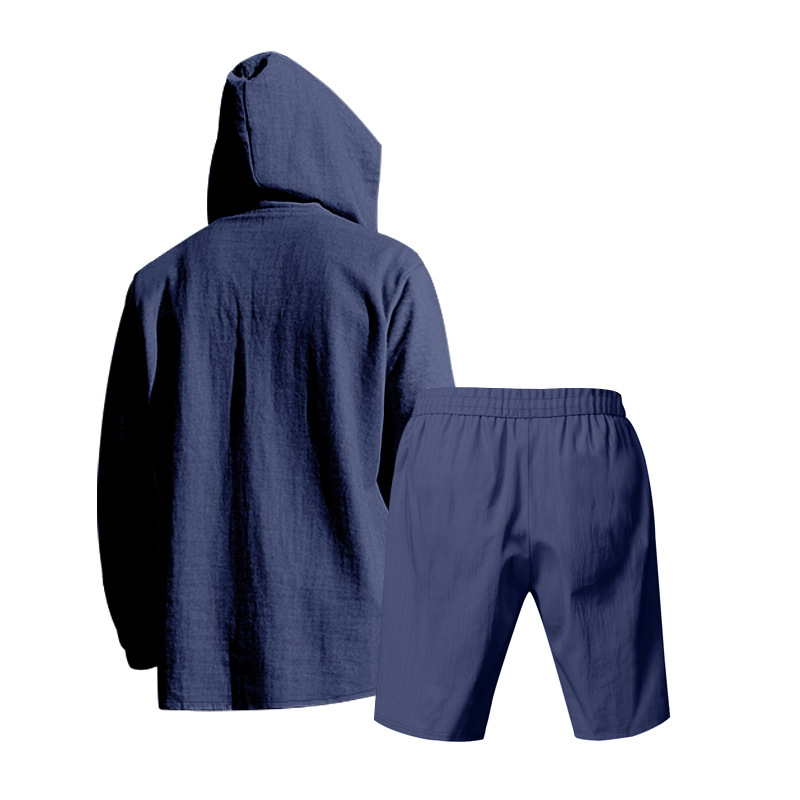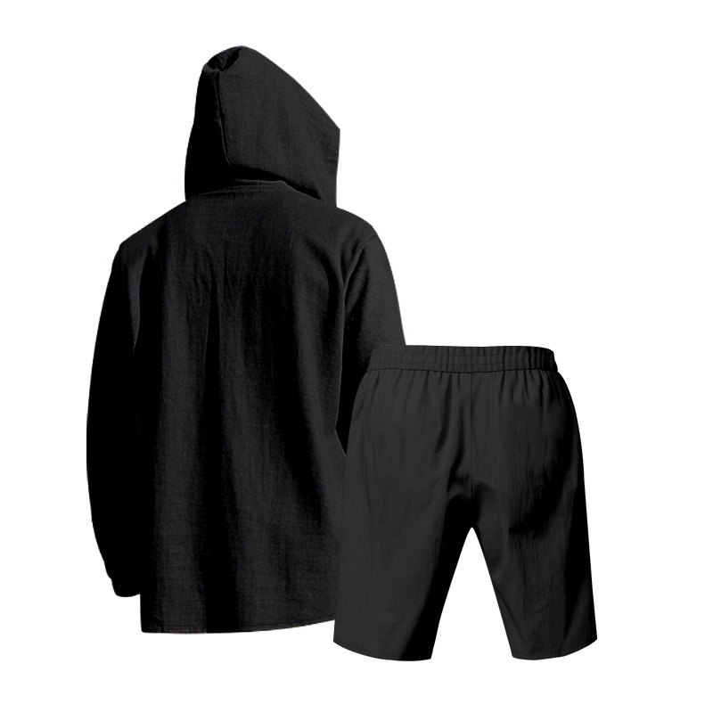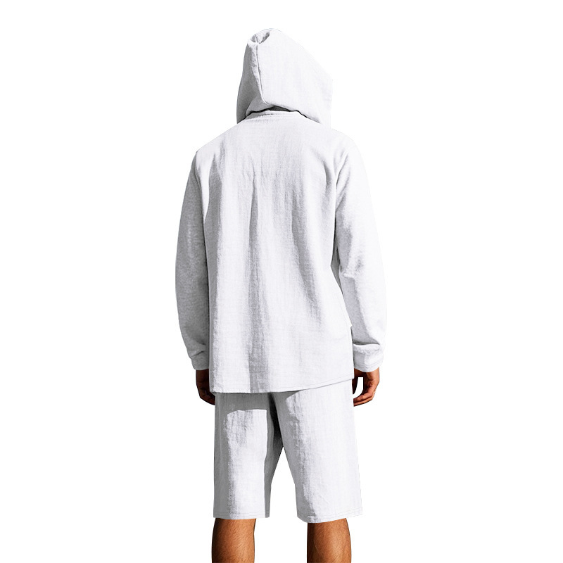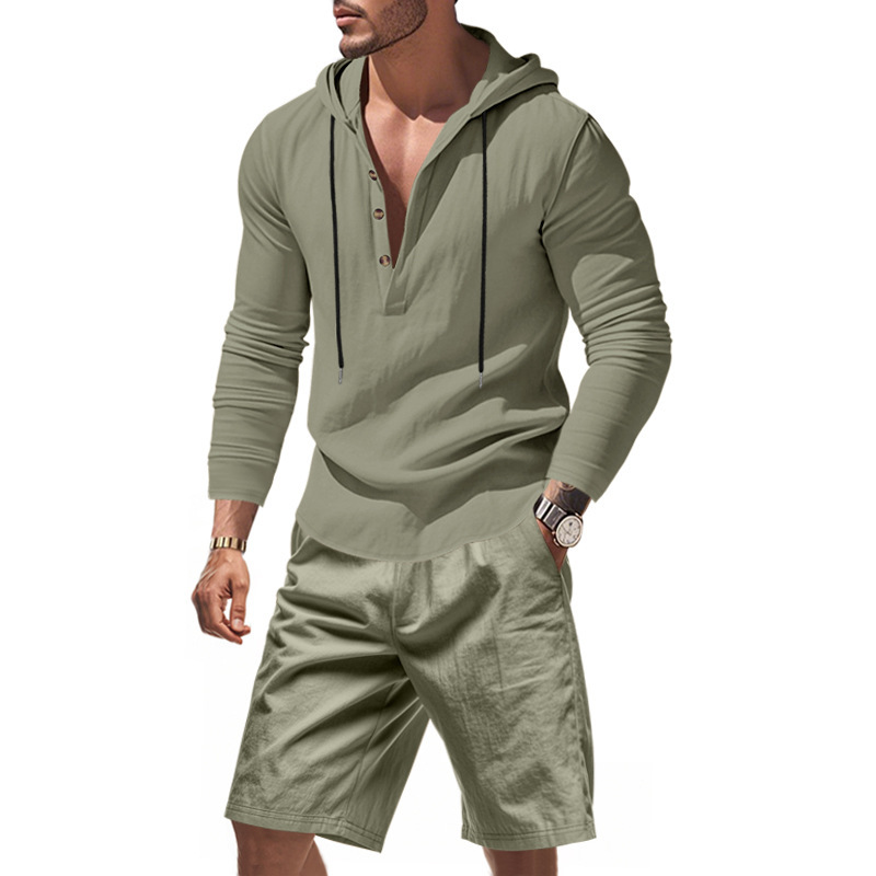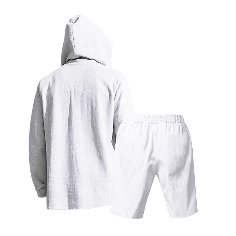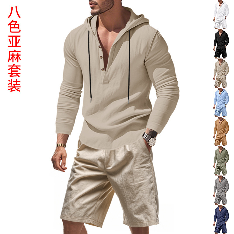 产品风格,美式夏季男士沙滩亚麻连帽短袖短裤套装