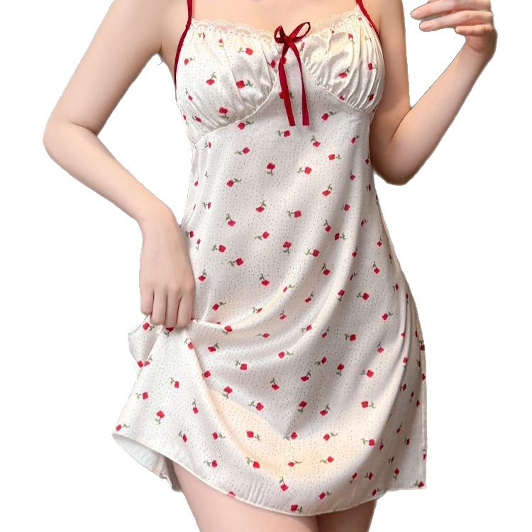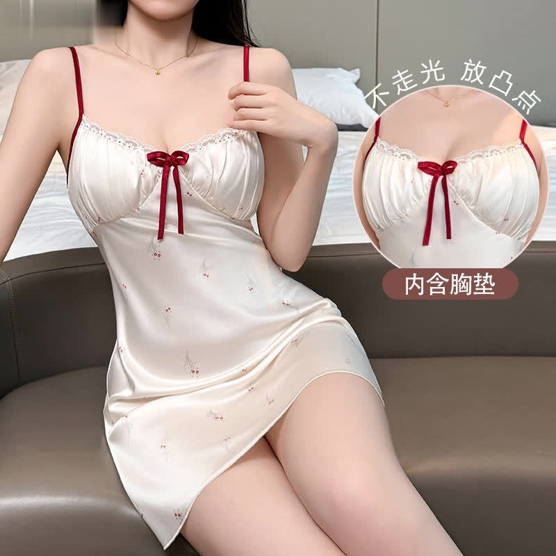 여성용 섹시한 잠옷, 가슴 패드가 있는 얼음 실크, 프린트 순수 실크 2025 새로운 스타일의 서스펜더 잠옷, 홈웨어, 크로스보더 가능