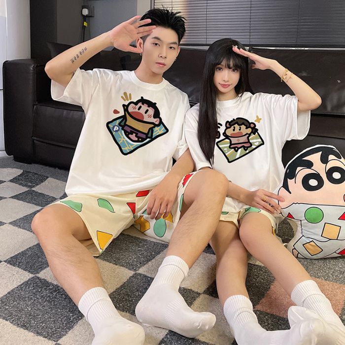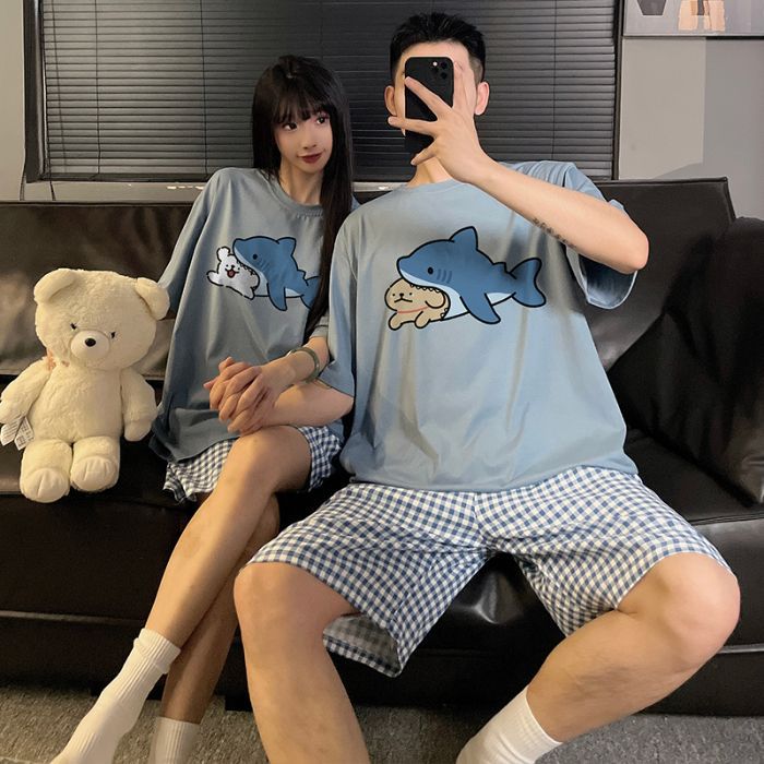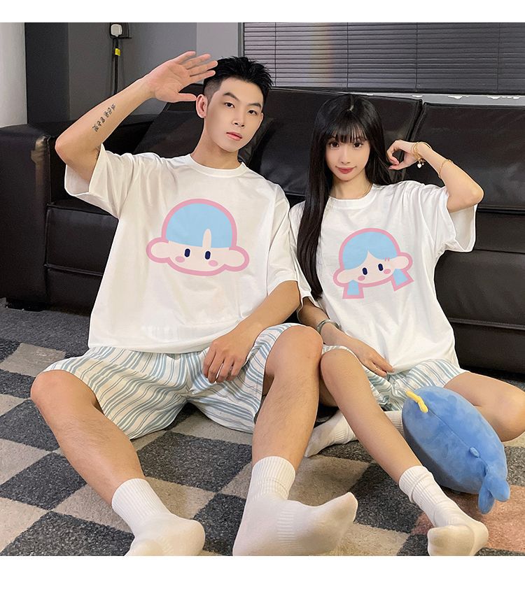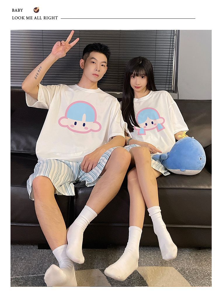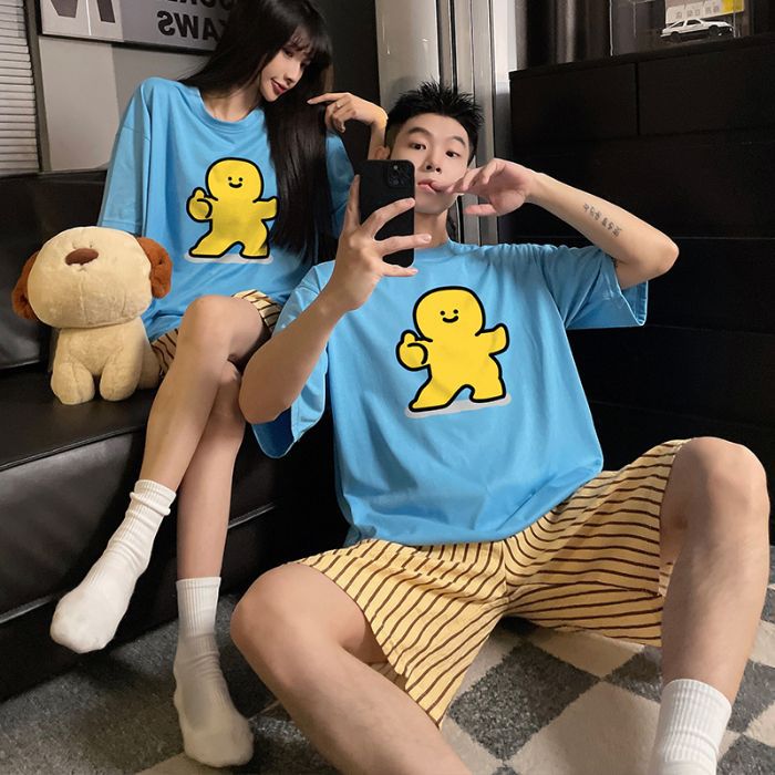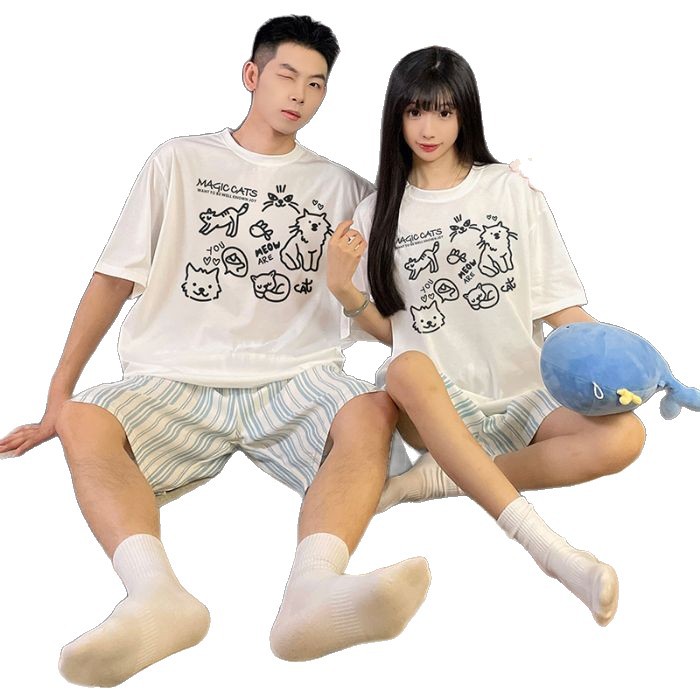 여성을위한 제조 업체 도매 잠옷 2025 새로운 커플 인쇄 만화 귀여운 반팔 반바지는 집 밖에서 착용할 수 있습니다
