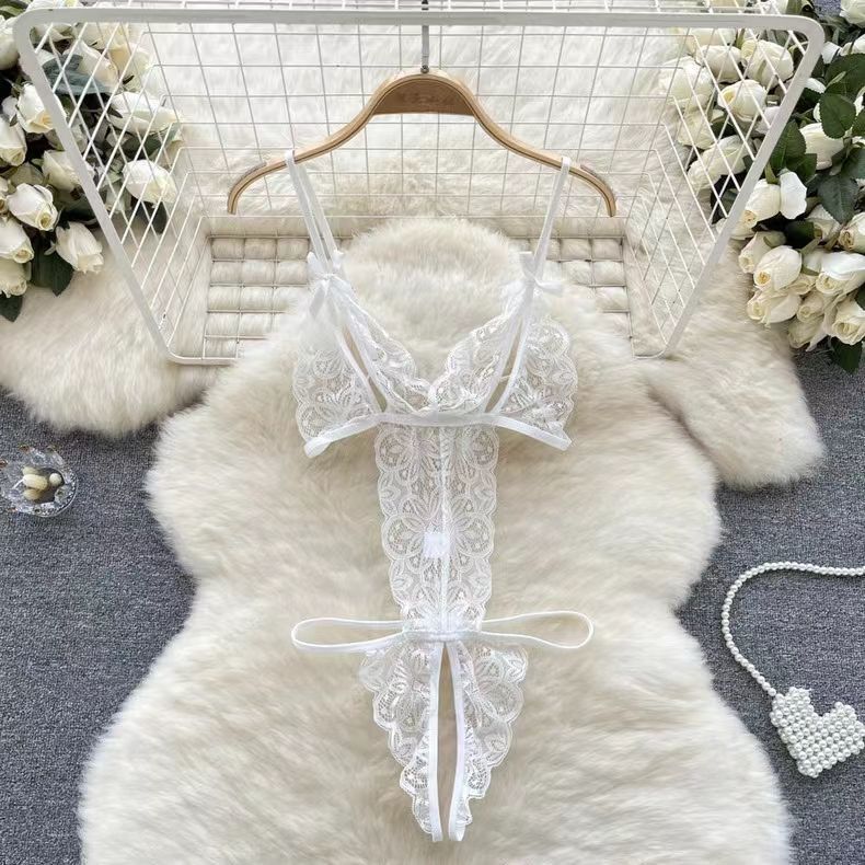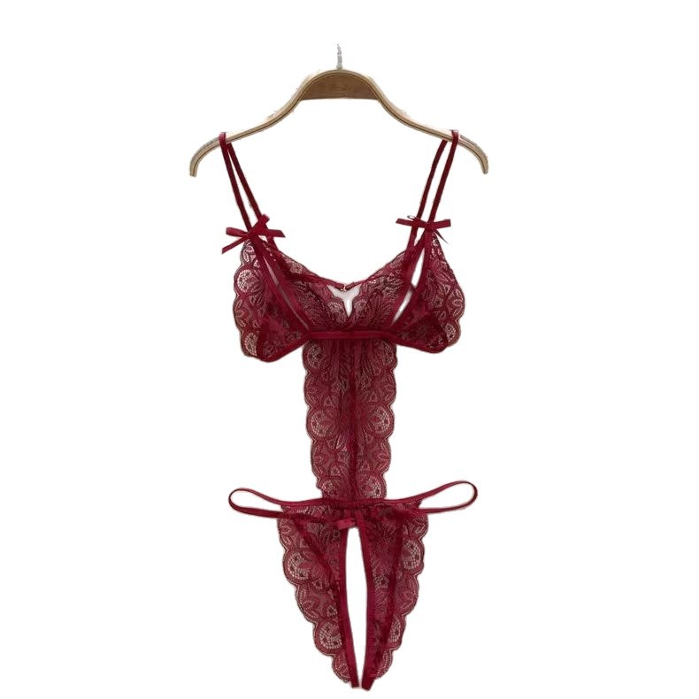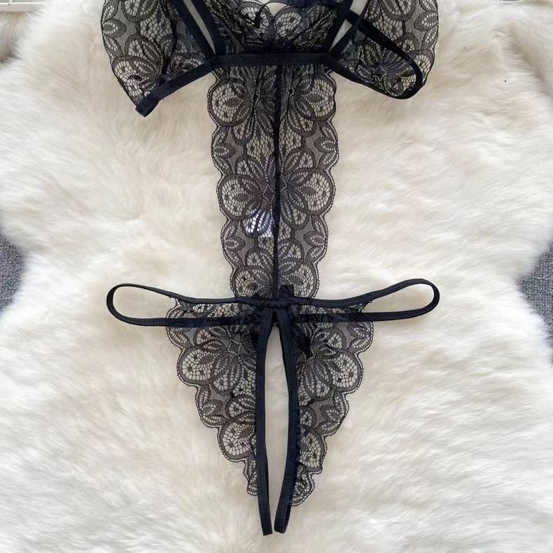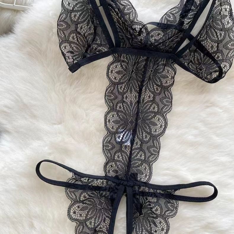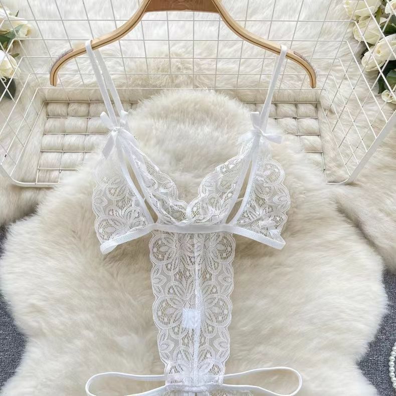 섹시한 여성의 섹시한 시스루 메쉬 오픈 탑 홈웨어 여성의 순수한 욕망 스타일 투명 레이스 로우 컷 서스펜더 점프 슈트