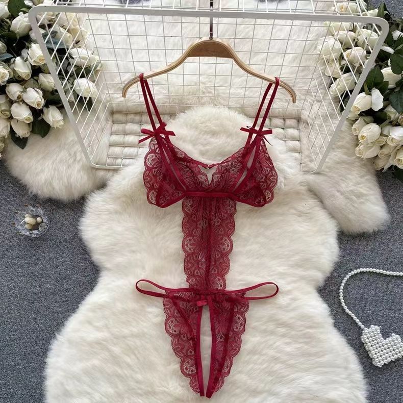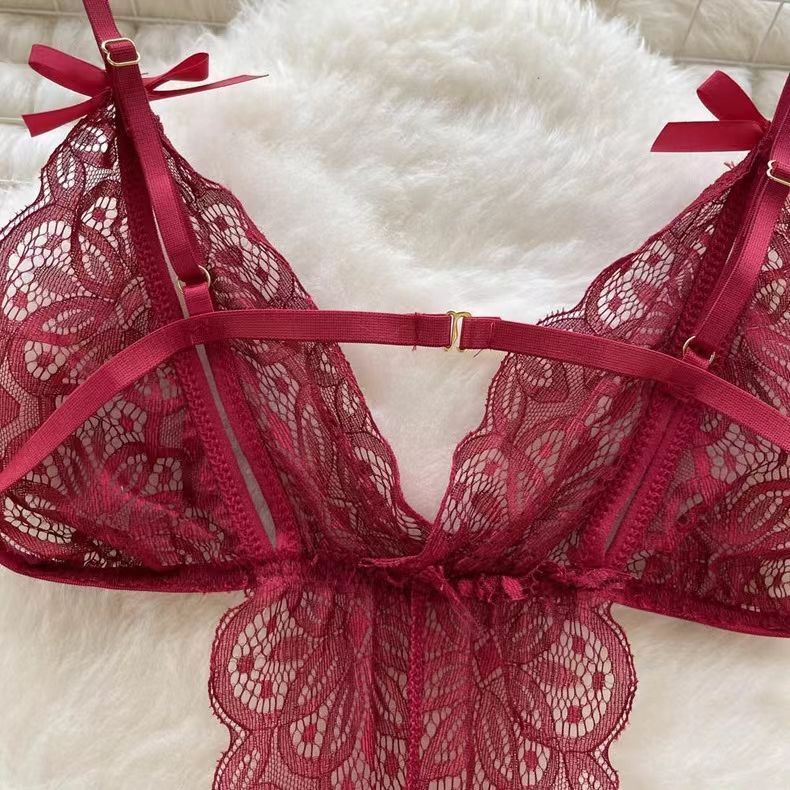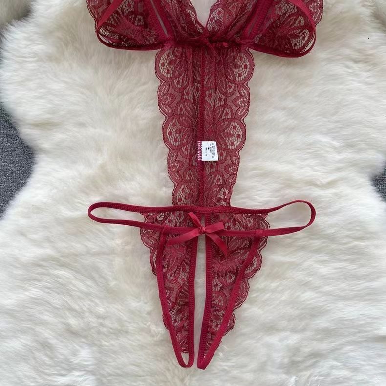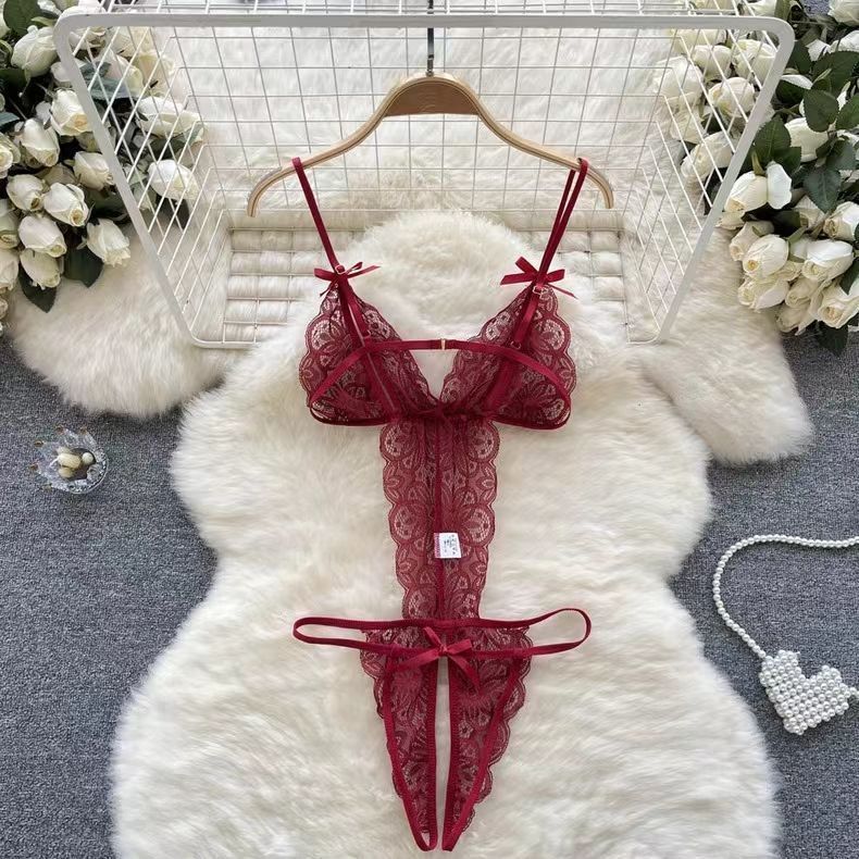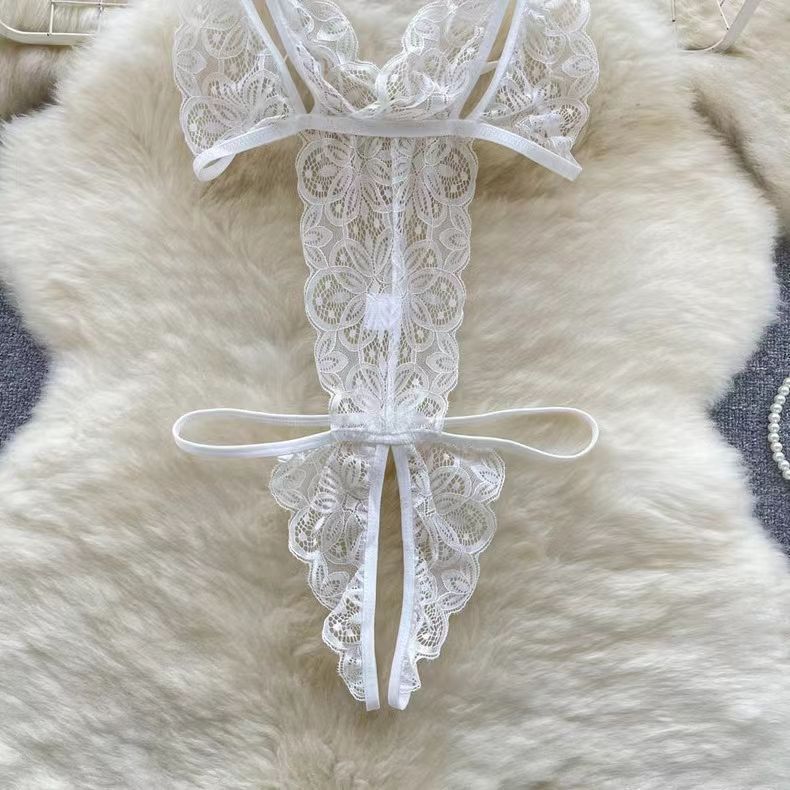 섹시한 여성의 섹시한 시스루 메쉬 오픈 탑 홈웨어 여성의 순수한 욕망 스타일 투명 레이스 로우 컷 서스펜더 점프 슈트
