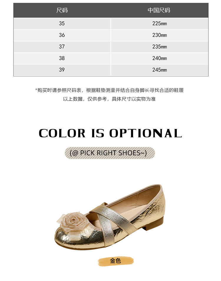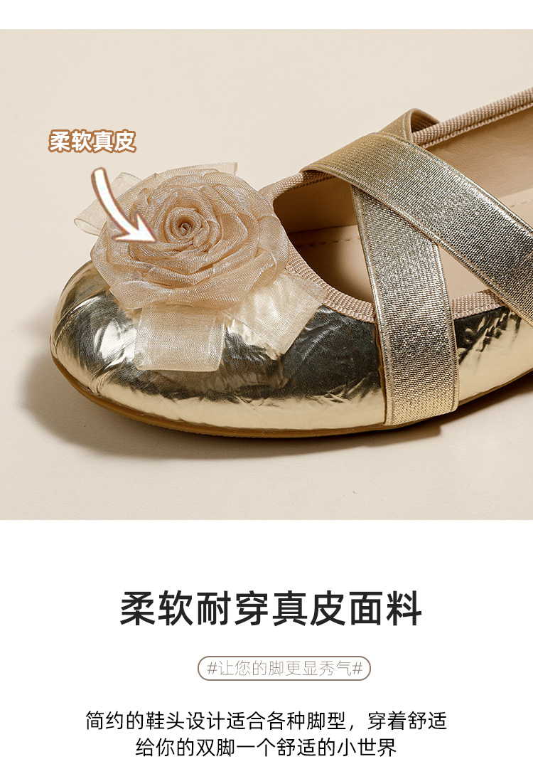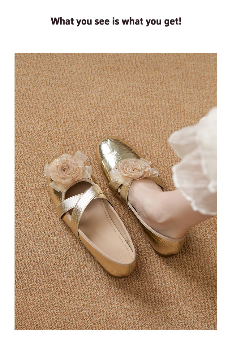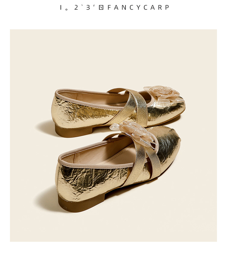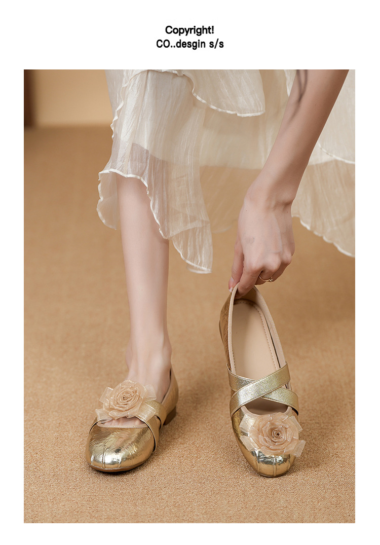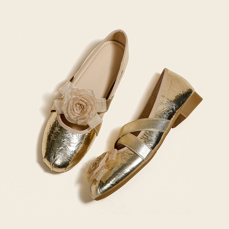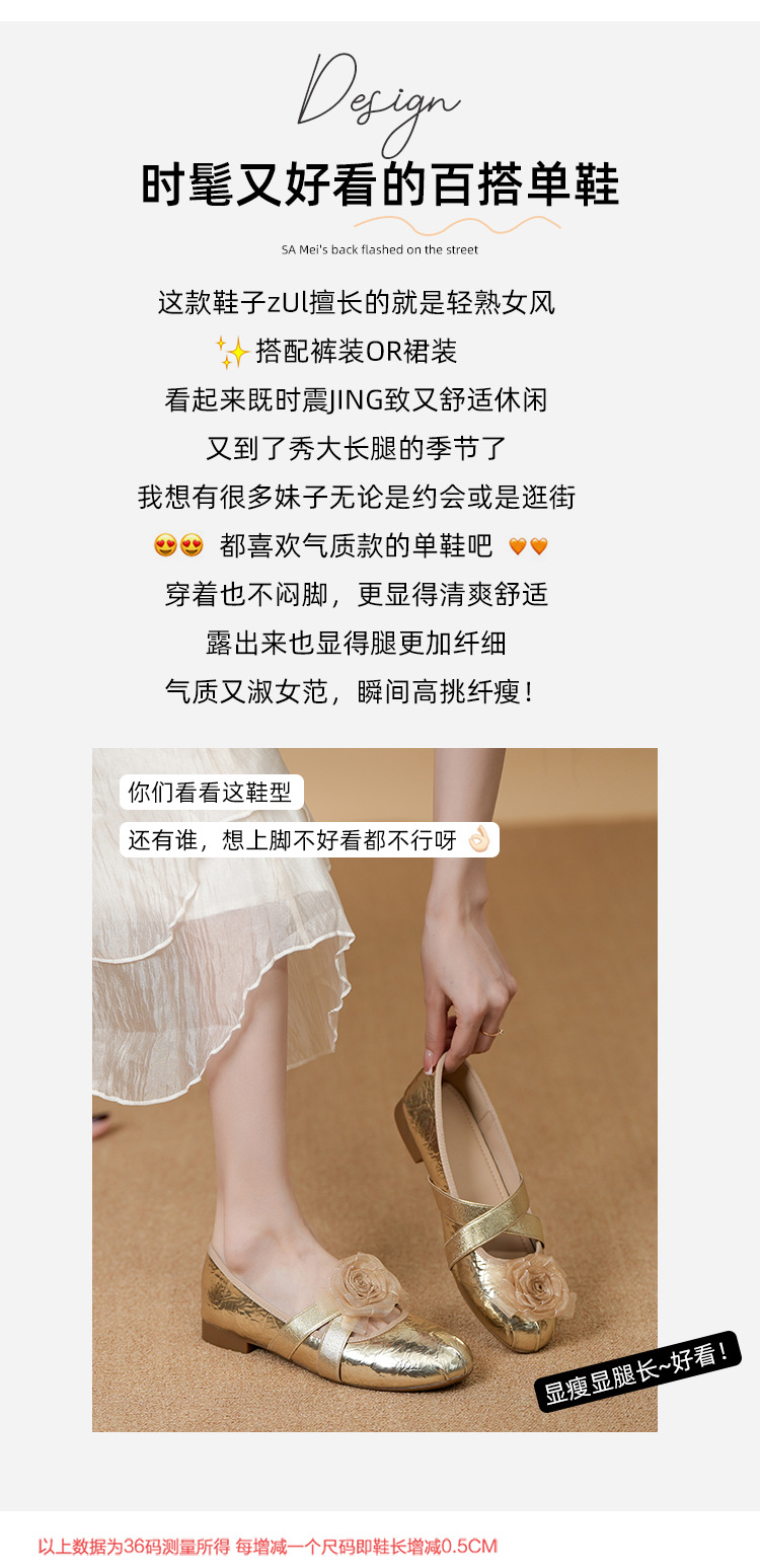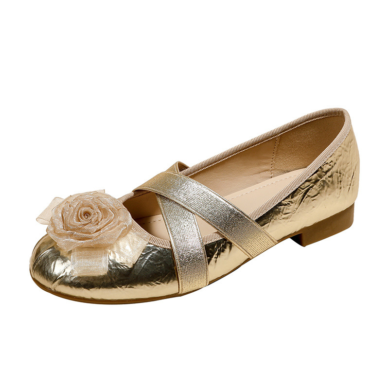 새로운 사계절 여성 신발 양가죽 금색과 실버 크로스 스트랩 동백 꽃 얕은 입 평평한 메리 제인 신발 크기 3340