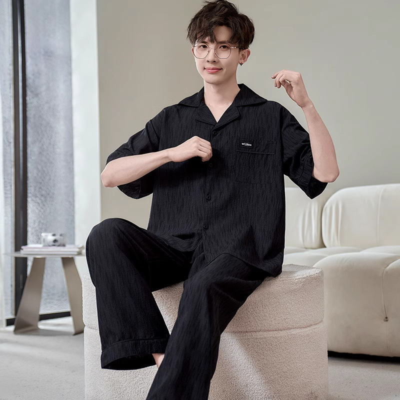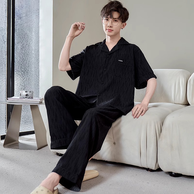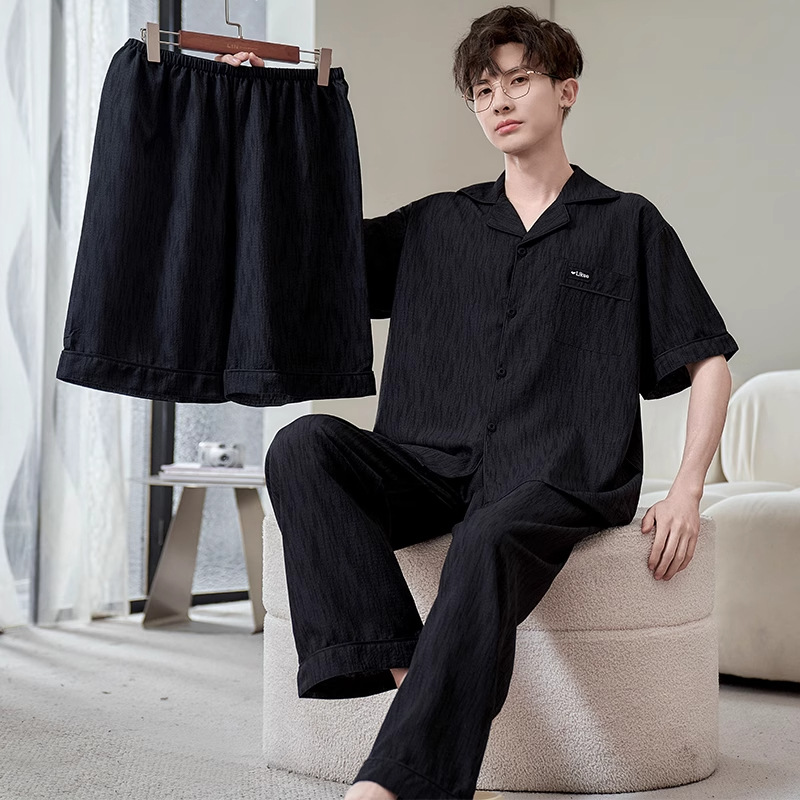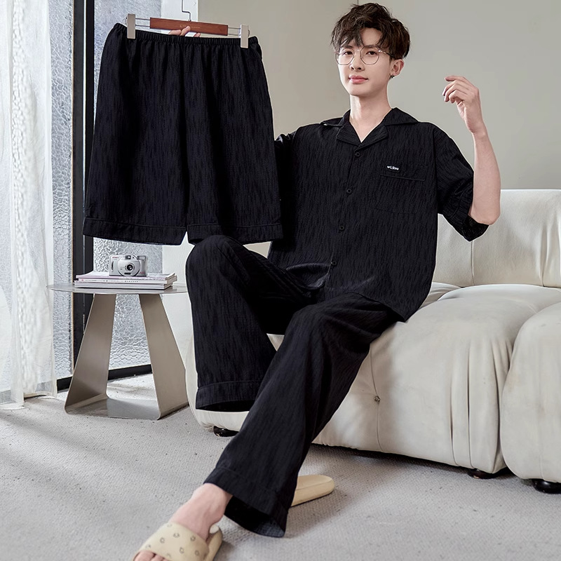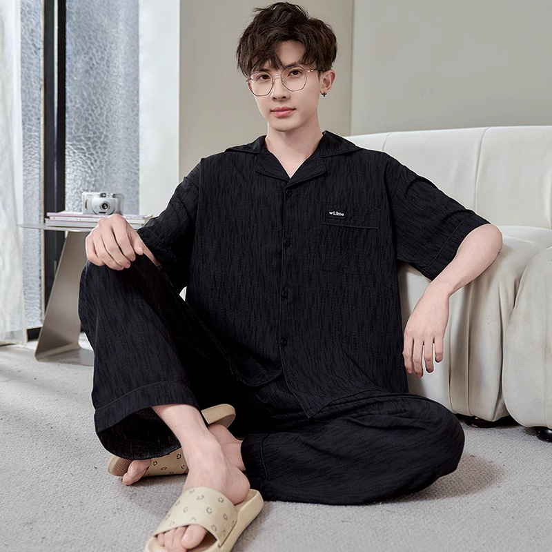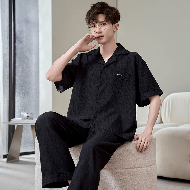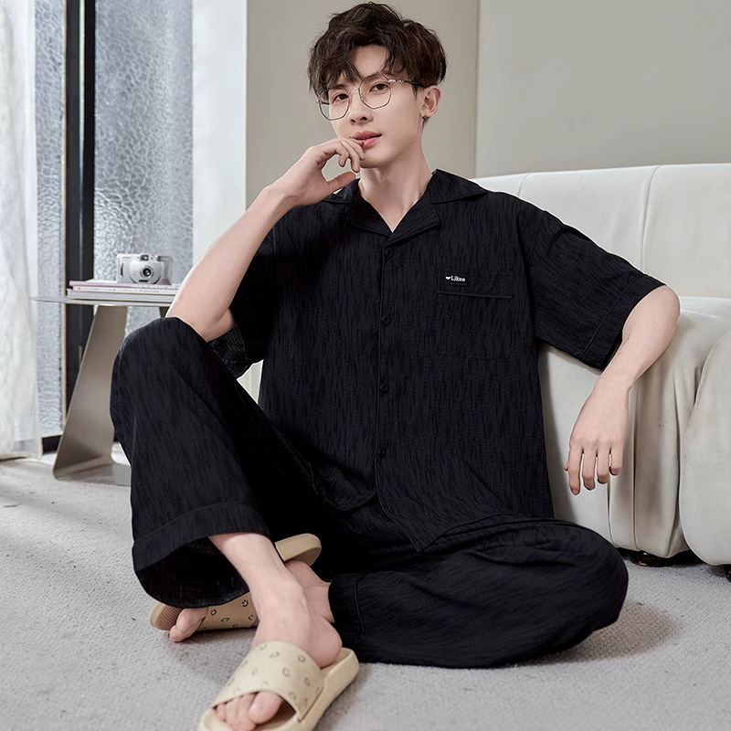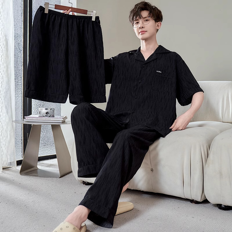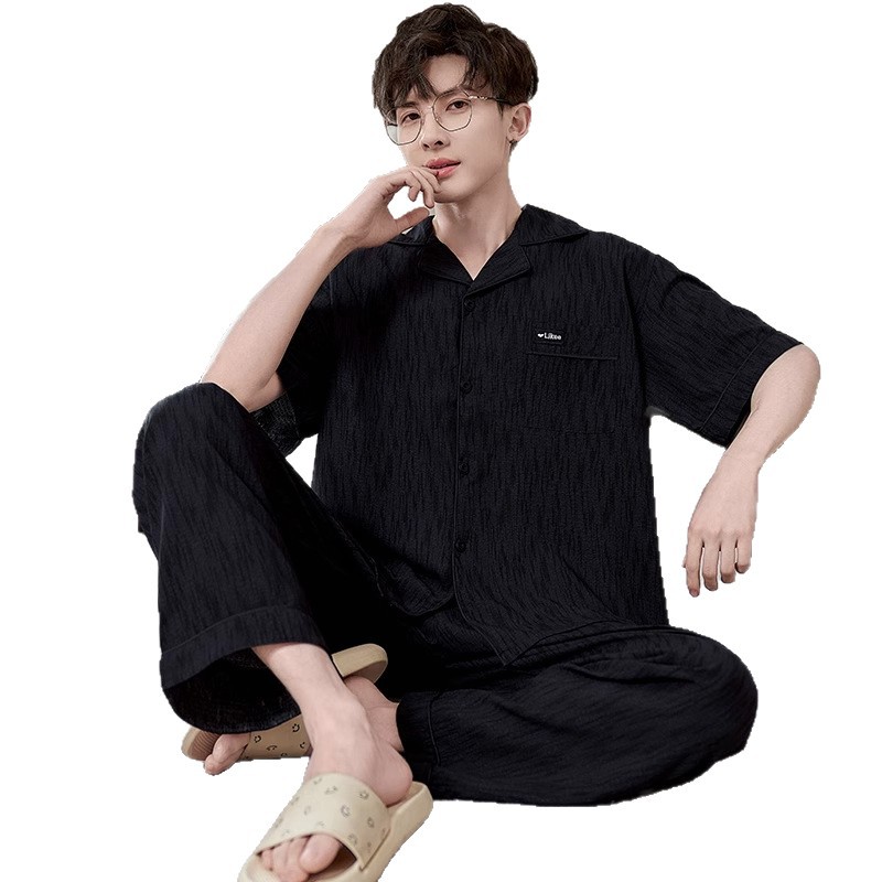 도매 새로운 잠옷 남자 여름 버블 코튼 얇은 반팔 반바지 시원한 느낌 홈웨어 대형 루즈 슈트