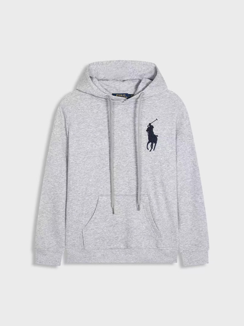 네이비 블루 라지 라벨이 있는 그레이 후드 모델