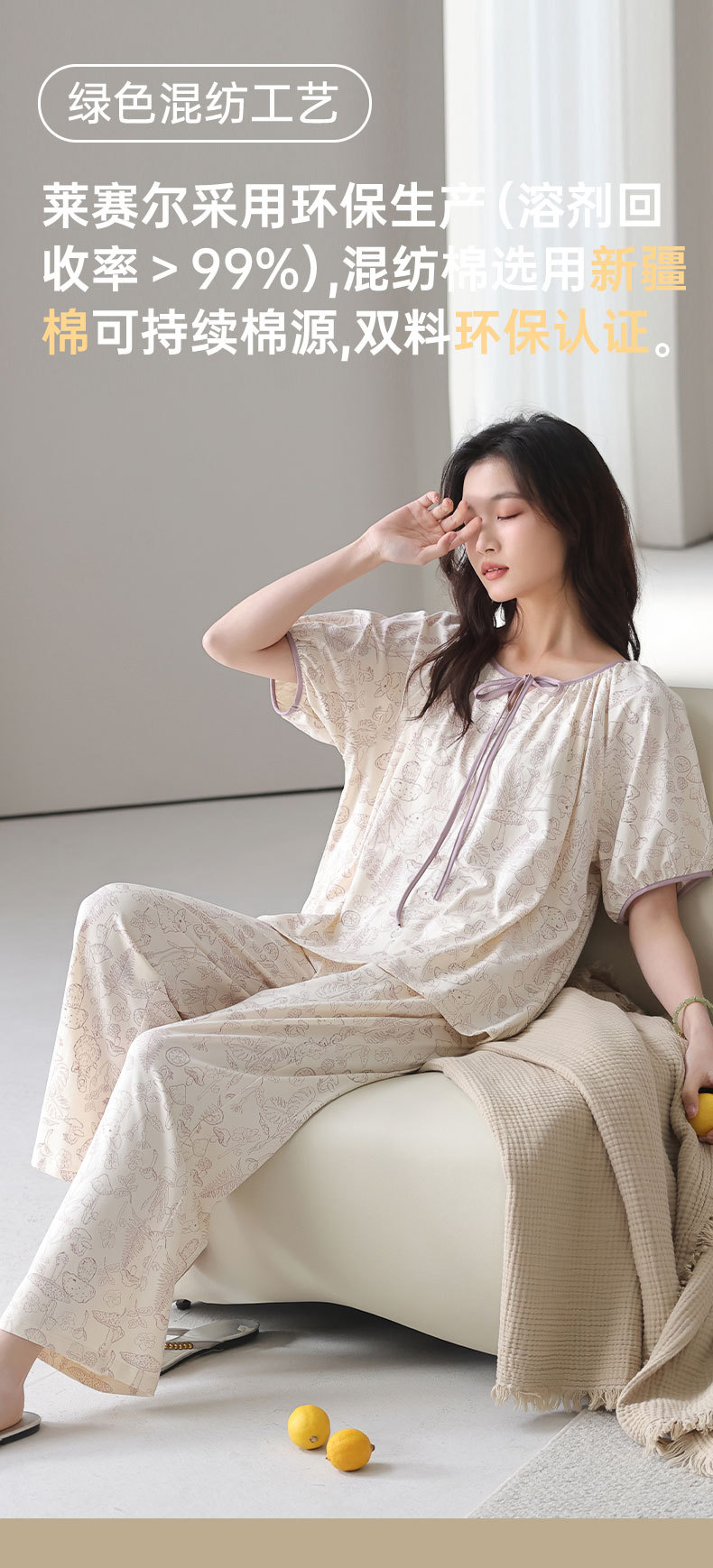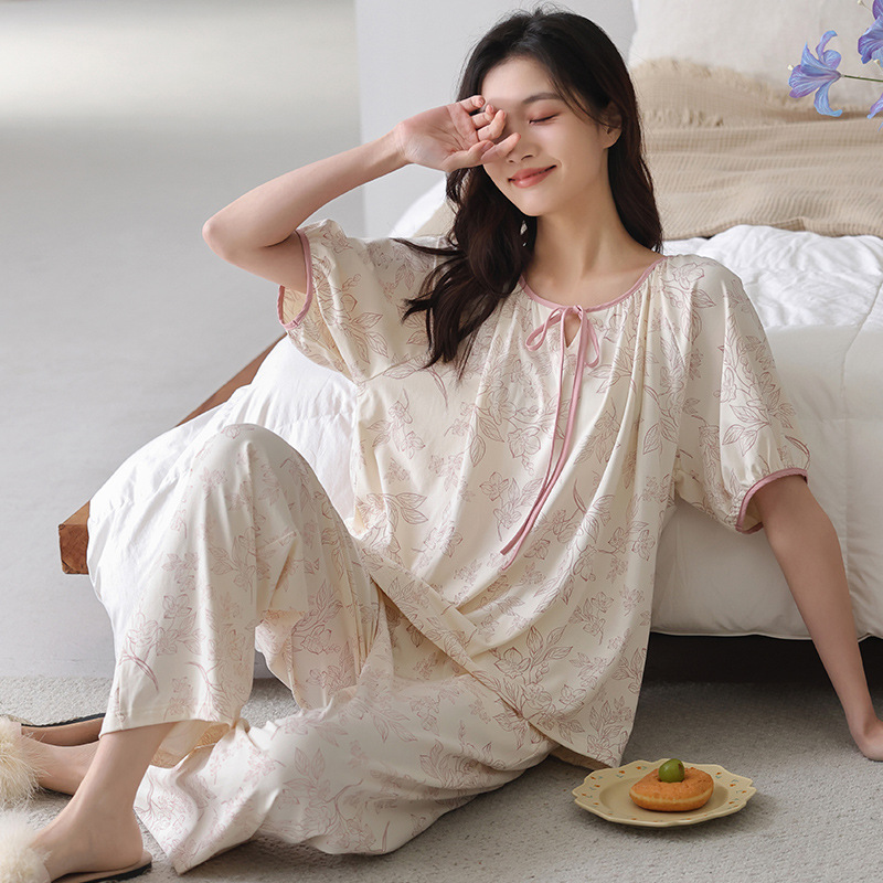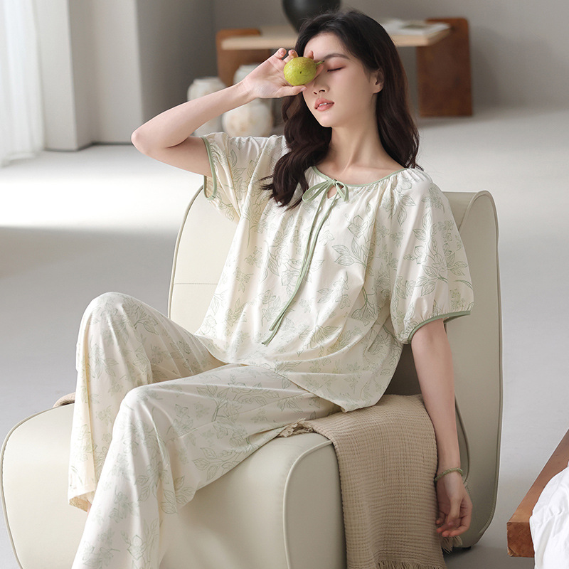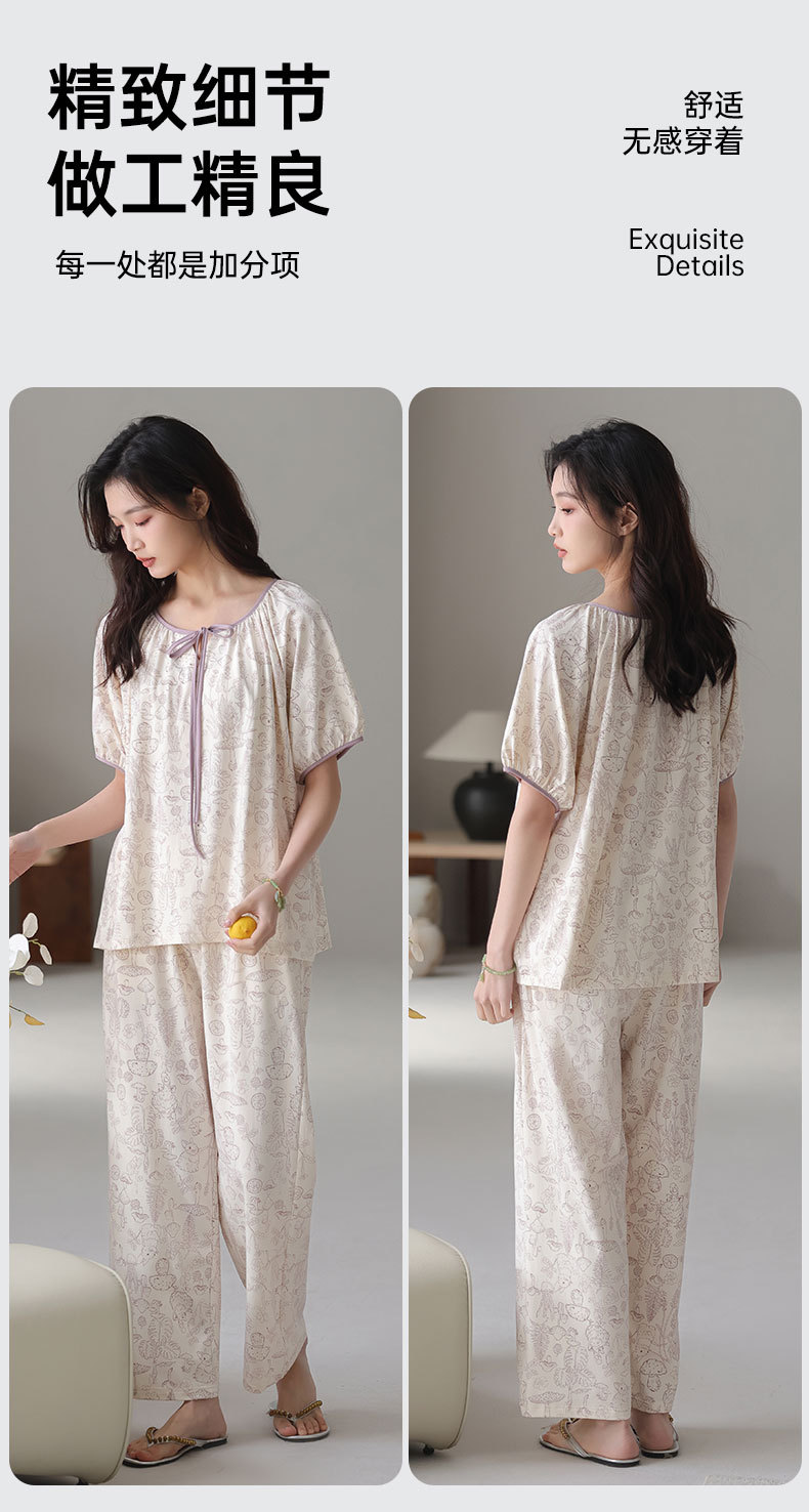 레이셀 잠옷 여성 여름 신상 달콤한 꽃무늬 부드럽고 편안한 반팔 긴바지 외출복 홈웨어 세트