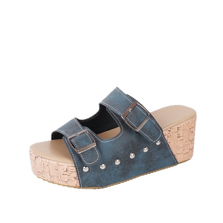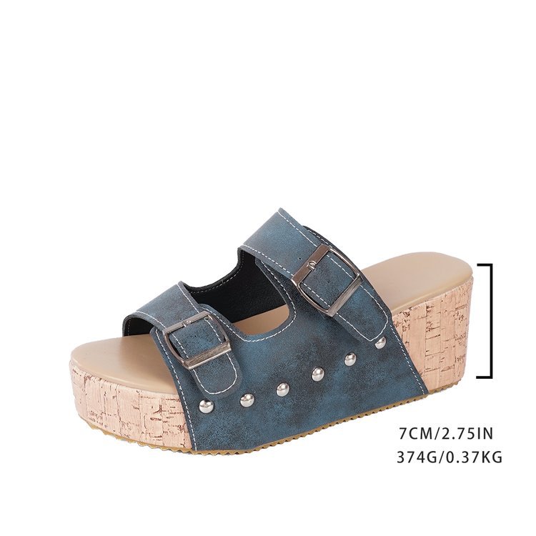 여성을위한 크로스 보더 두꺼운 밑창 웨지 슬리퍼 여성을위한 2025 여름 새로운 스타일 리벳 슈퍼 하이힐 벨트 버클 샌들