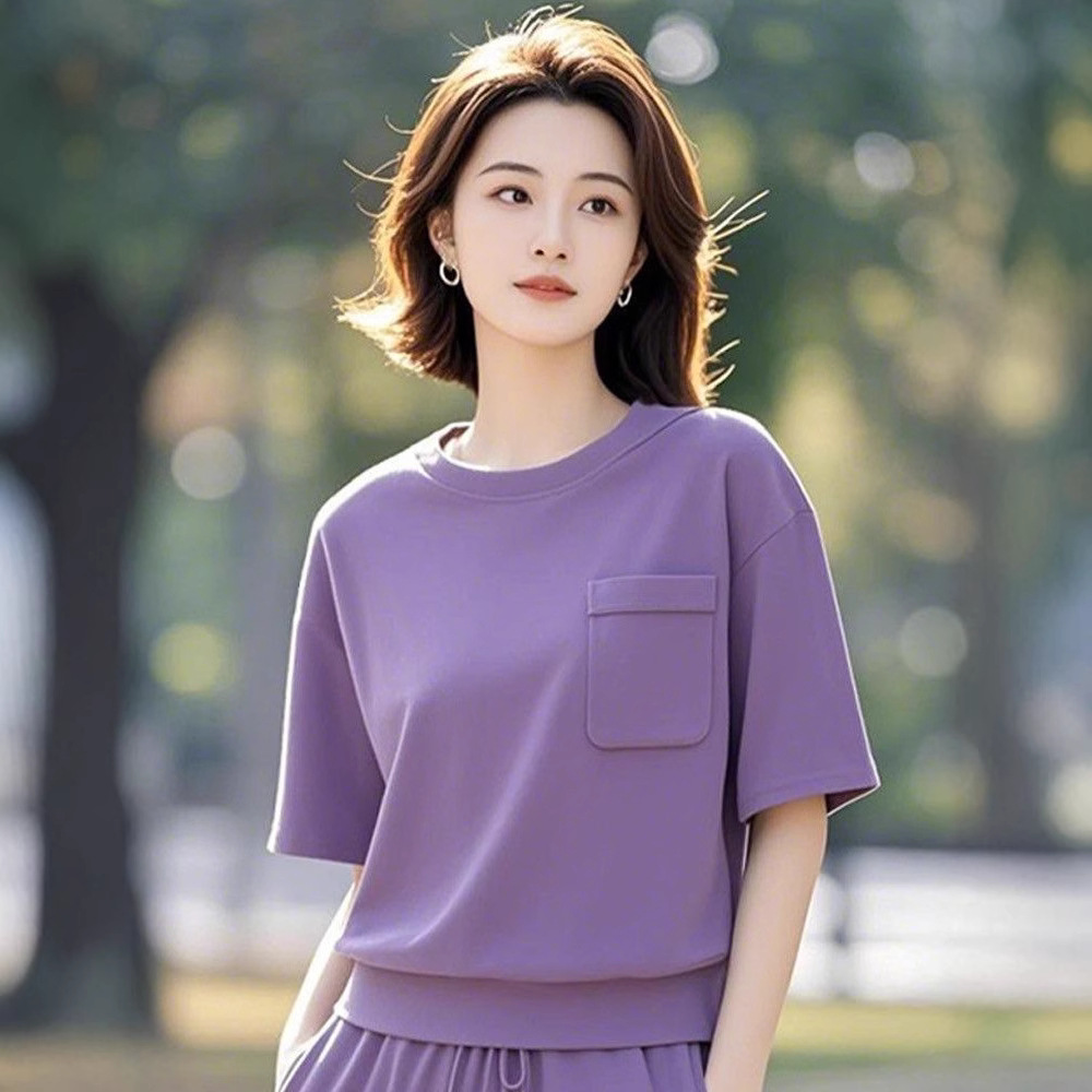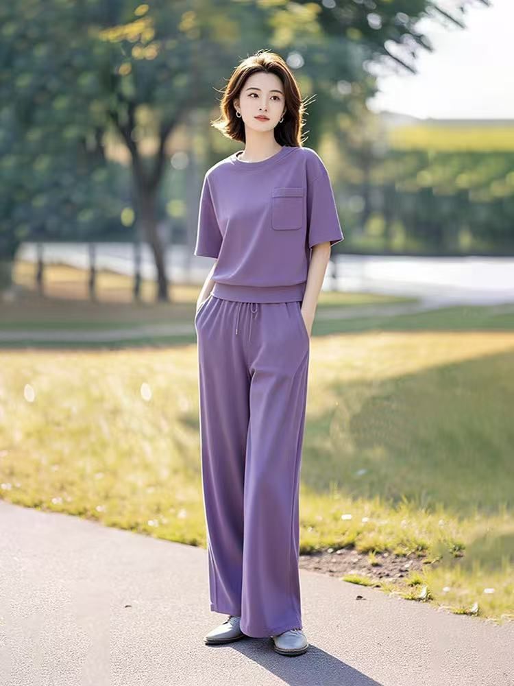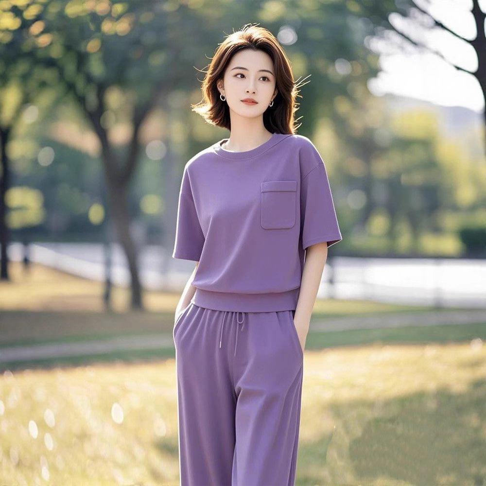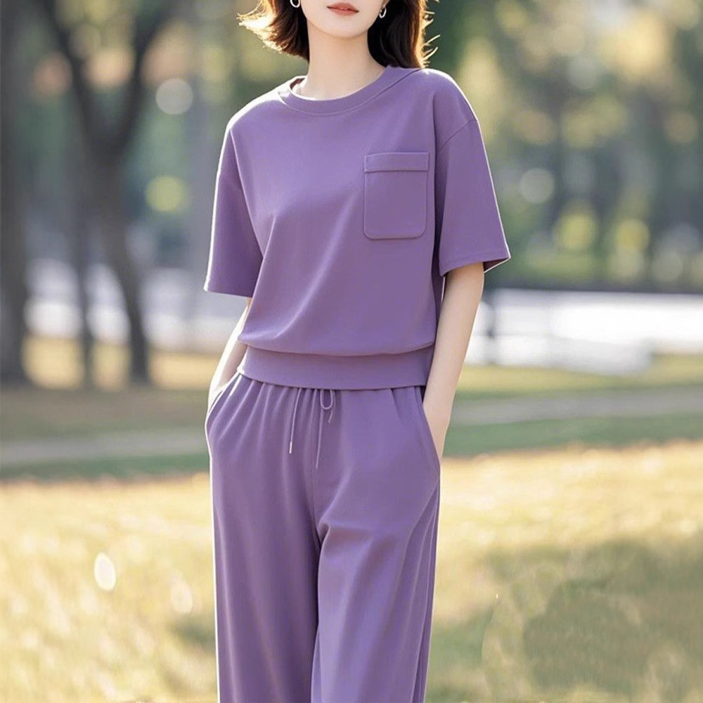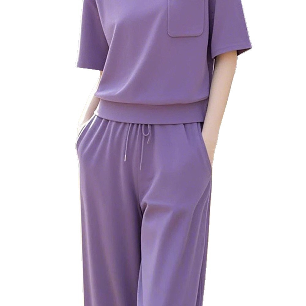 여름 신작 한국 여성 캐주얼 다목적 스포츠 정장 루즈한 반팔 티셔츠 와이드 팬츠 투피스 트렌디 세트