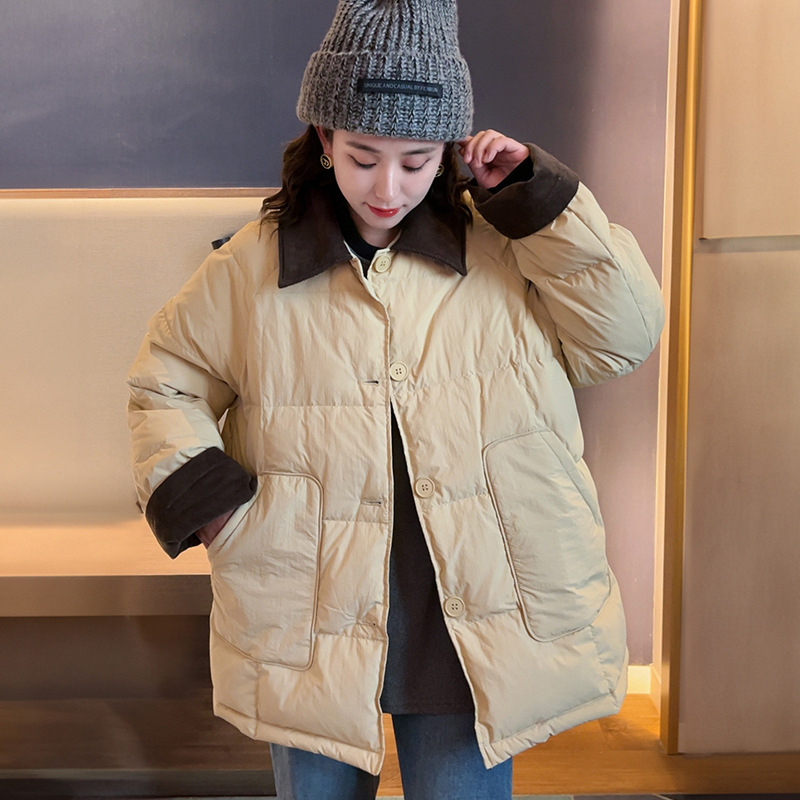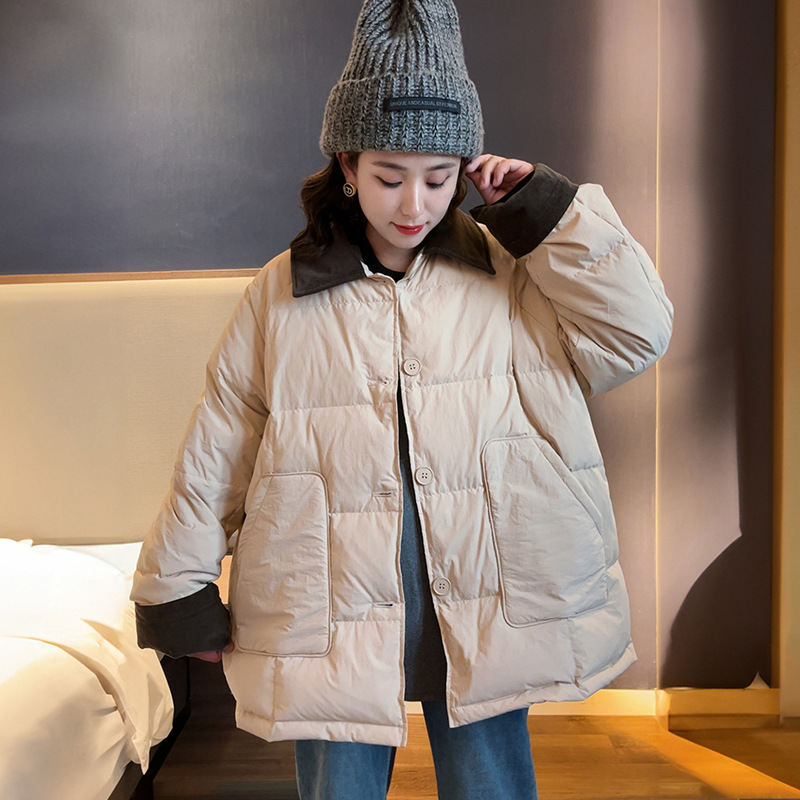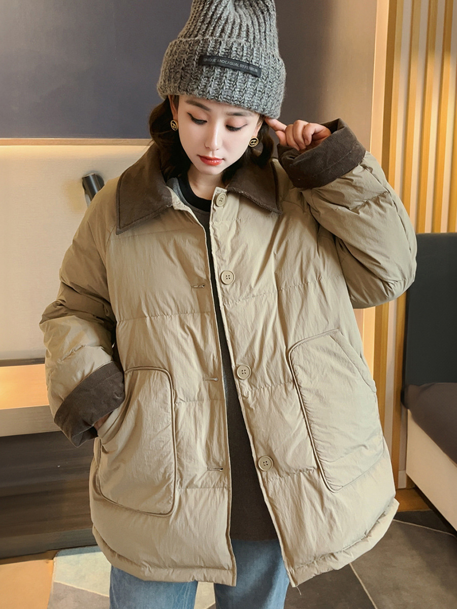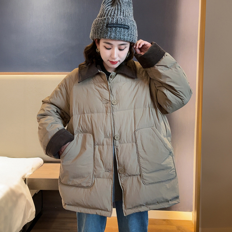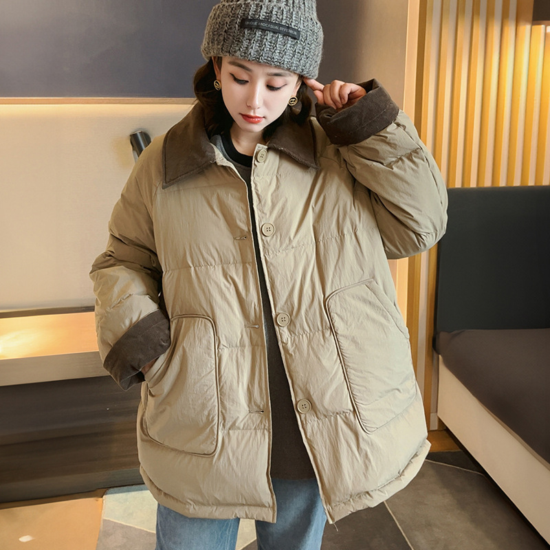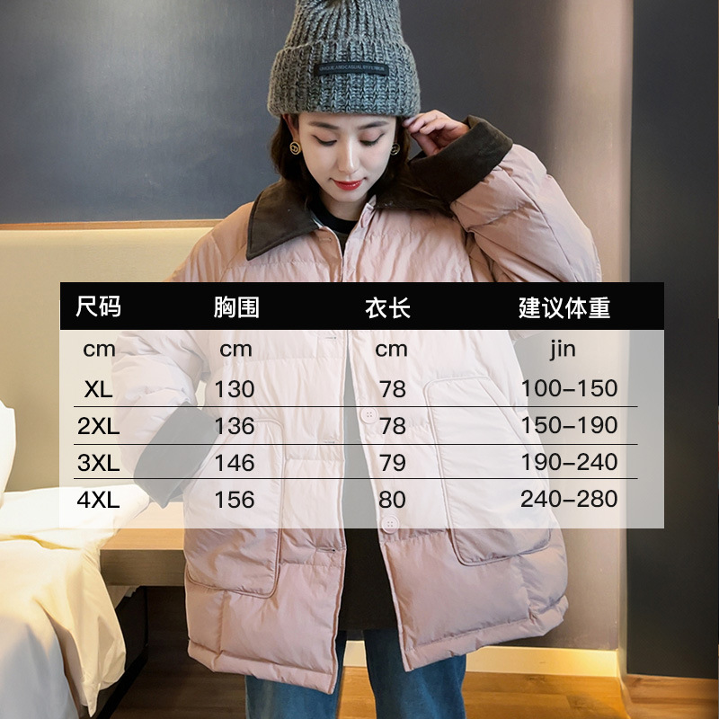플러스 사이즈 다운 재킷 여성 100kg 코듀로이 스티치 패션 외국 스타일 화이트 오리 다운 따뜻한 가을 겨울 새 코트