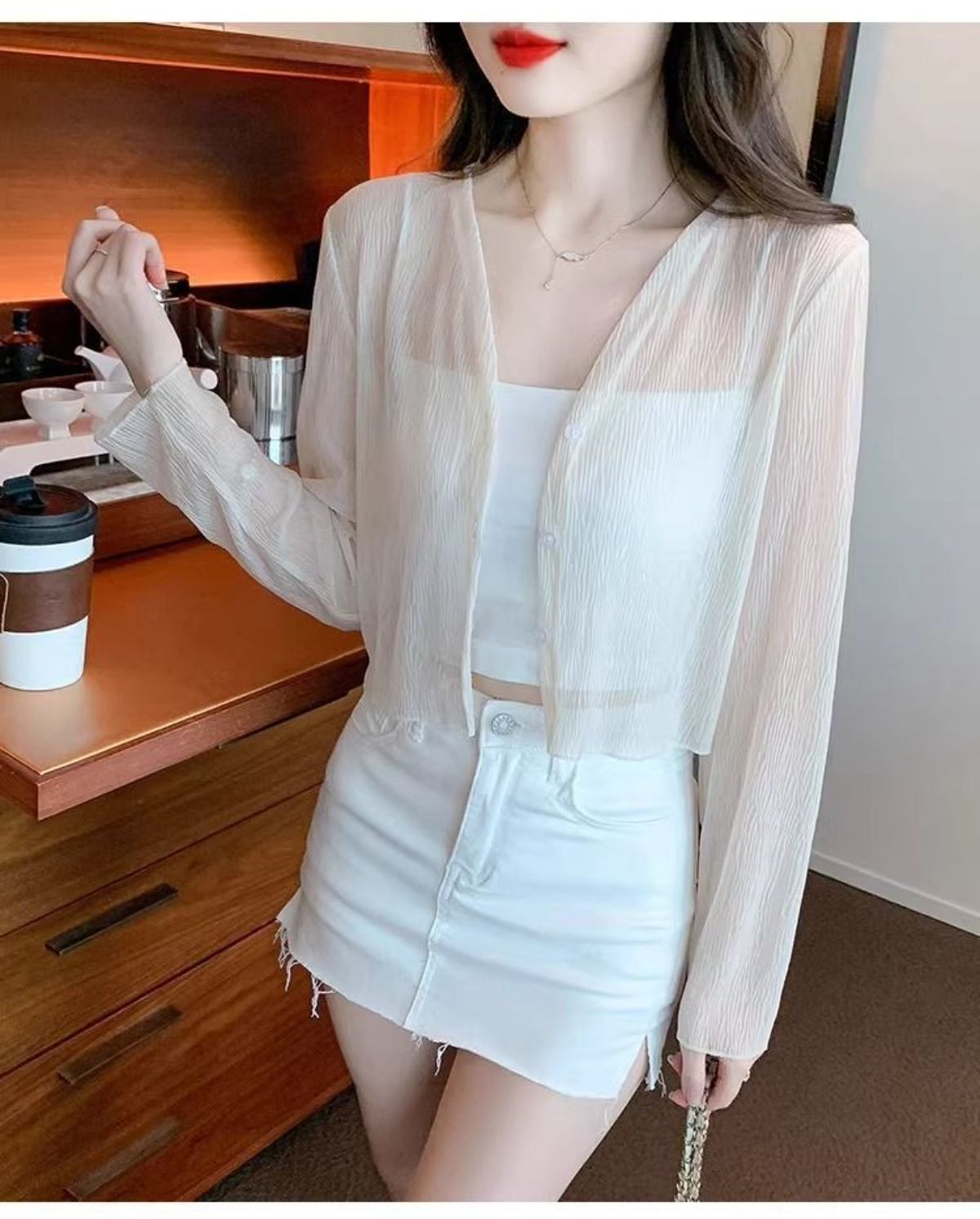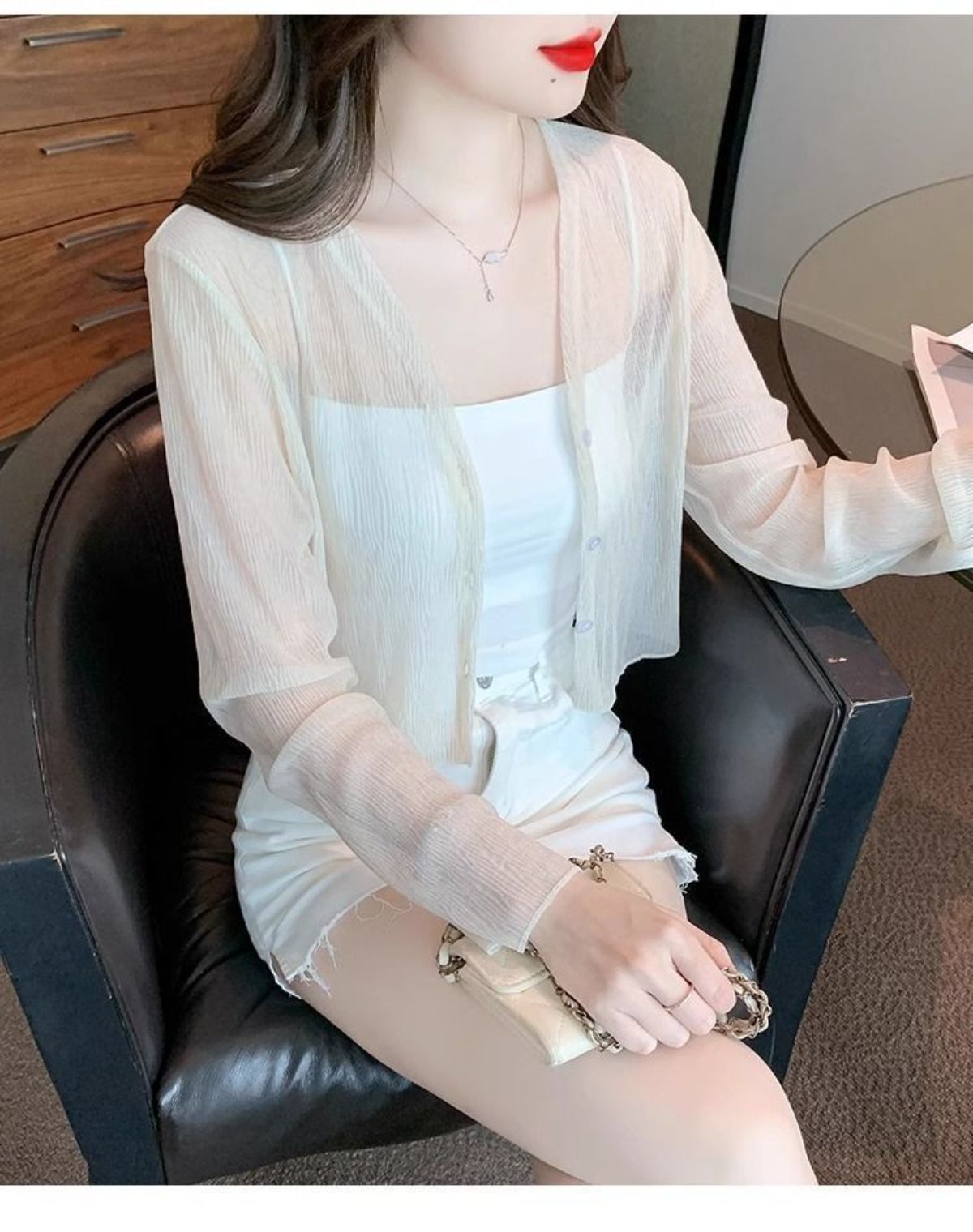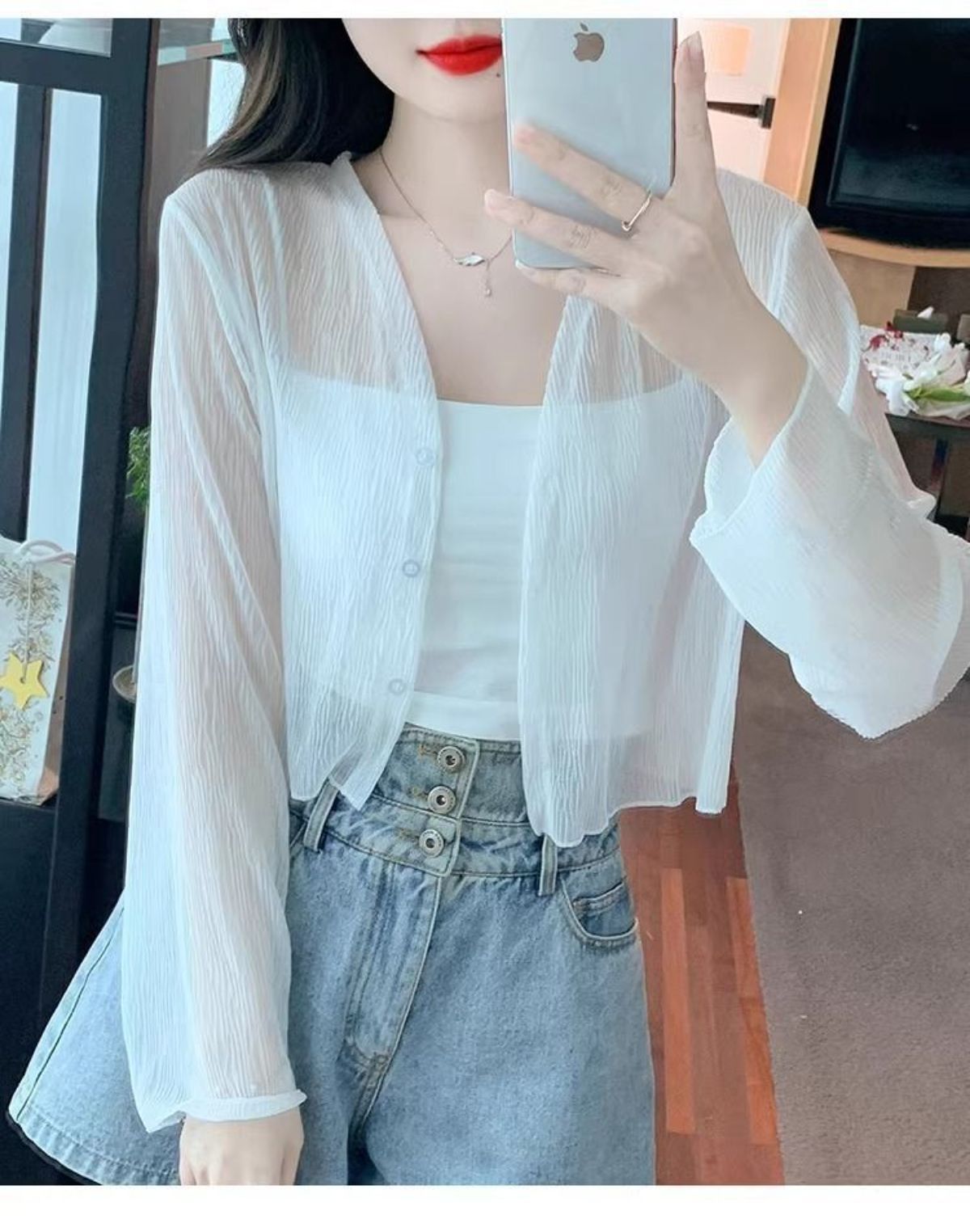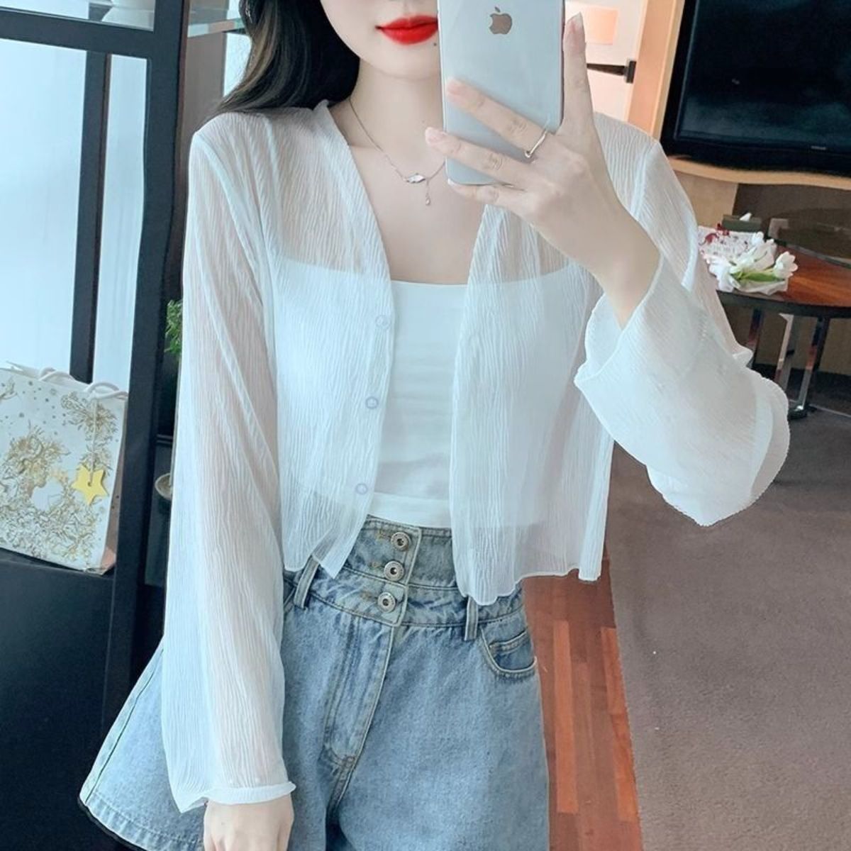 여름 25 새로운 스타일의 여성용 아이스 실크 자외선 차단 의류, 쉬폰 가디건, 작은 숄, 블라우스, 레이스 얇은 짧은 코트