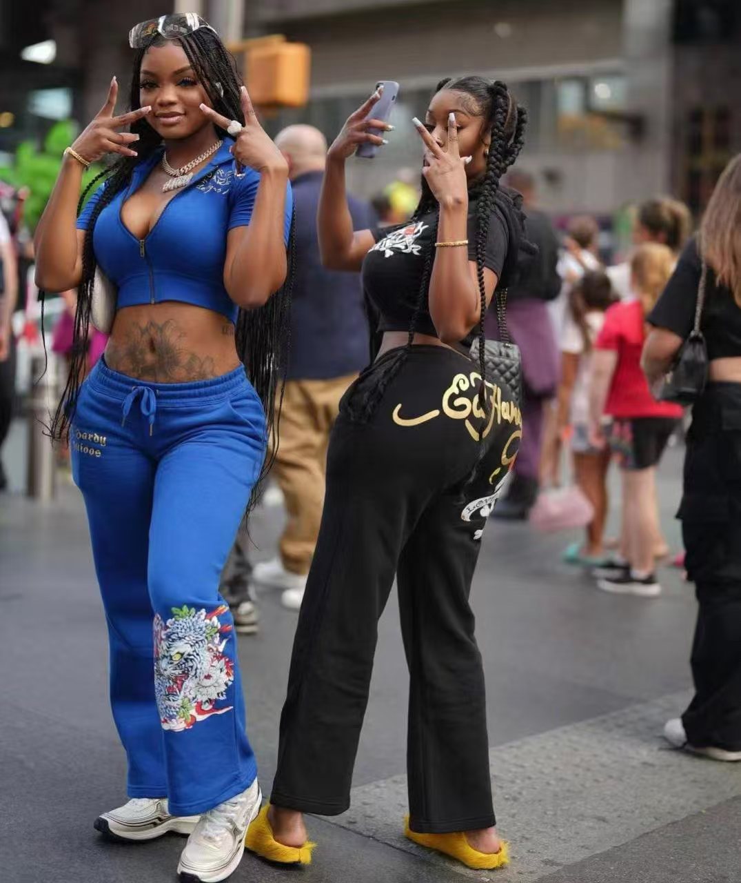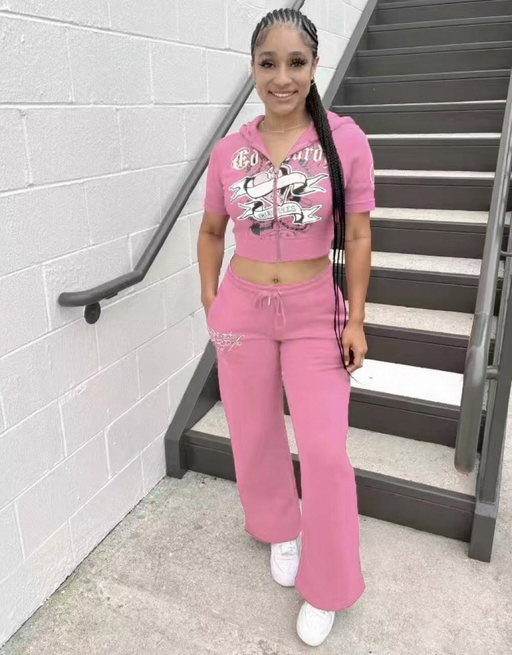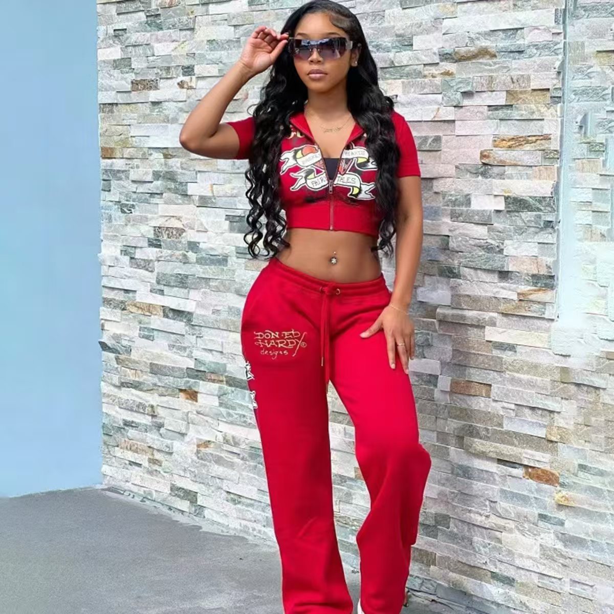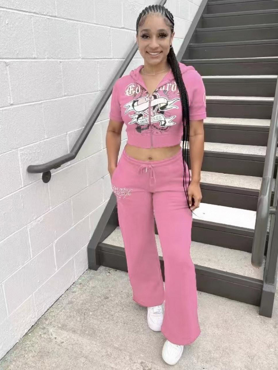 유럽과 미국의 국경 간 포지셔닝 프린트 핫 소녀 반팔 배꼽 노출 문자 스포츠 바지 정장