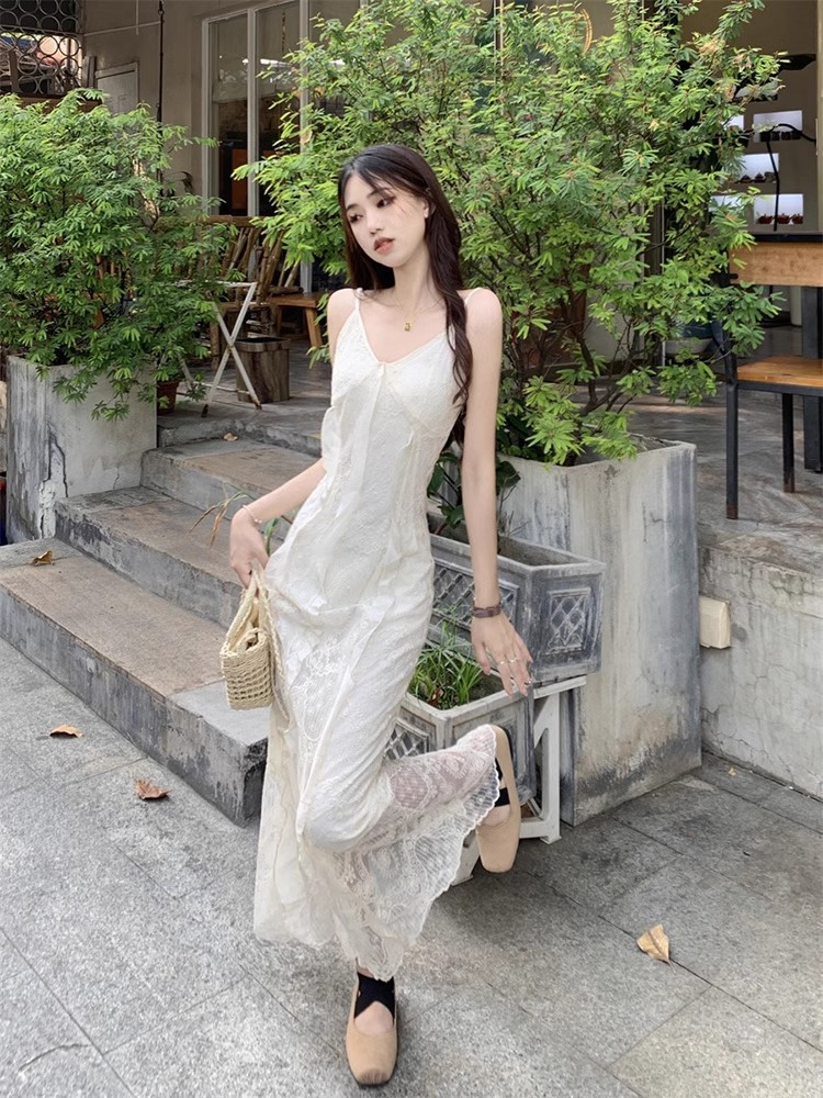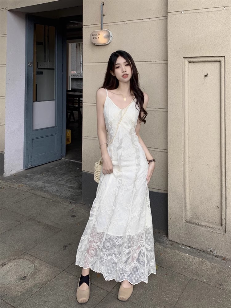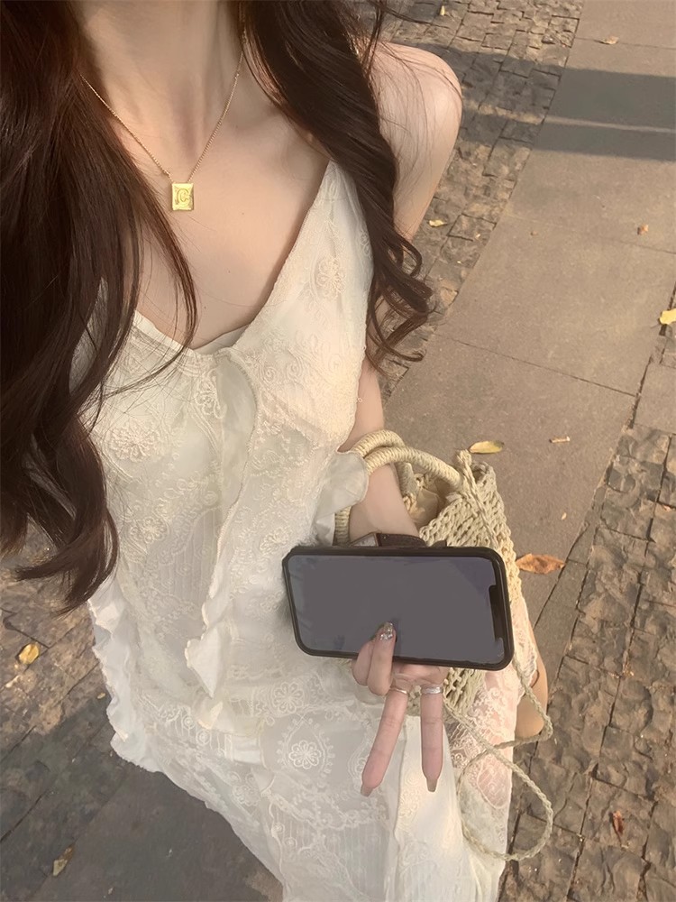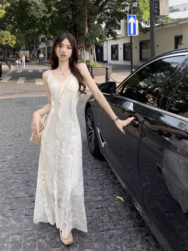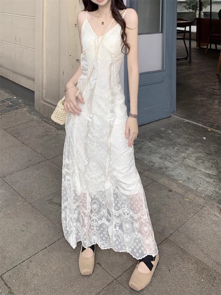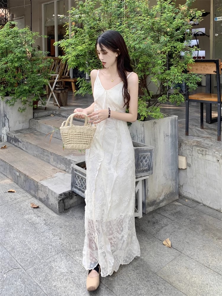 V-Neck 레이스 슬링 원피스 여성 여름 해변 휴가 사진 비치 스커트 프랑스 스타일 우아한 웨이스트 원피스