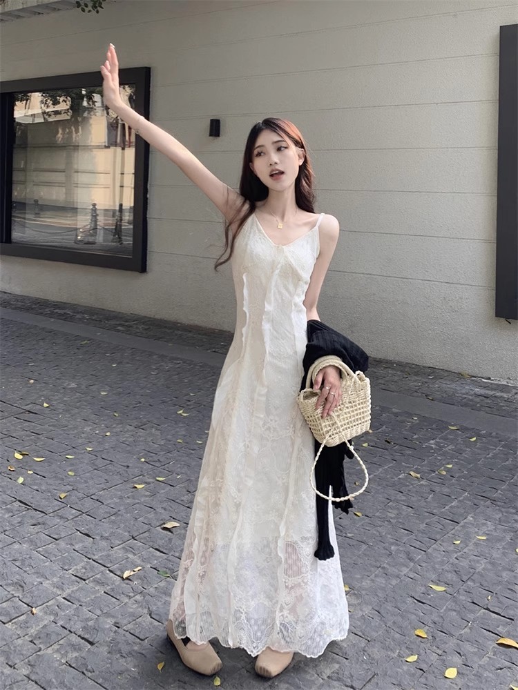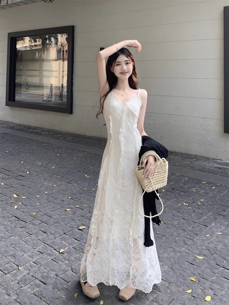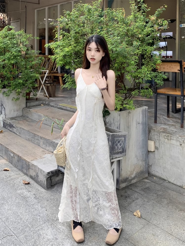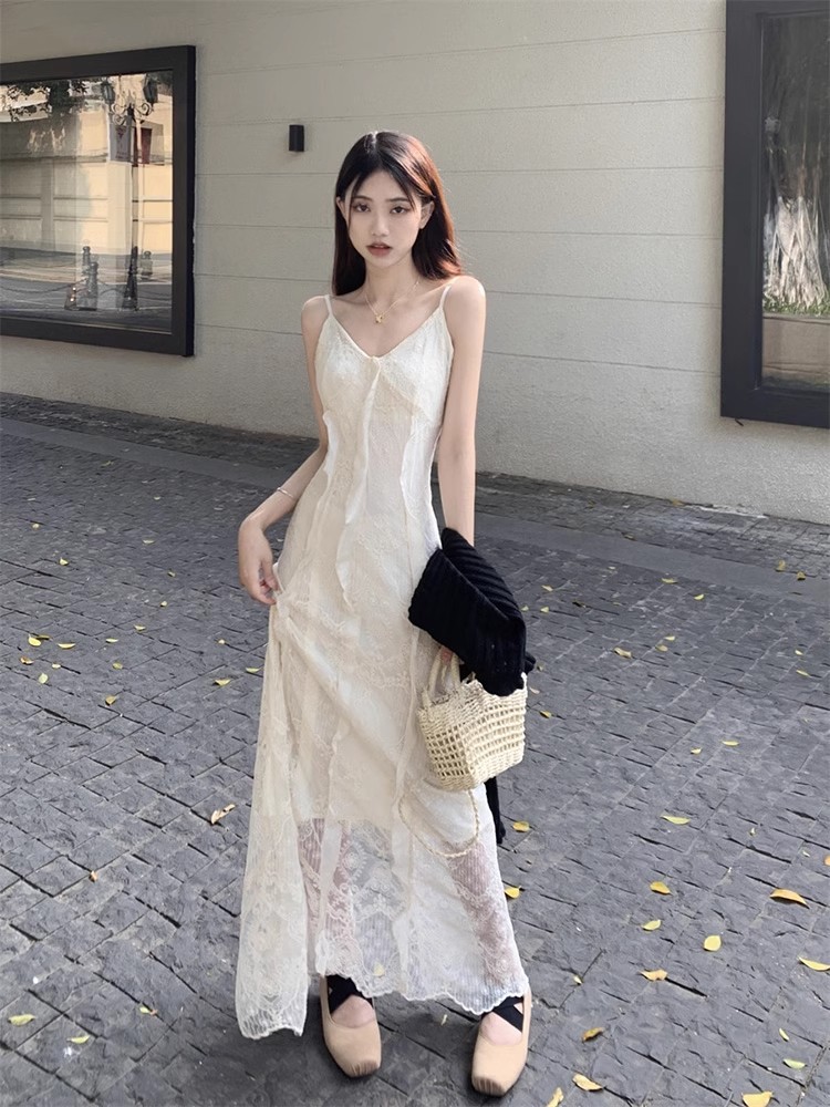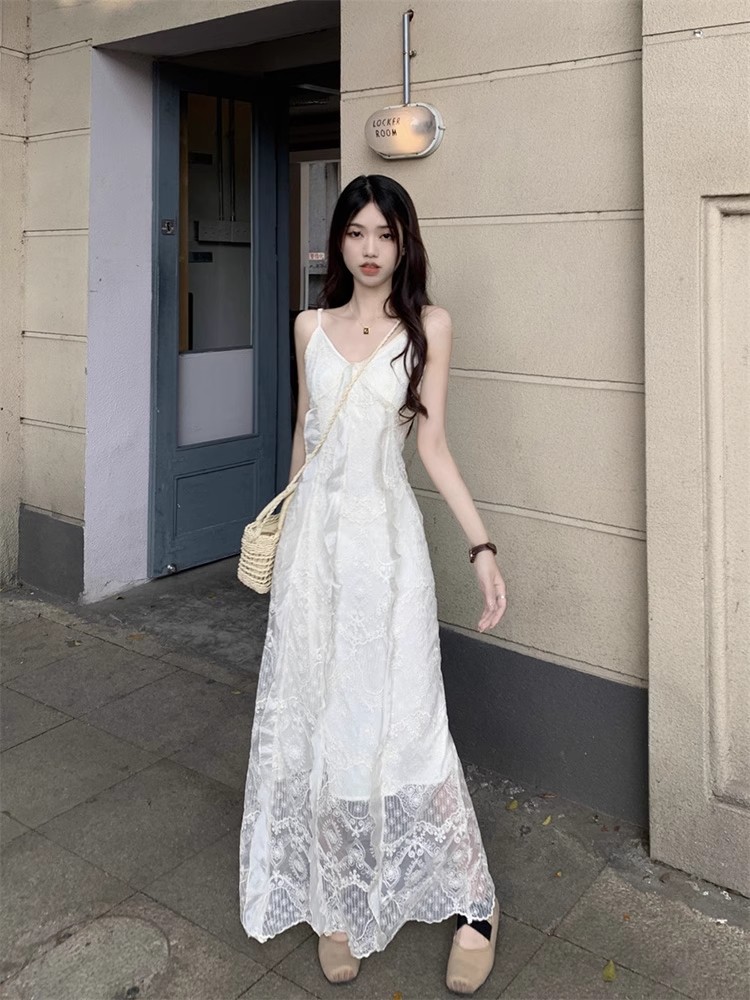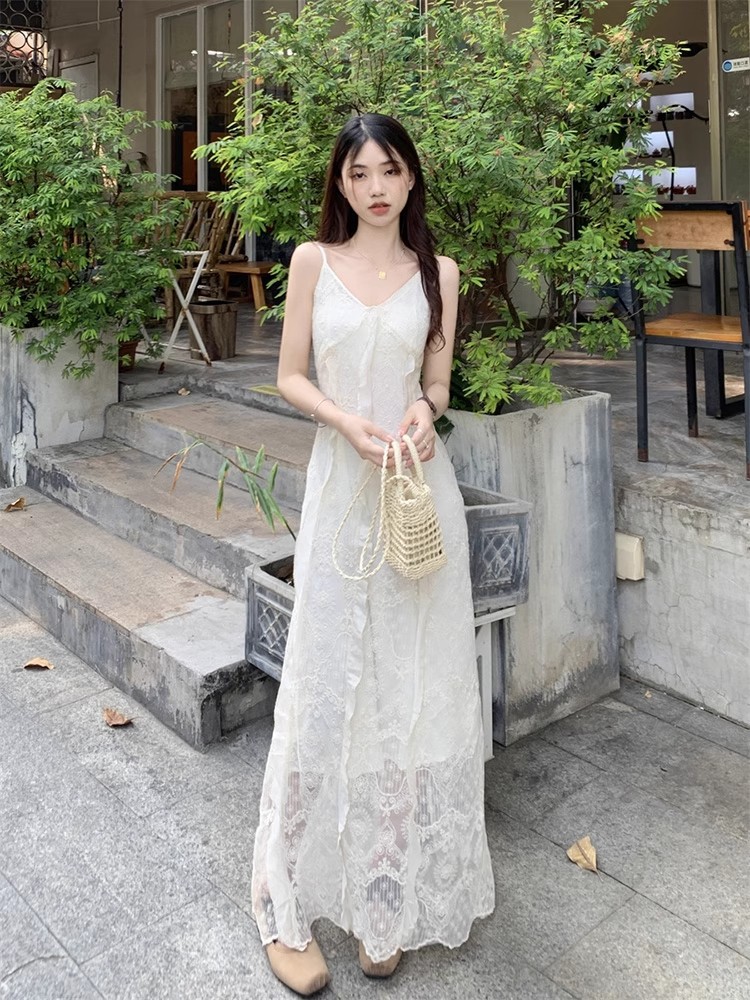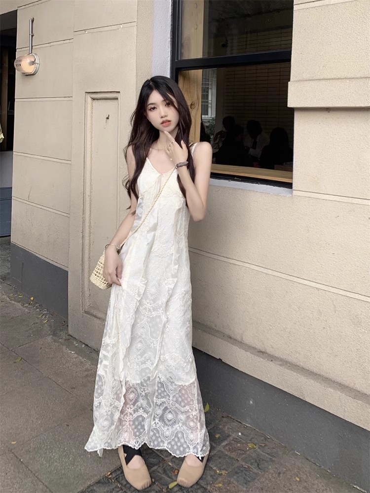 V-Neck 레이스 슬링 원피스 여성 여름 해변 휴가 사진 비치 스커트 프랑스 스타일 우아한 웨이스트 원피스