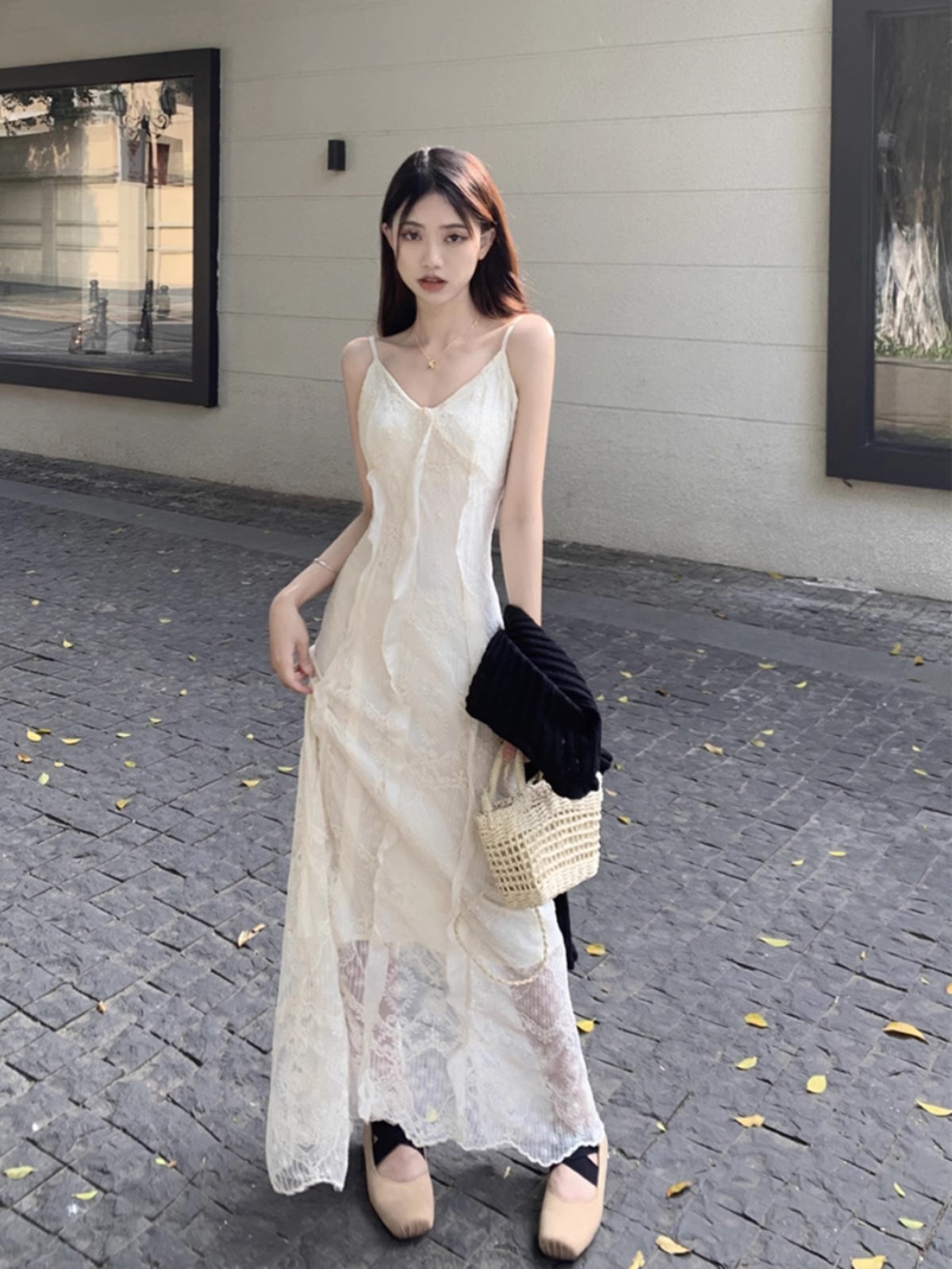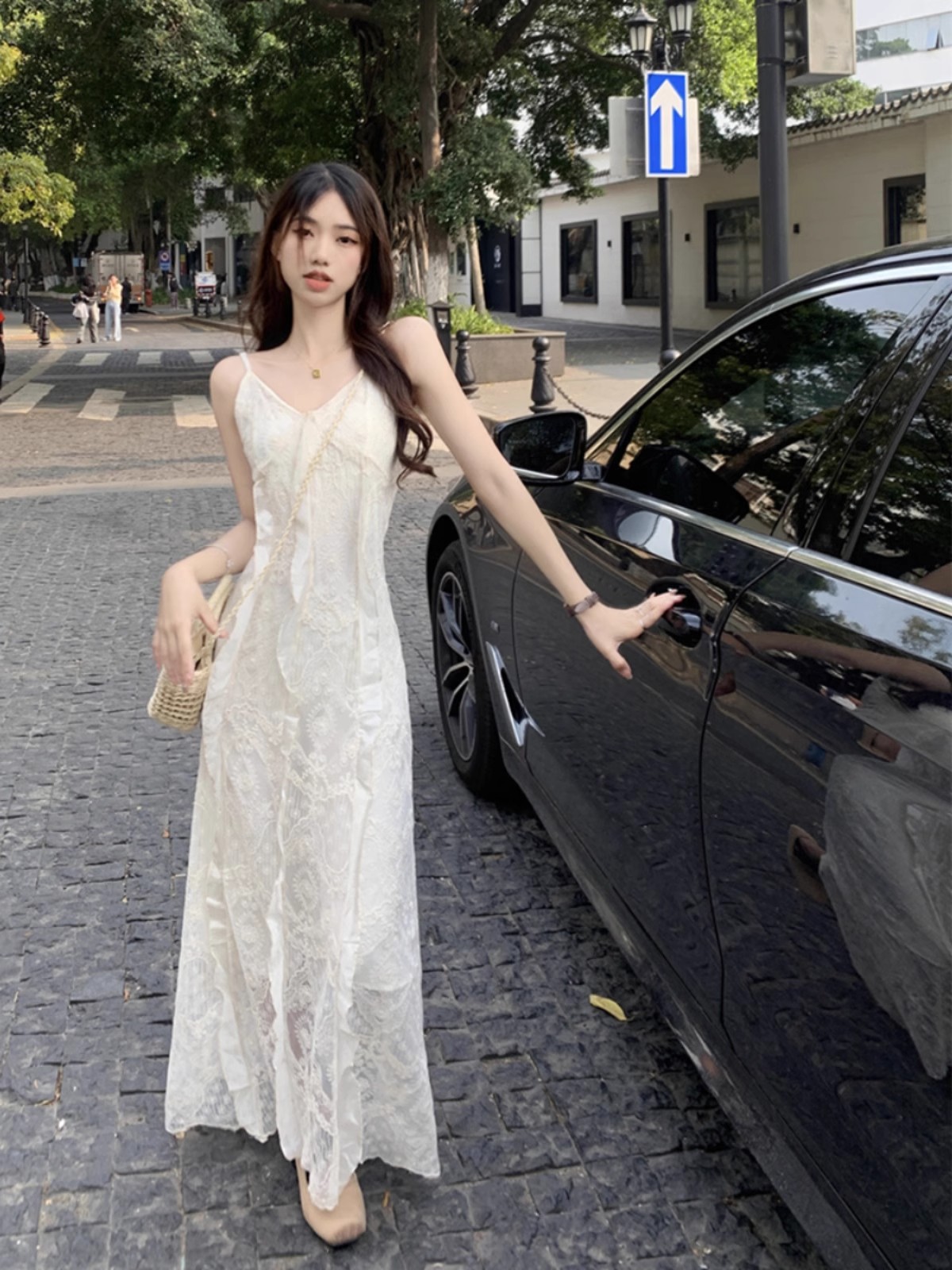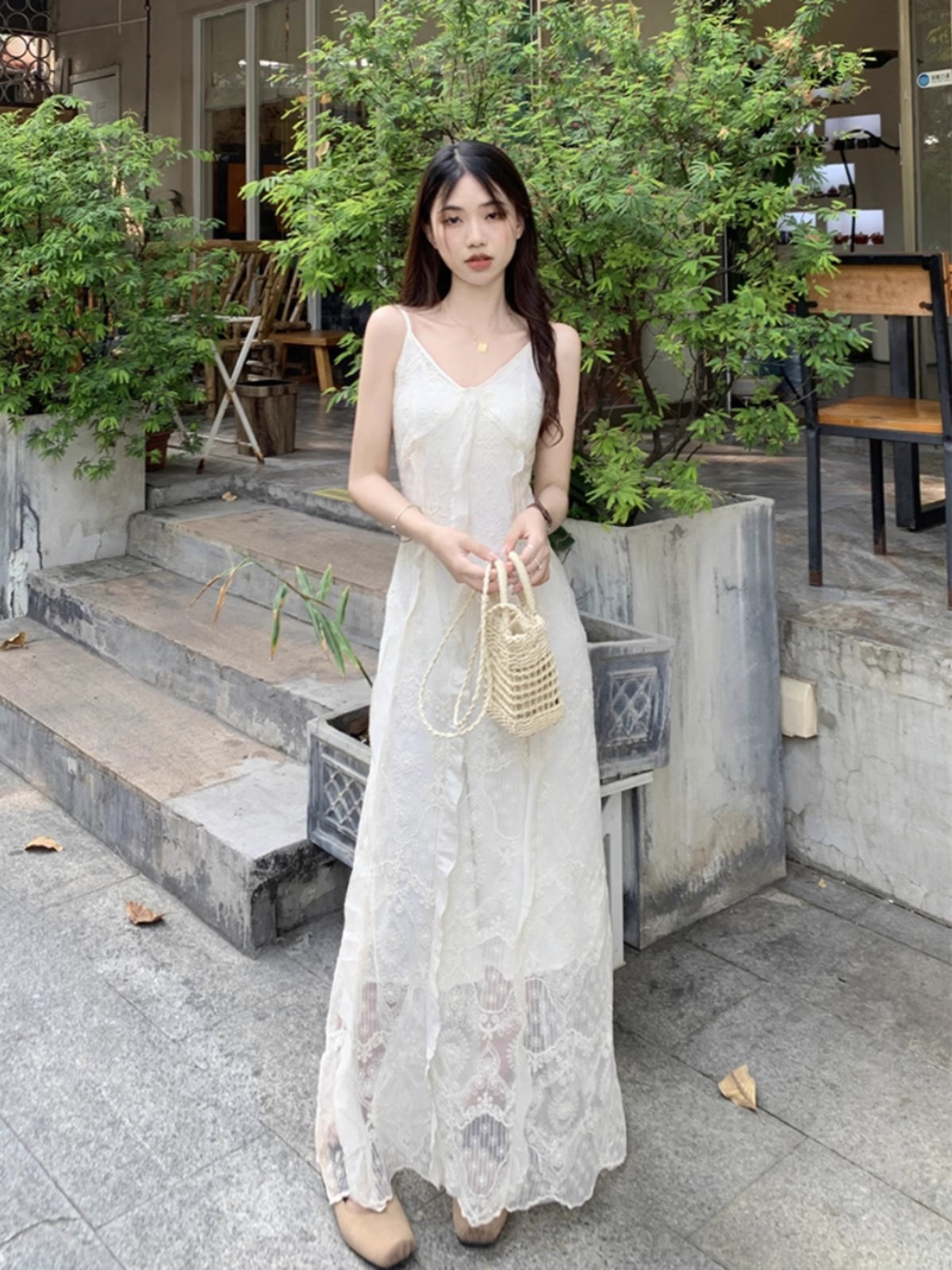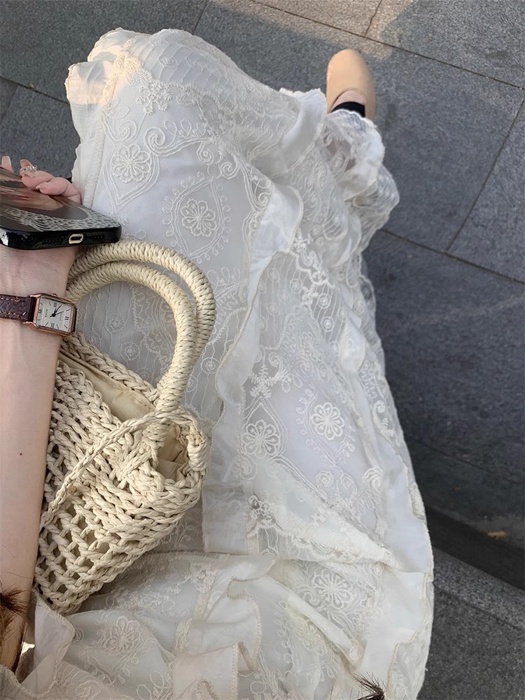 V-Neck 레이스 슬링 원피스 여성 여름 해변 휴가 사진 비치 스커트 프랑스 스타일 우아한 웨이스트 원피스