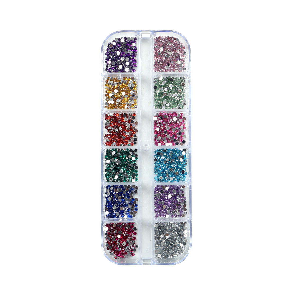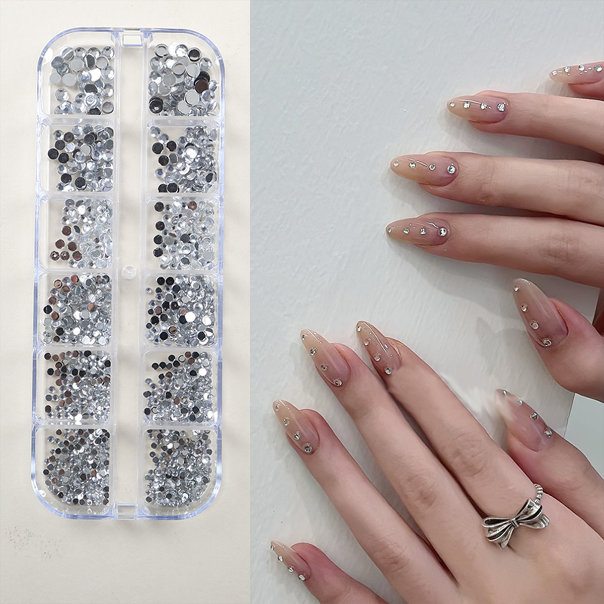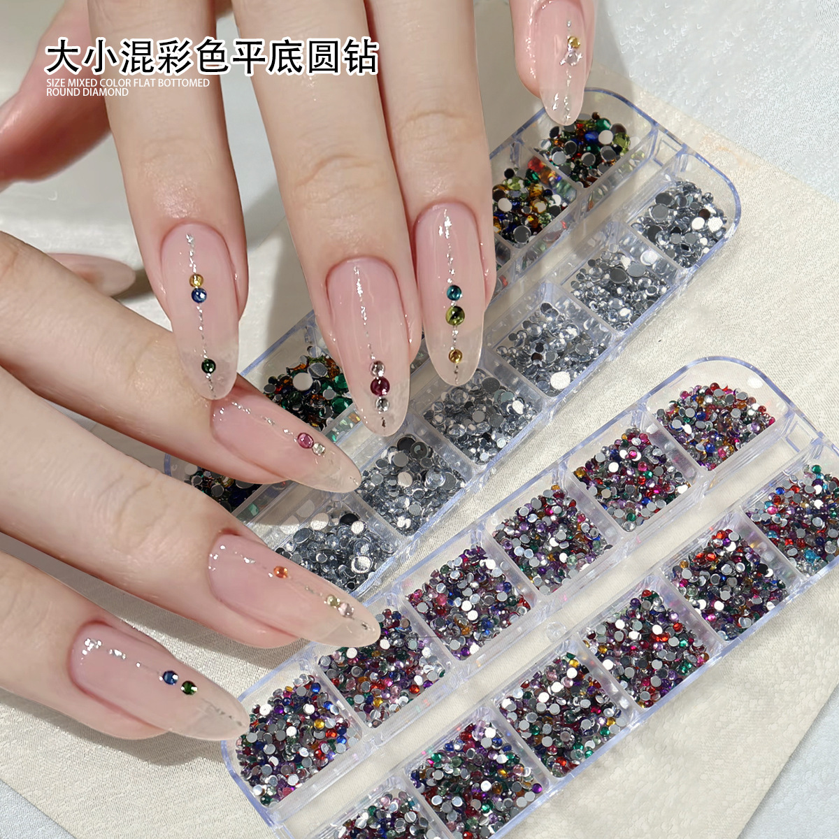 2025년 크로스보더 12칸 박스형 네일아트 주얼리, 혼합 사이즈, 컬러, 슈퍼 플래시 플랫 바닥 라운드 다이아몬드 네일 스티커 및 다이아몬드 주얼리