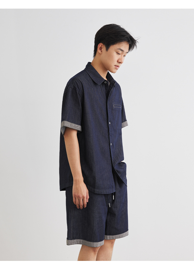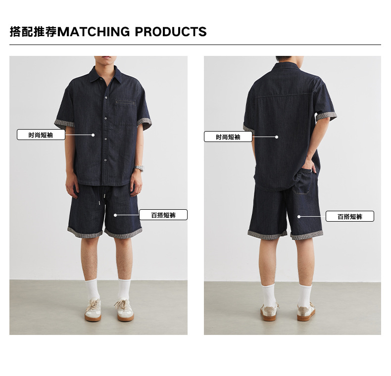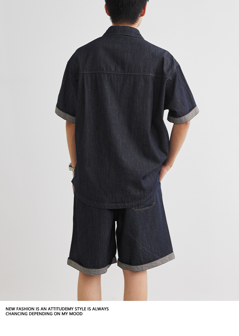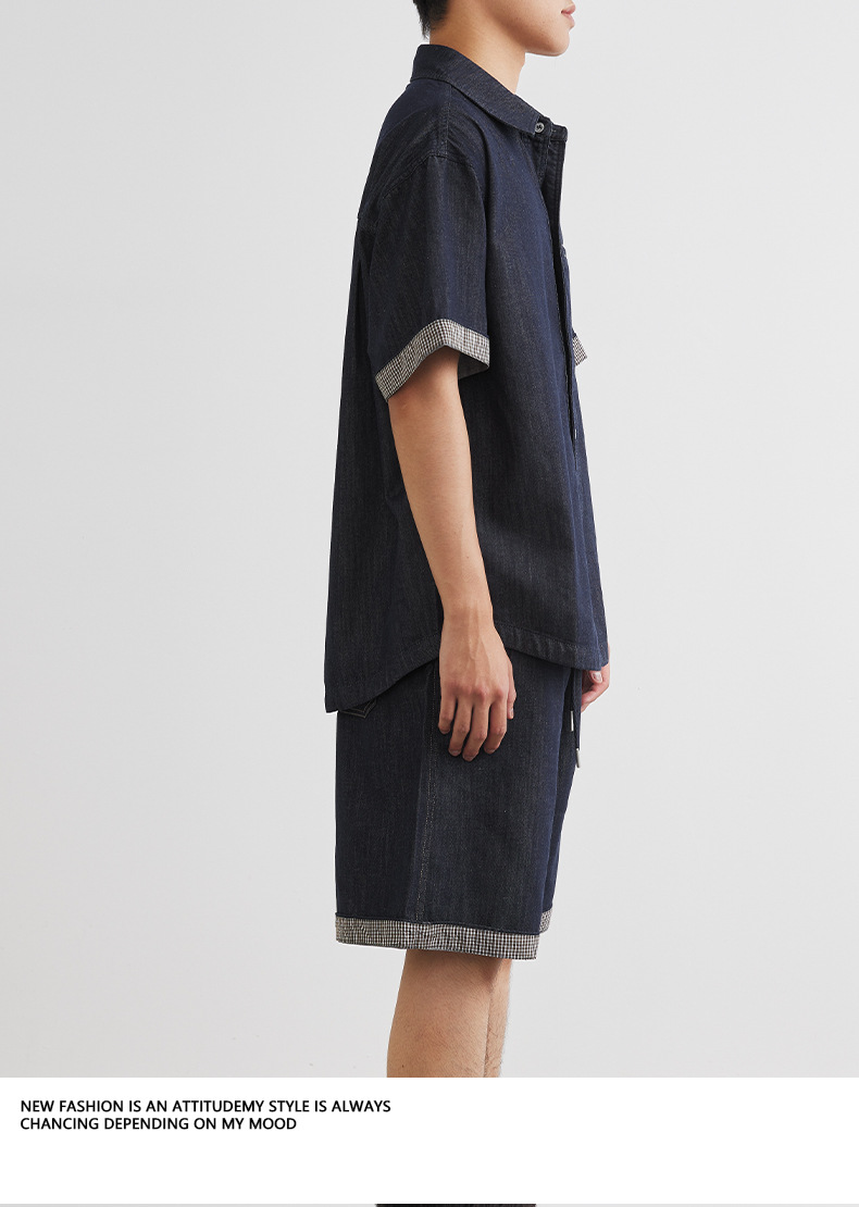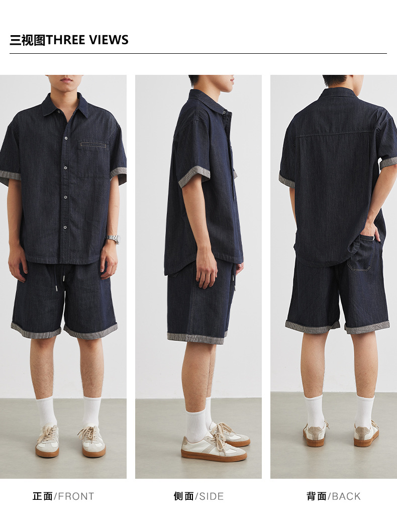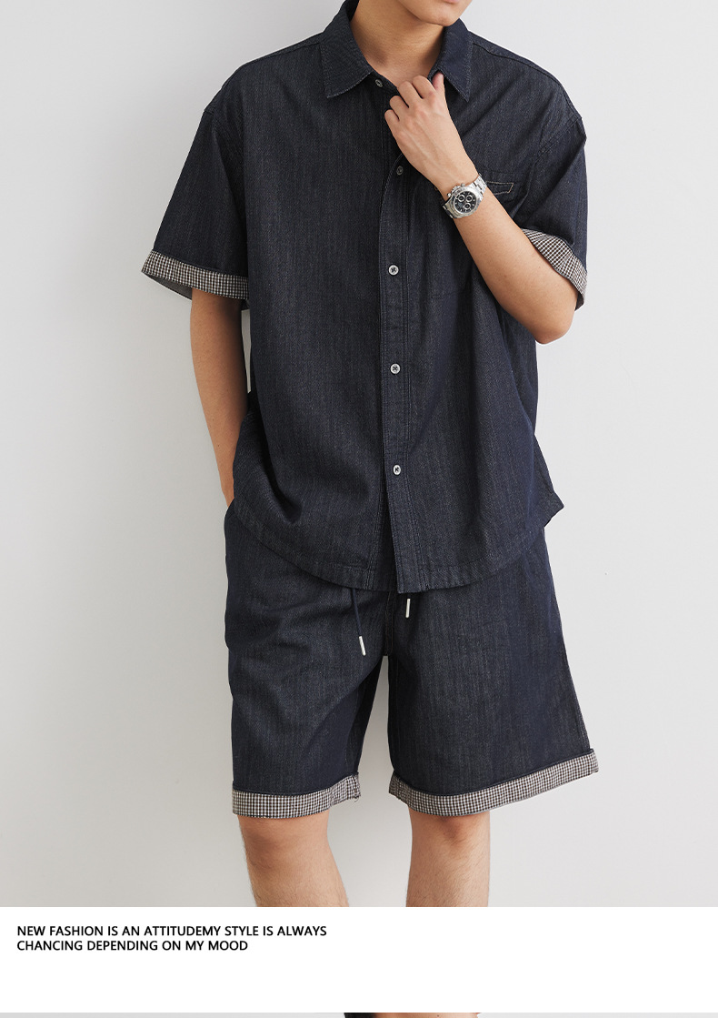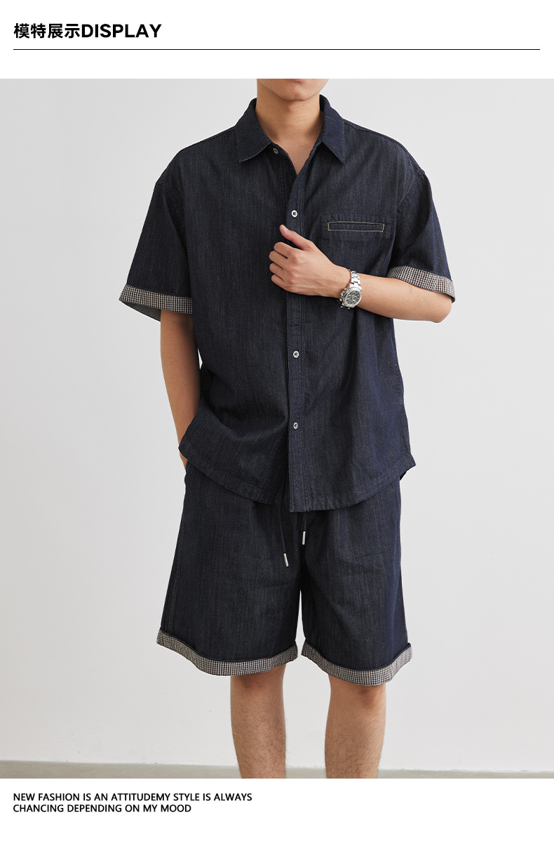 또한 남성용 데님 세트 반팔 셔츠 남성용 새 여름 캐주얼 셔츠 데님 반바지 2 세트