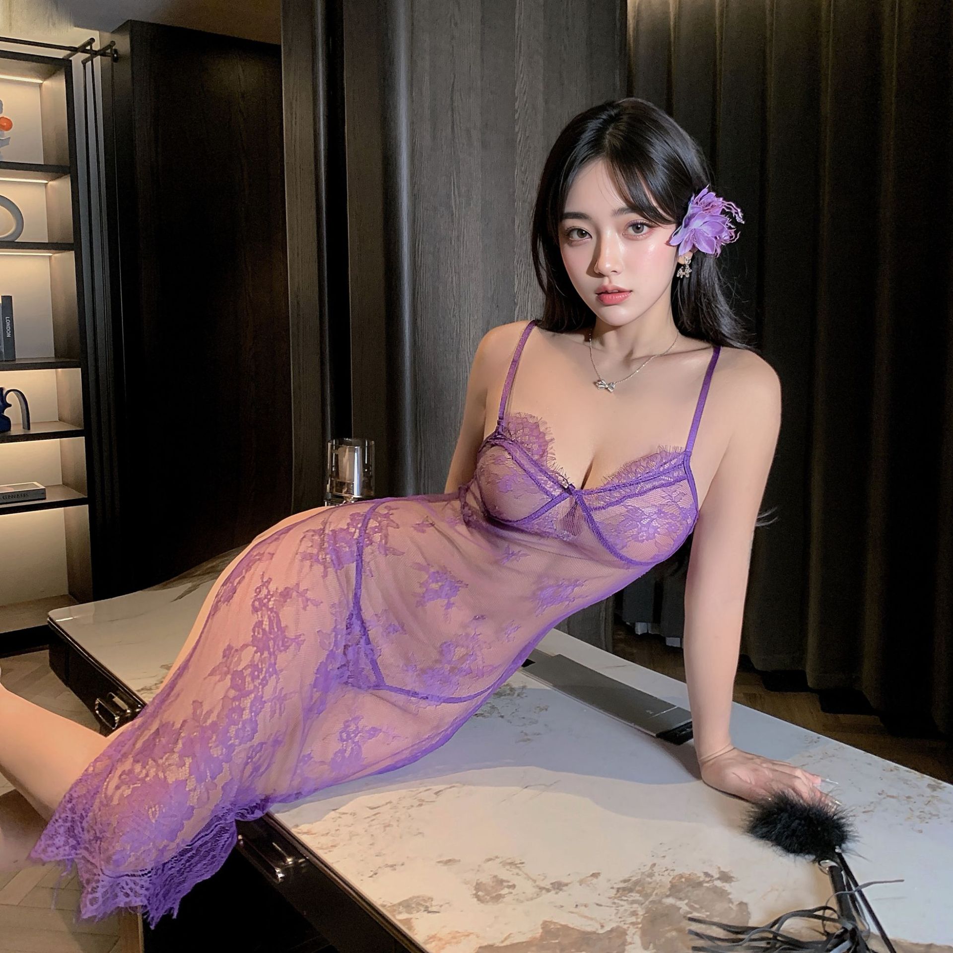 야간 섹시 속옷, 보라색 서스펜더 잠옷 세트, 섹시한 레이스 유니폼, 유혹적인 시스루 원피스