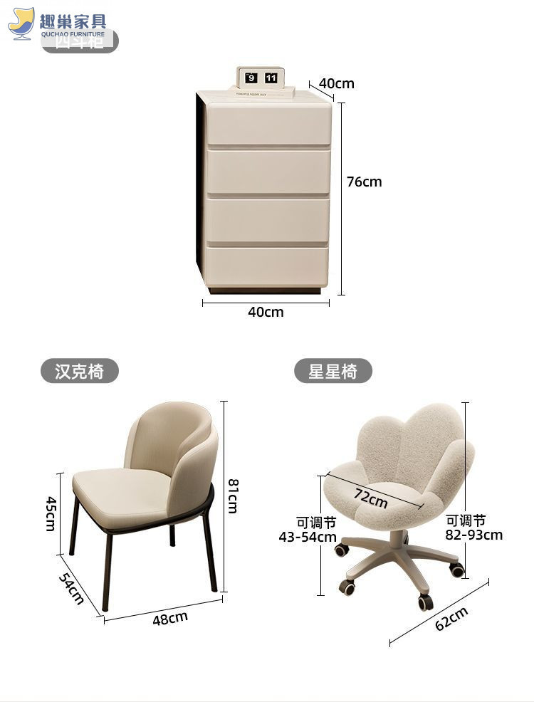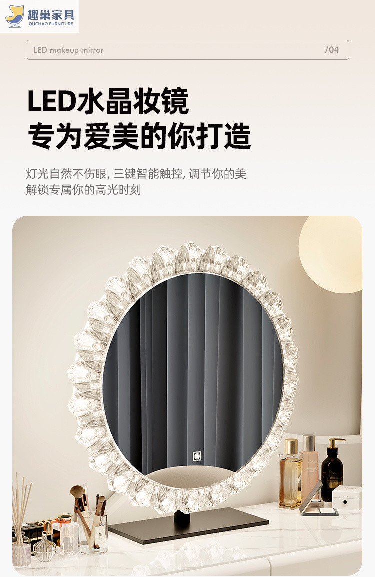 82cm 테이블 + LED 크리스탈 화장거울 + 원형 의자 + 서랍장 4개
