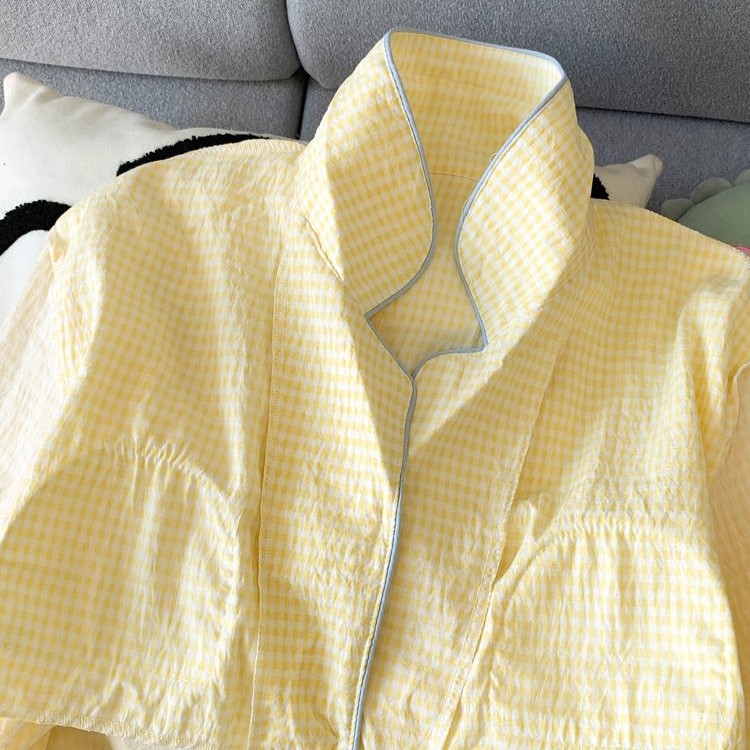 (가슴패드 없음) [윤두면] 노란색 체크무늬 파란색 테두리 긴소매+바지