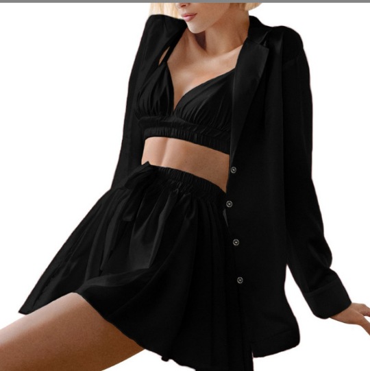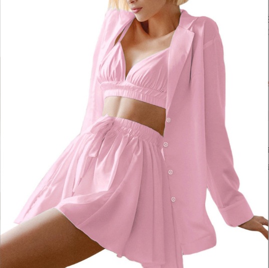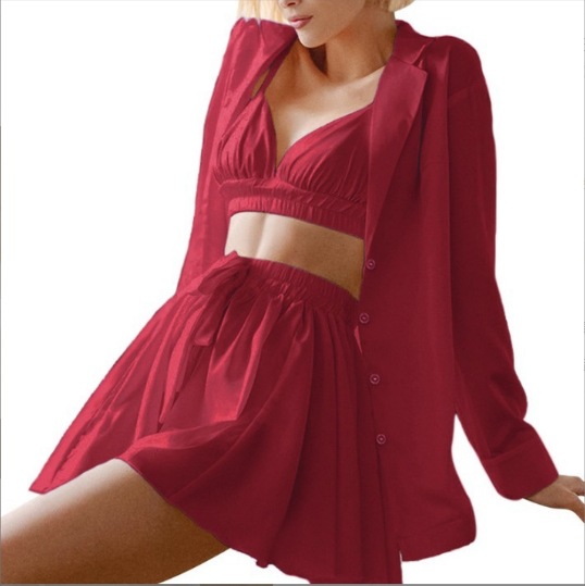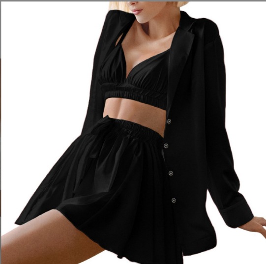 유럽과 미국의 대외 무역 여성의 섹시한 서스펜더 스커트 3 피스 실크 질감 긴팔 목욕 가운 봄과 여름 홈웨어