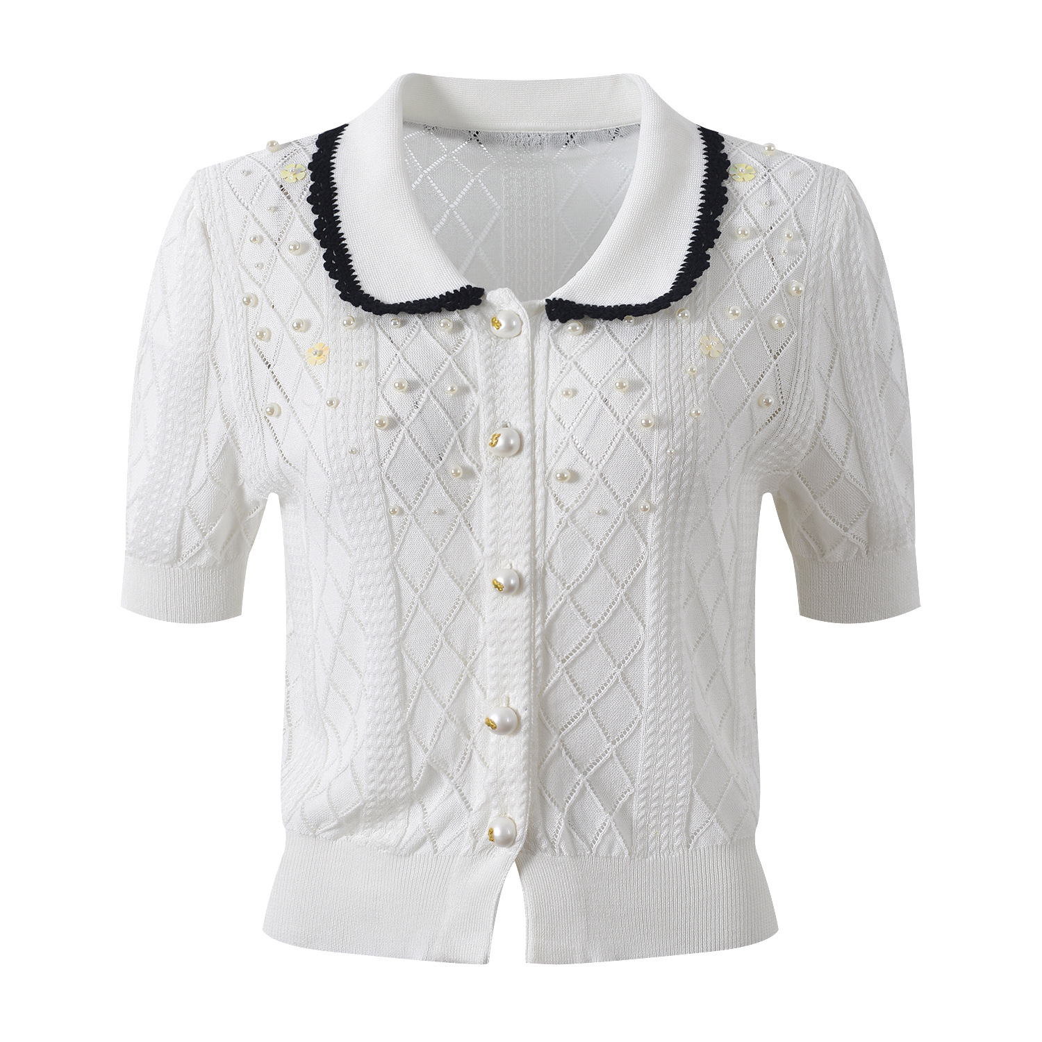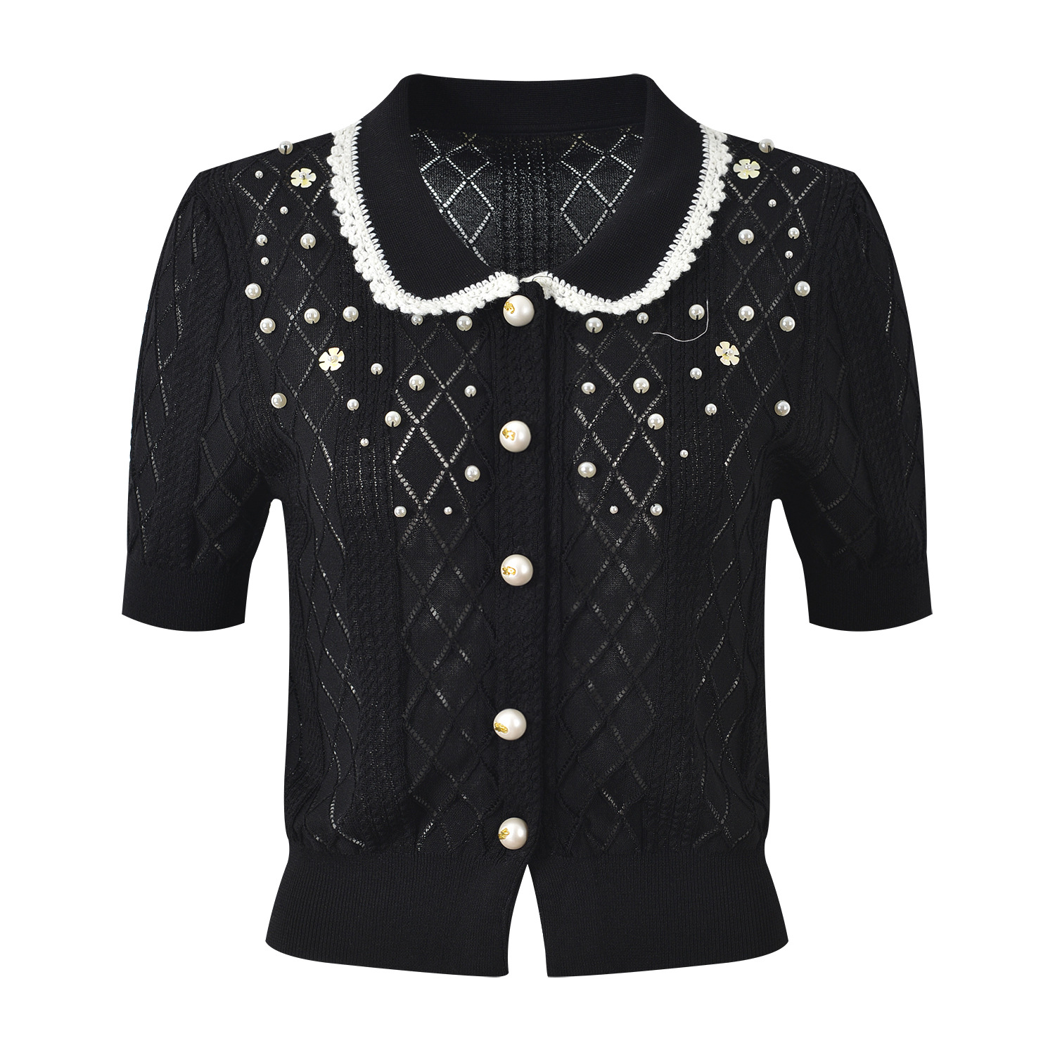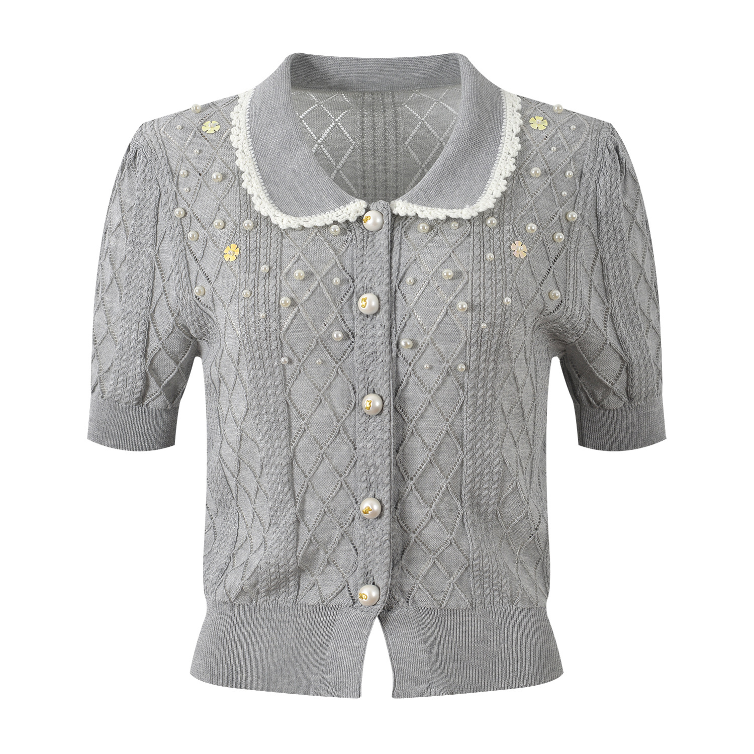 2025 여름 새로운 디자인 감각 끈 끈 구슬 달콤한 캐주얼 짧은 소매 짧은 니트 카디건 탑