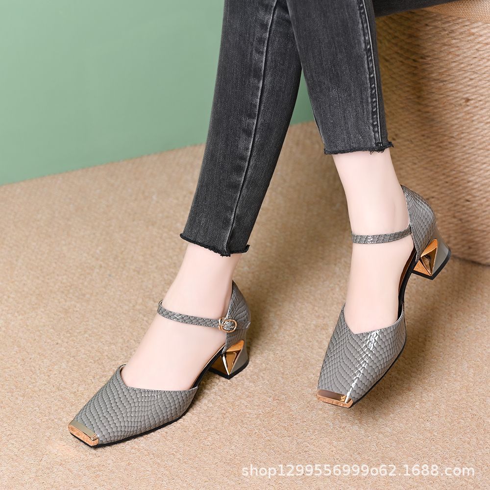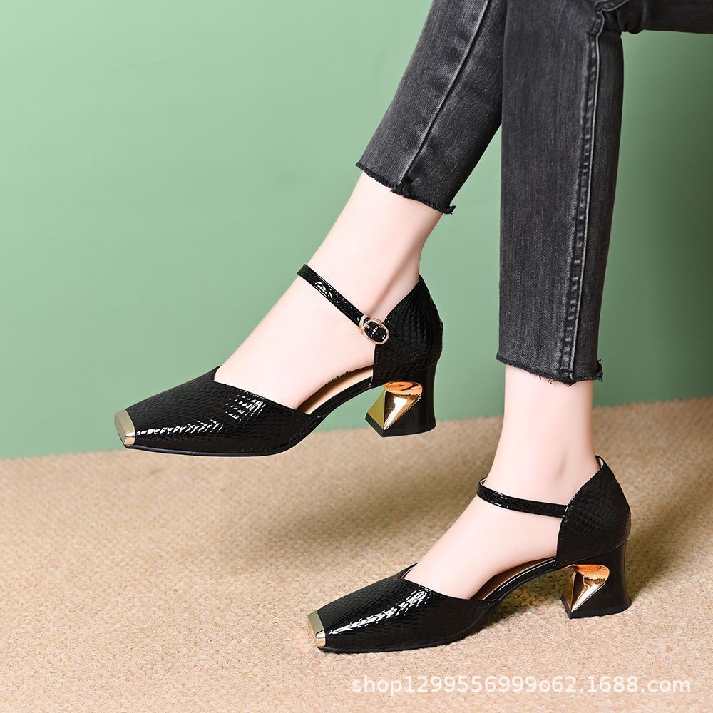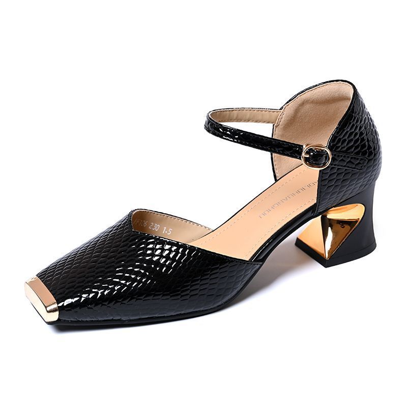여성을 위한 페이턴트 가죽 메탈 스퀘어 토 펌프스 샌들, 봄 여름 프렌치 스네이크 패턴, 패셔너블하고 다재다능한 두꺼운 굽의 작은 가죽 신발