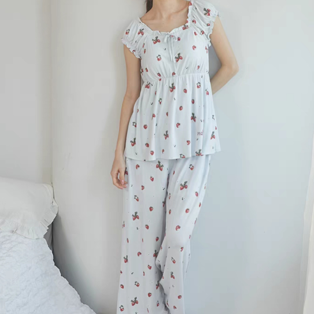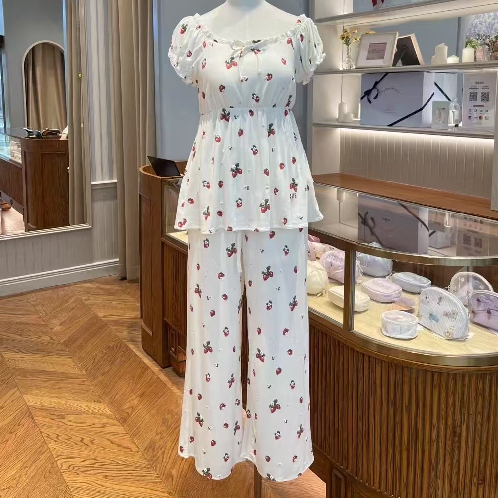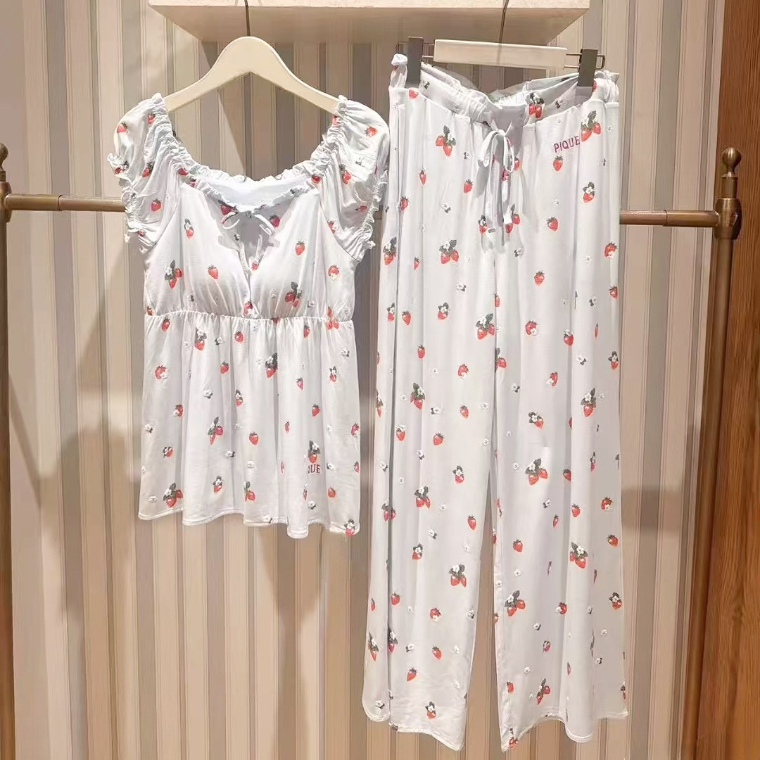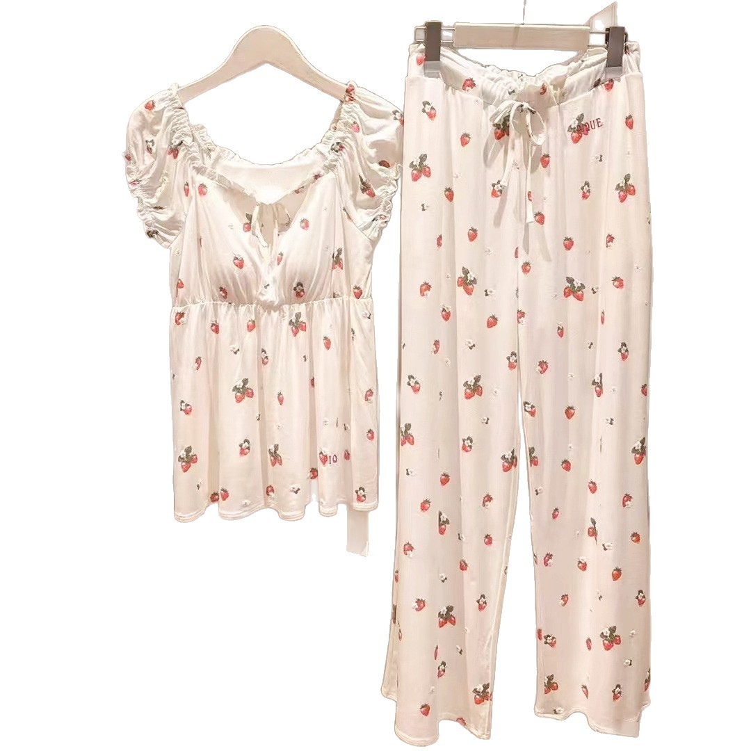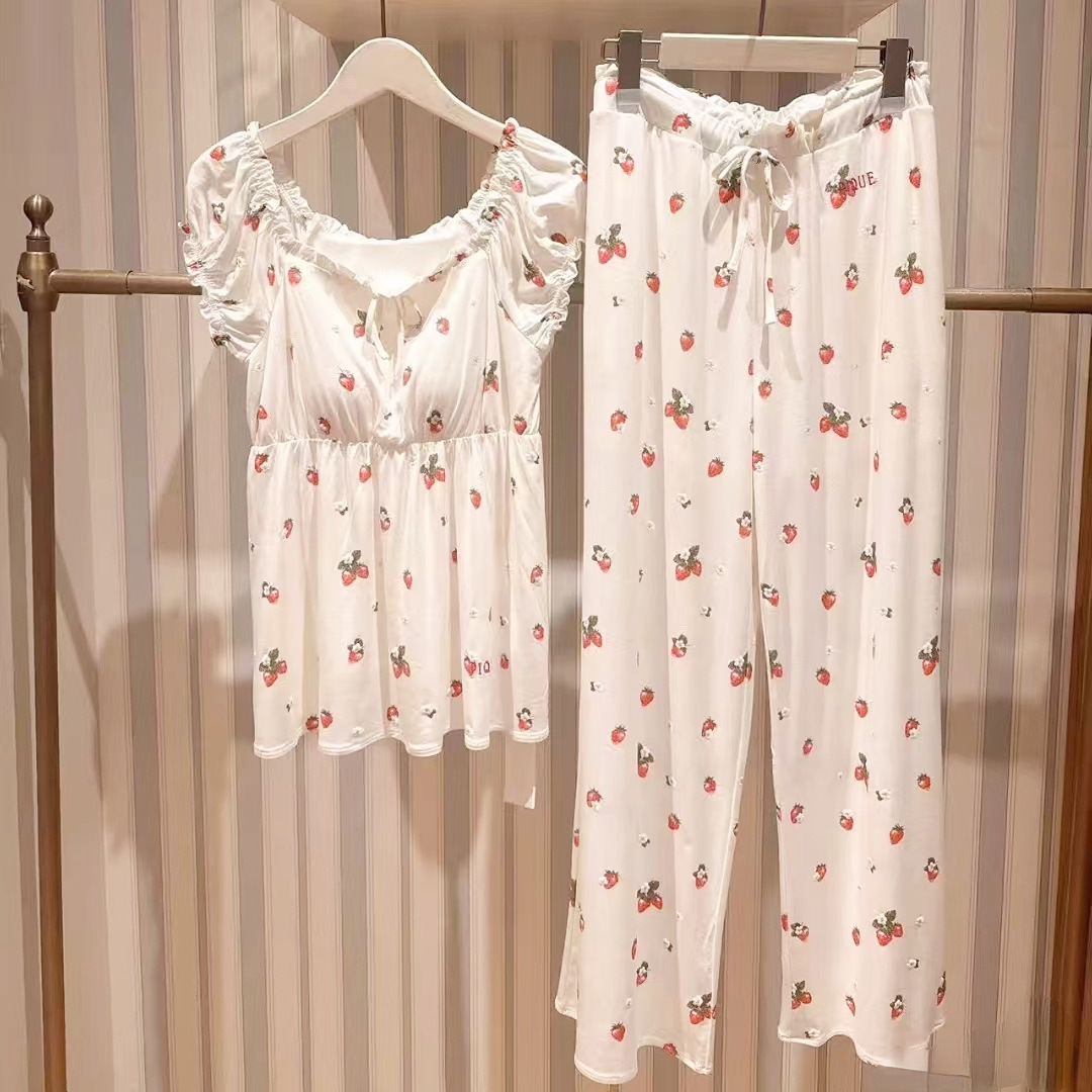 25 번째 소프트 풀 프린트 만화 달콤한 딸기 반팔 바지, 가슴 패드 잠옷 홈 의류 세트