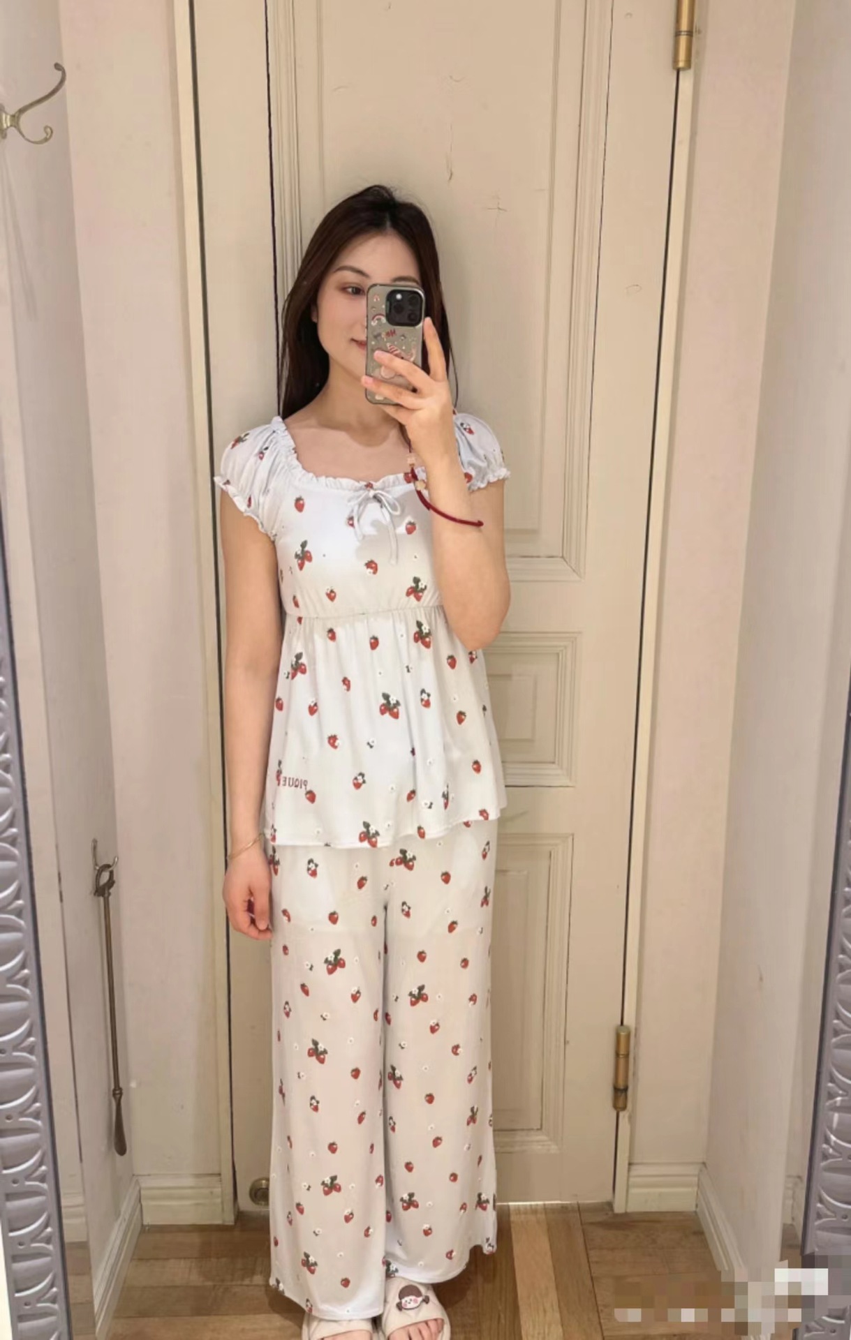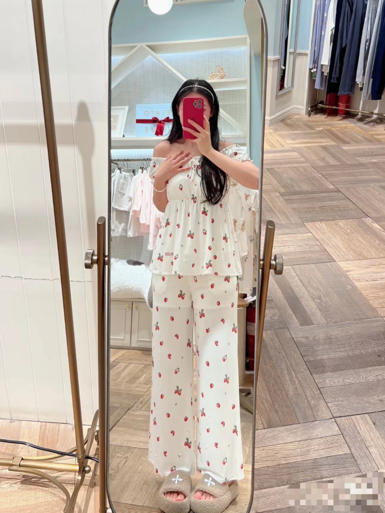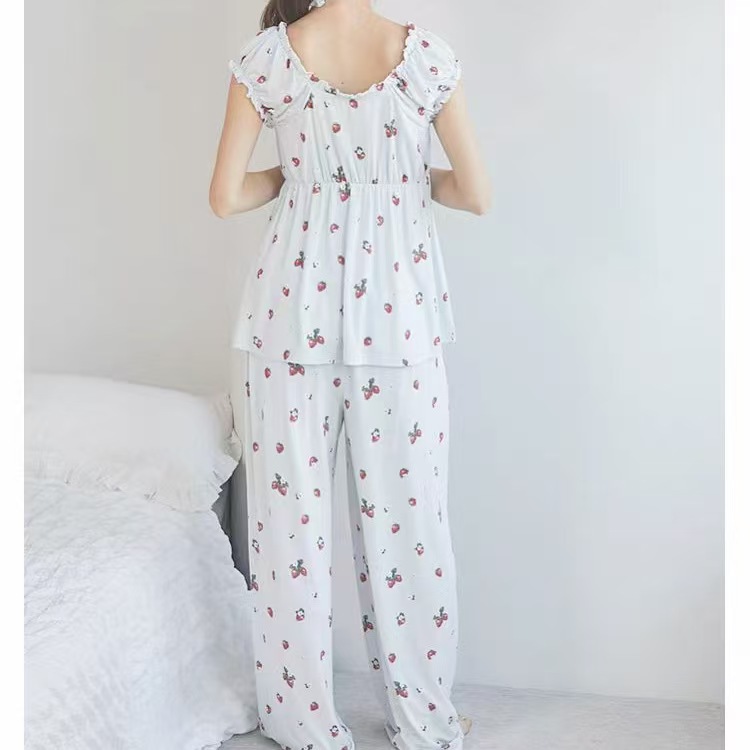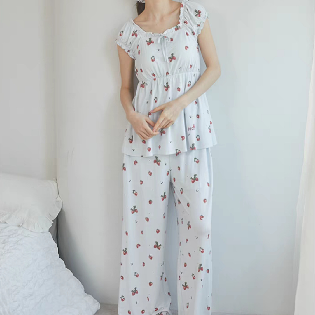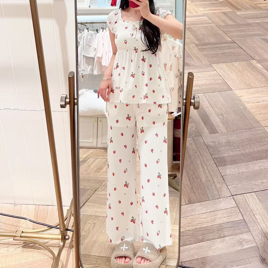 25 번째 소프트 풀 프린트 만화 달콤한 딸기 반팔 바지, 가슴 패드 잠옷 홈 의류 세트