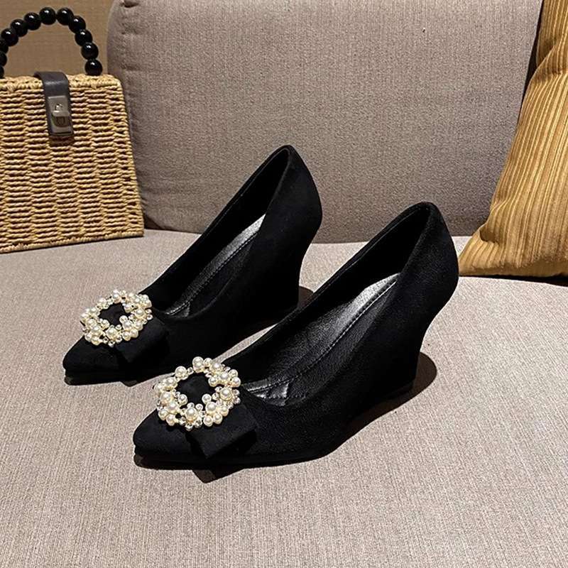 웨지 패션 싱글 레이어 신발 여성의 2025 봄 새로운 도착 패션 라인스톤 포인팅 얕은 입 부드러운 밑바닥 여성을위한 피곤하지 않은 하이힐