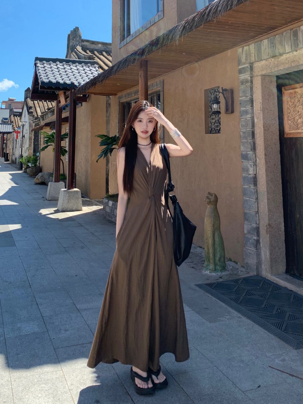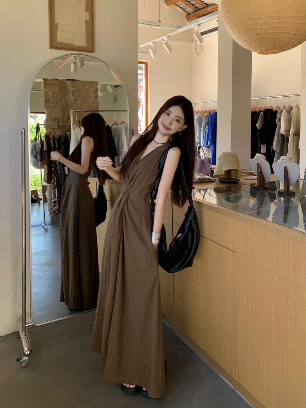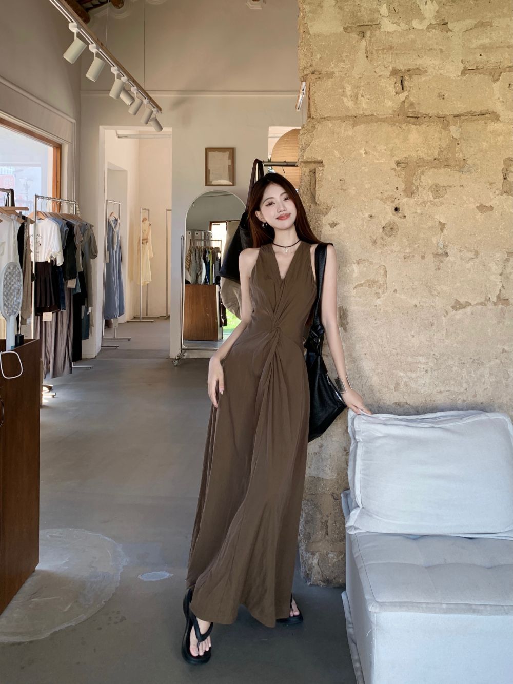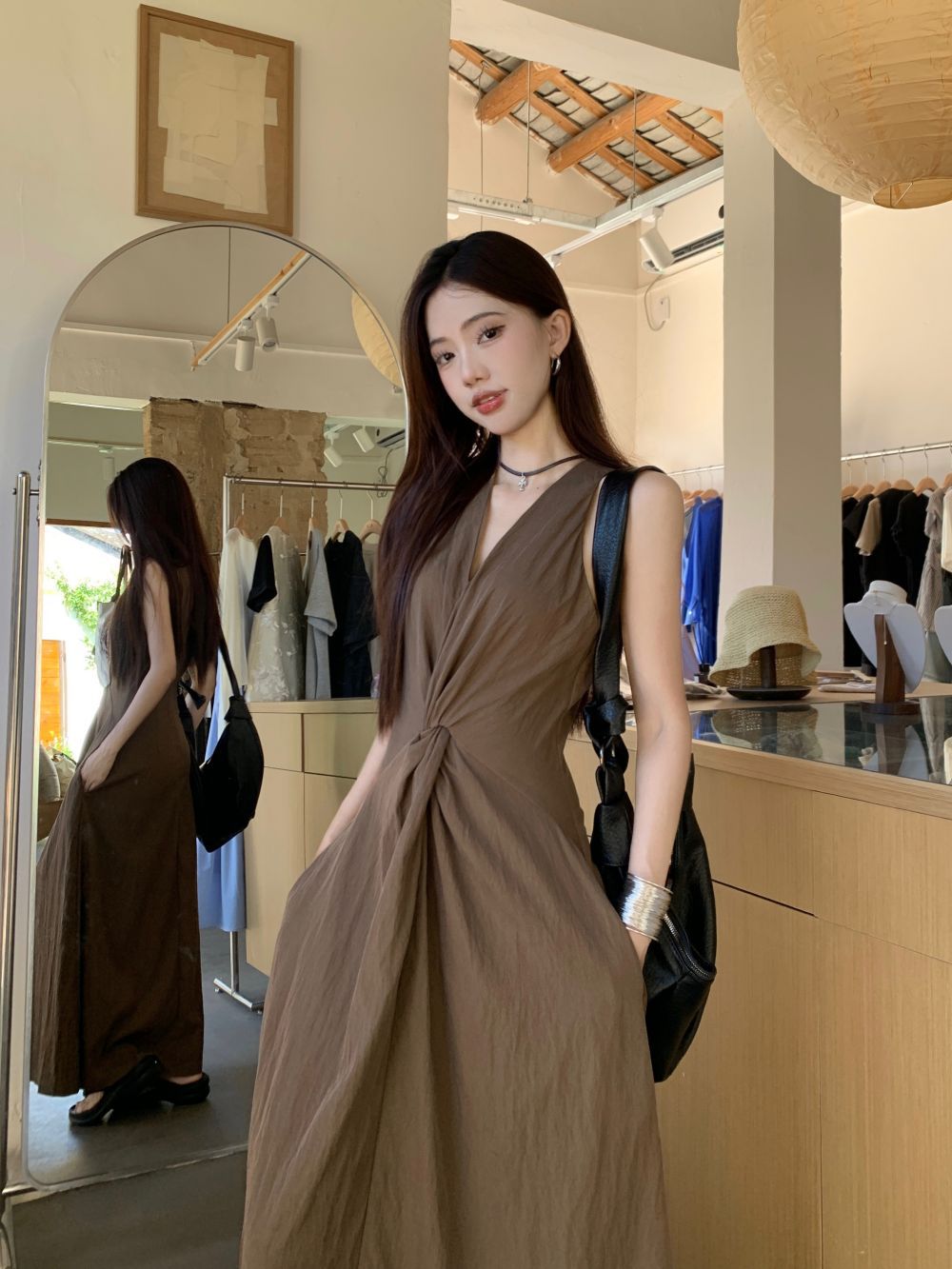여성을위한 우아한 브라운 트위스트 민소매 조끼 드레스 여름 디자인 롱 스커트 v 넥 허리 슬리밍 a 라인 스커트